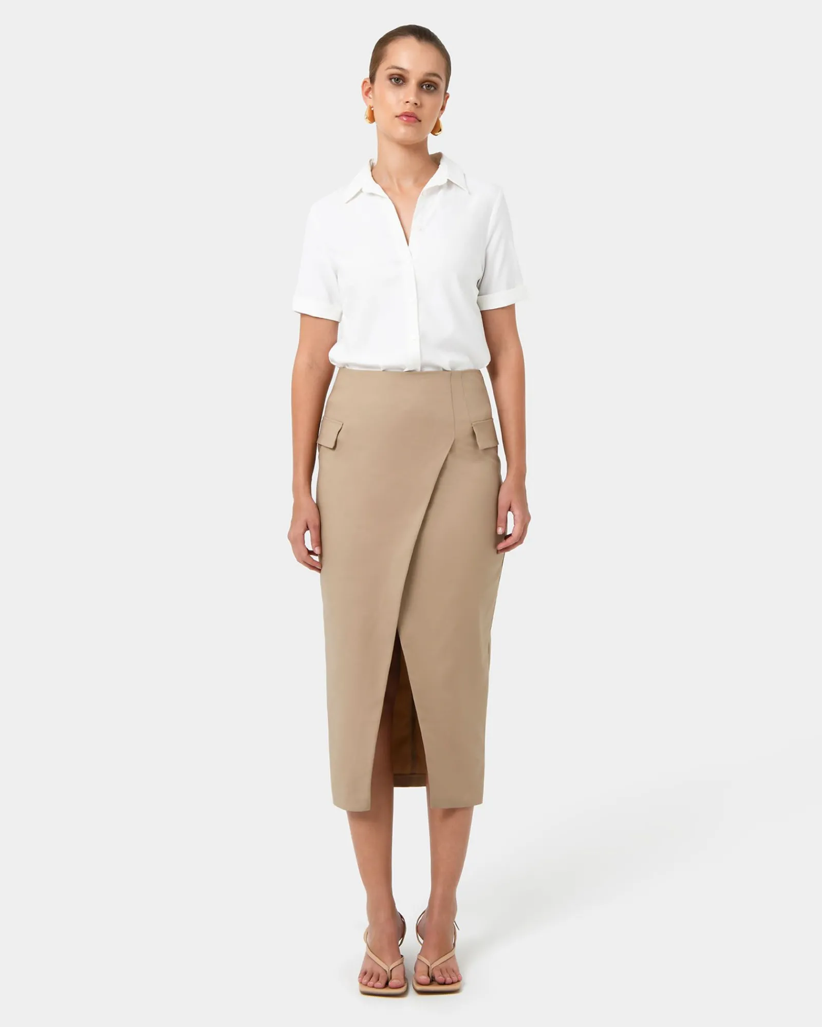 The Abby Asymmetric Tailored Skirt is designed for a structured yet comfortable fit. Made from a cotton blend fabric, it features a unique asymmetric hemline, tailored fit, and a concealed back zip for a clean look. Style it with a blouse and heels for a polished outfit.