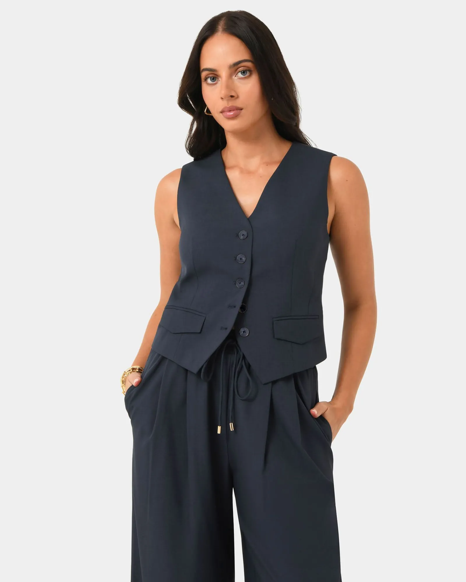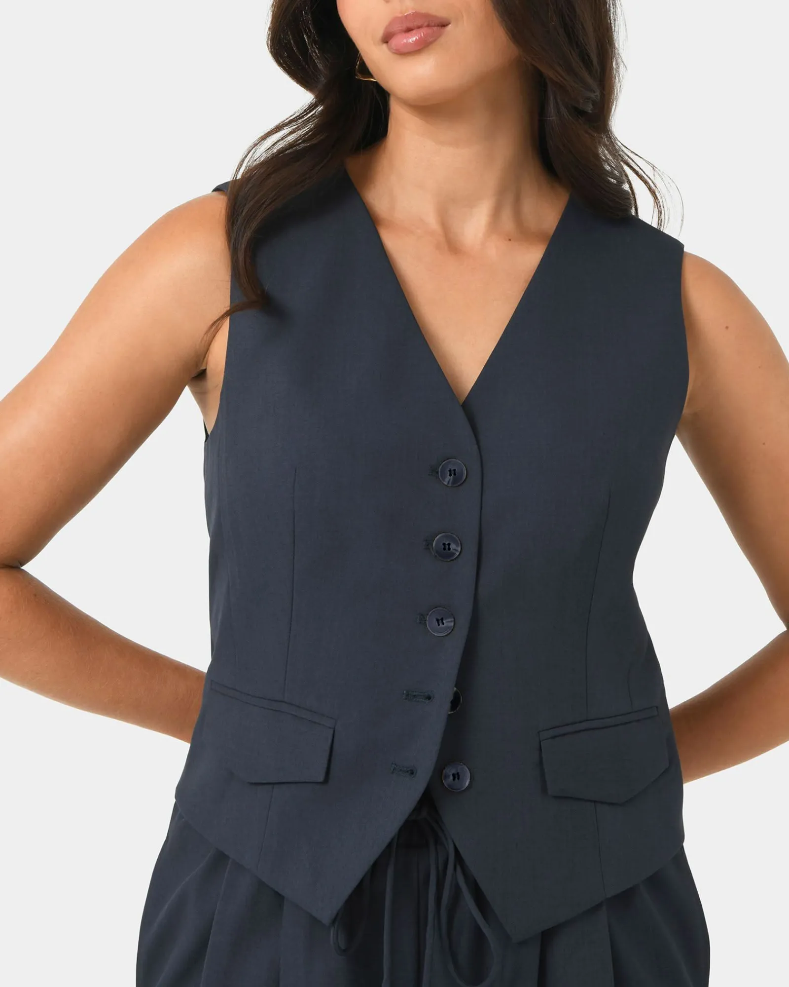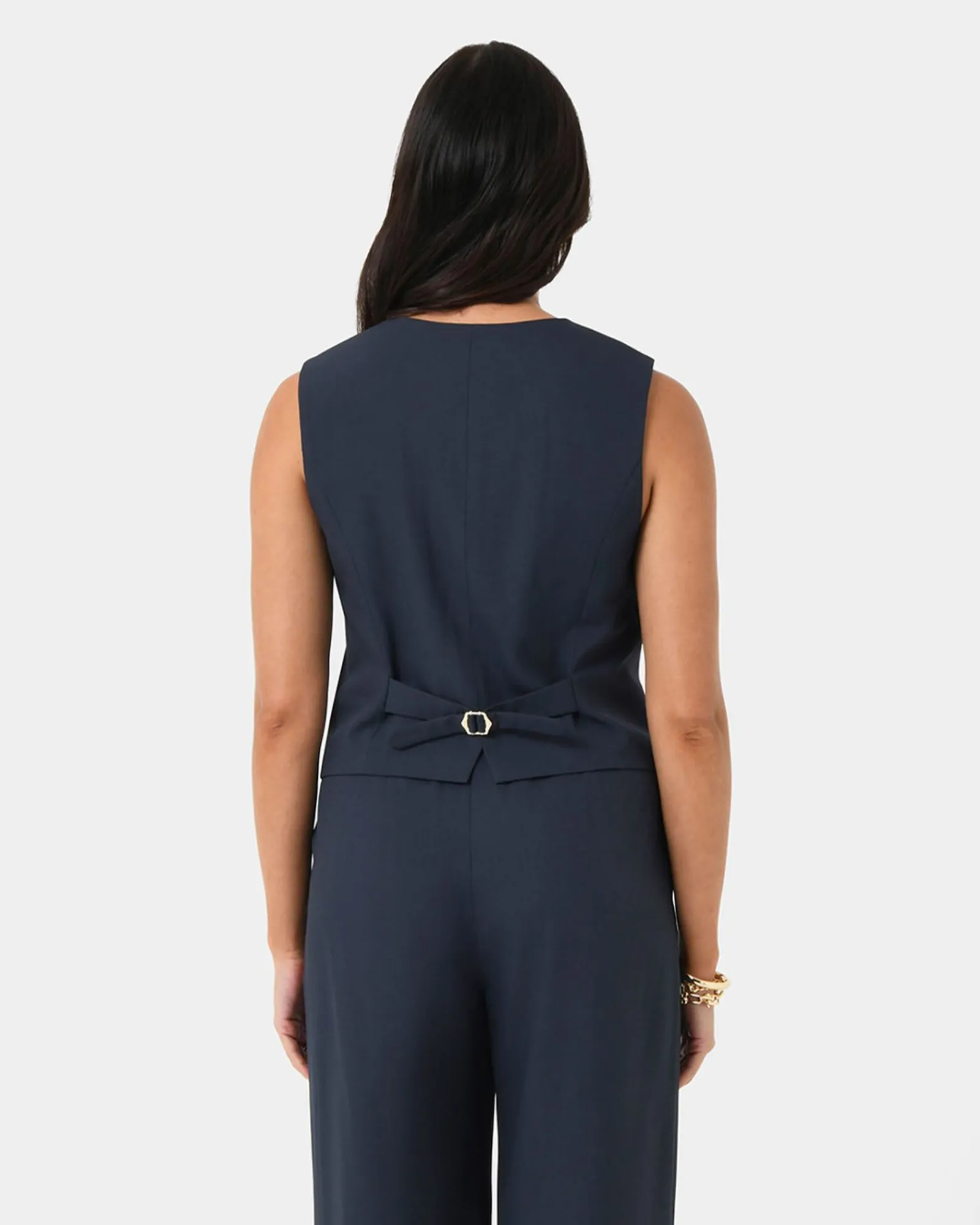 The Abel Tailored Vest balances structure and comfort with a tailored fit, shaped by two darts. An adjustable back tab and notch allow for a custom fit, while the front faux pockets add a refining touch. Worn alone or layered, the Abel adapts to your style, making it a standout piece.