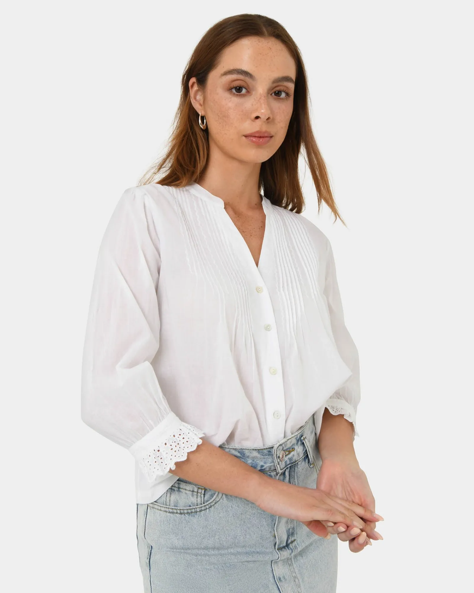 Delicate embroidery meets timeless design in the Akira V-Neck Embroidery Blouse. Crafted in breathable 100% cotton, this blouse brings a touch of elegance to your everyday wardrobe. Perfect for pairing with anything from denim to tailored trousers.