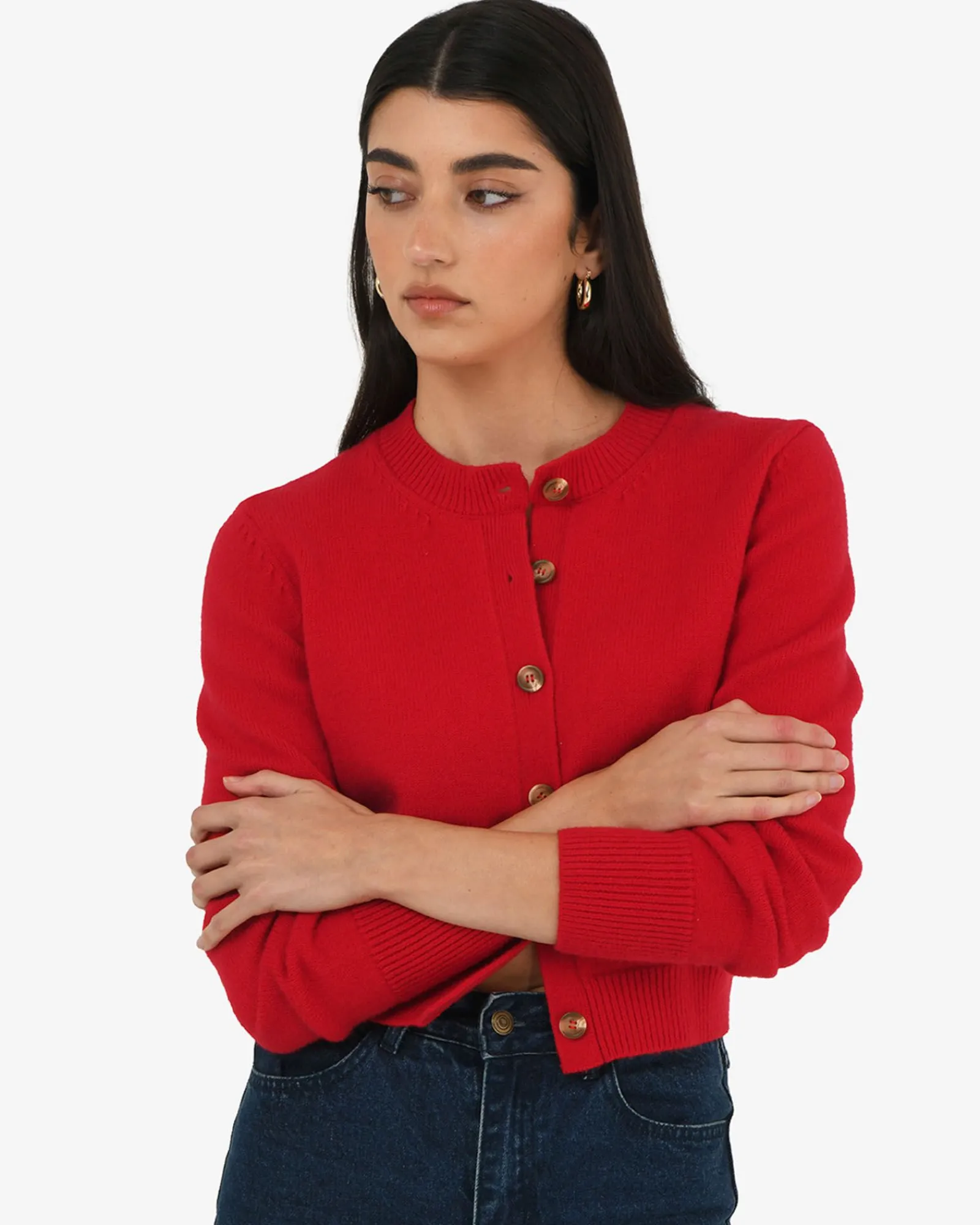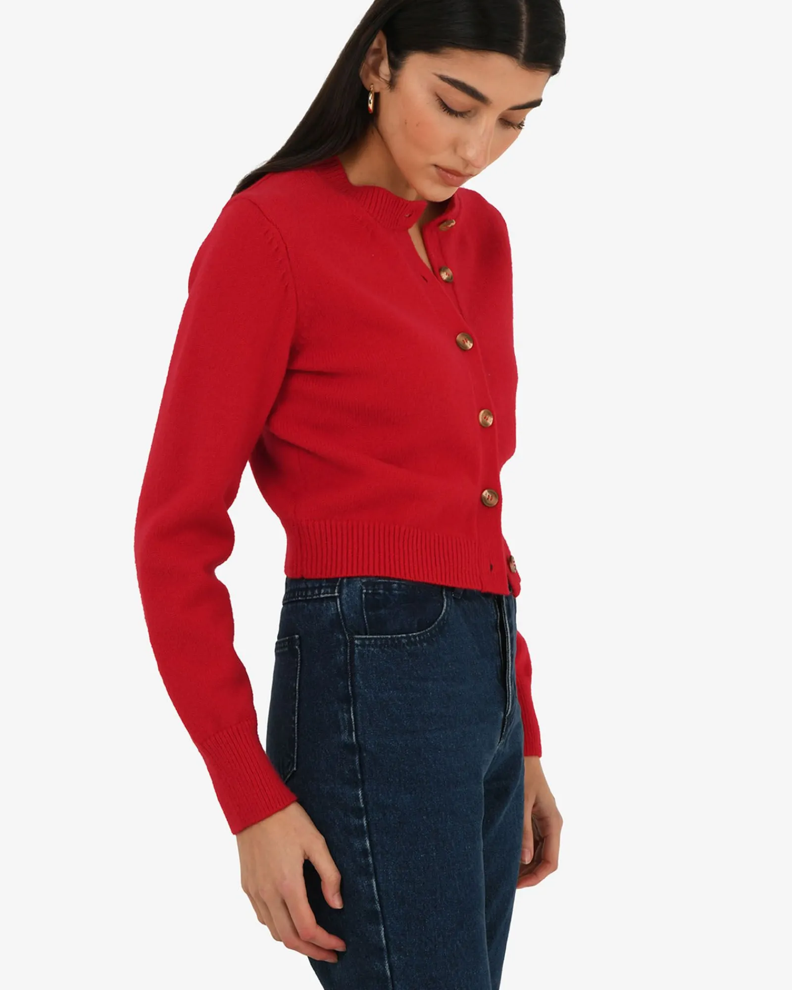 Introducing the Alina Wool Blend Cardigan – a stylish piece perfect for pairing with various bottoms. It features a button-down front with long sleeves and ribbed edges. It is cropped in length and is suitable for dressing up or down, an essential addition to your wardrobe this season.