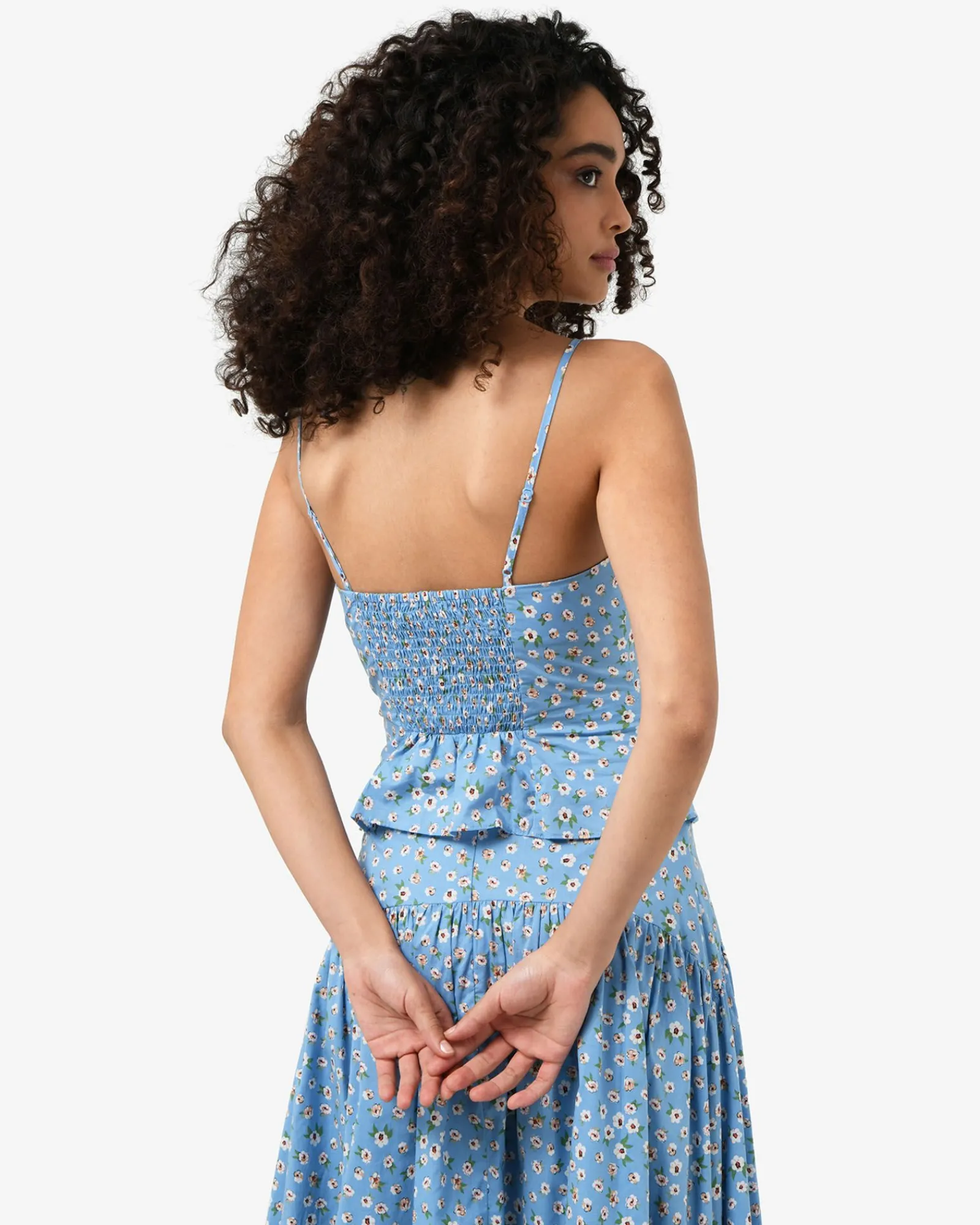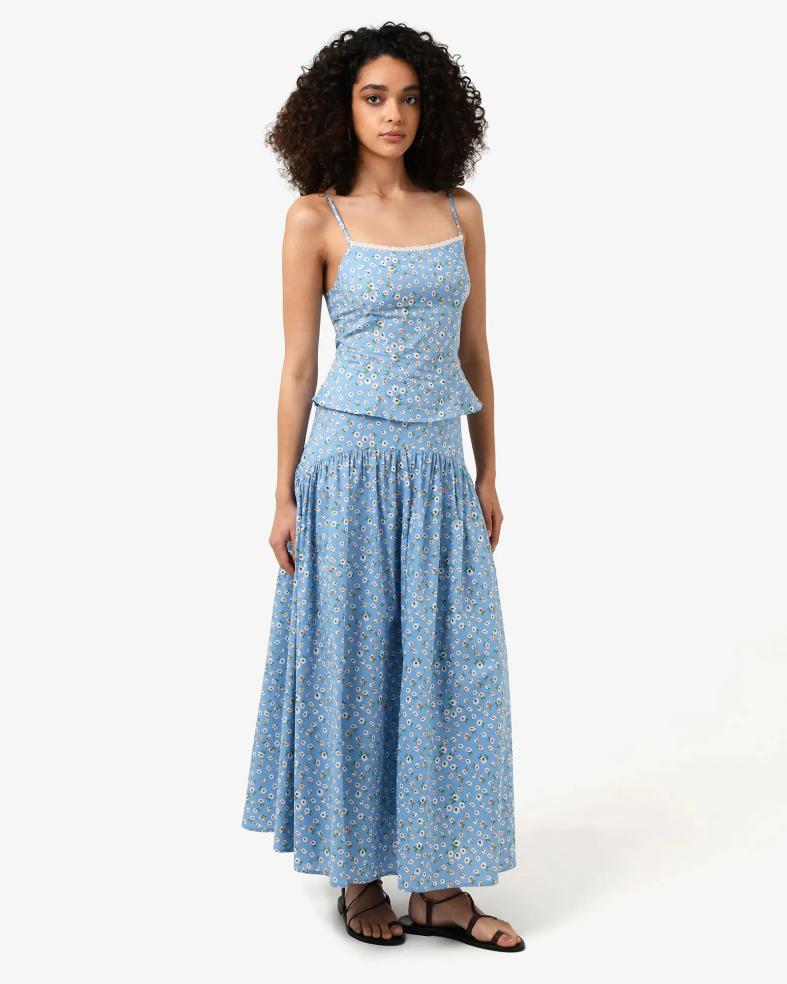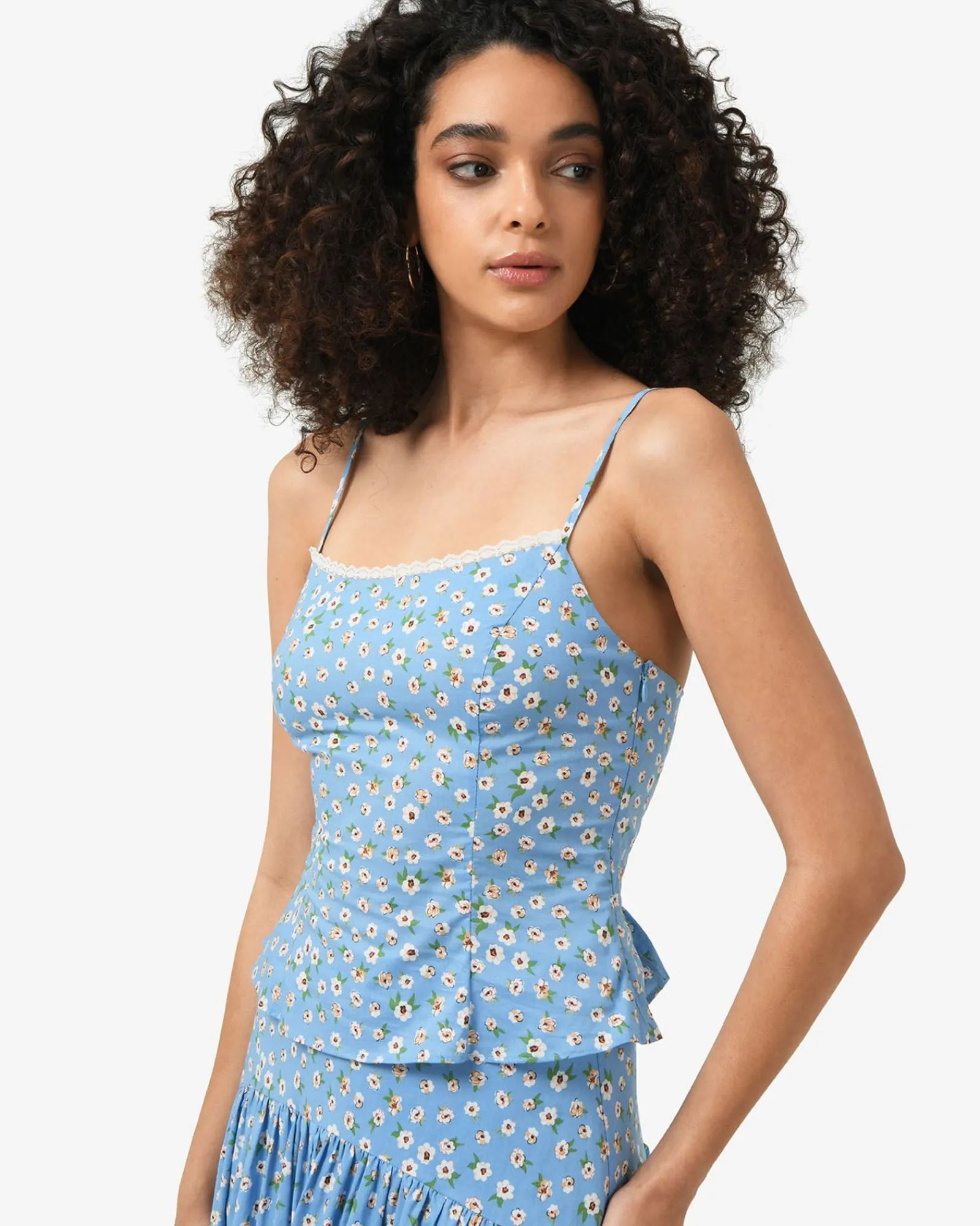 The Alisa Cami Floral Top features a fitted bodice with adjustable spaghetti straps. Made from 100% cotton, this top is designed with a flute hem, delicate lace trim and a ditzy floral print. Pairs it with the matching Alisa Gathered Skirt or style it with denim and mini skirts.