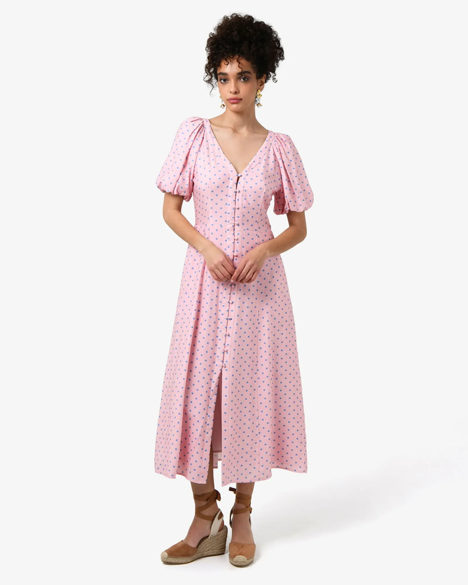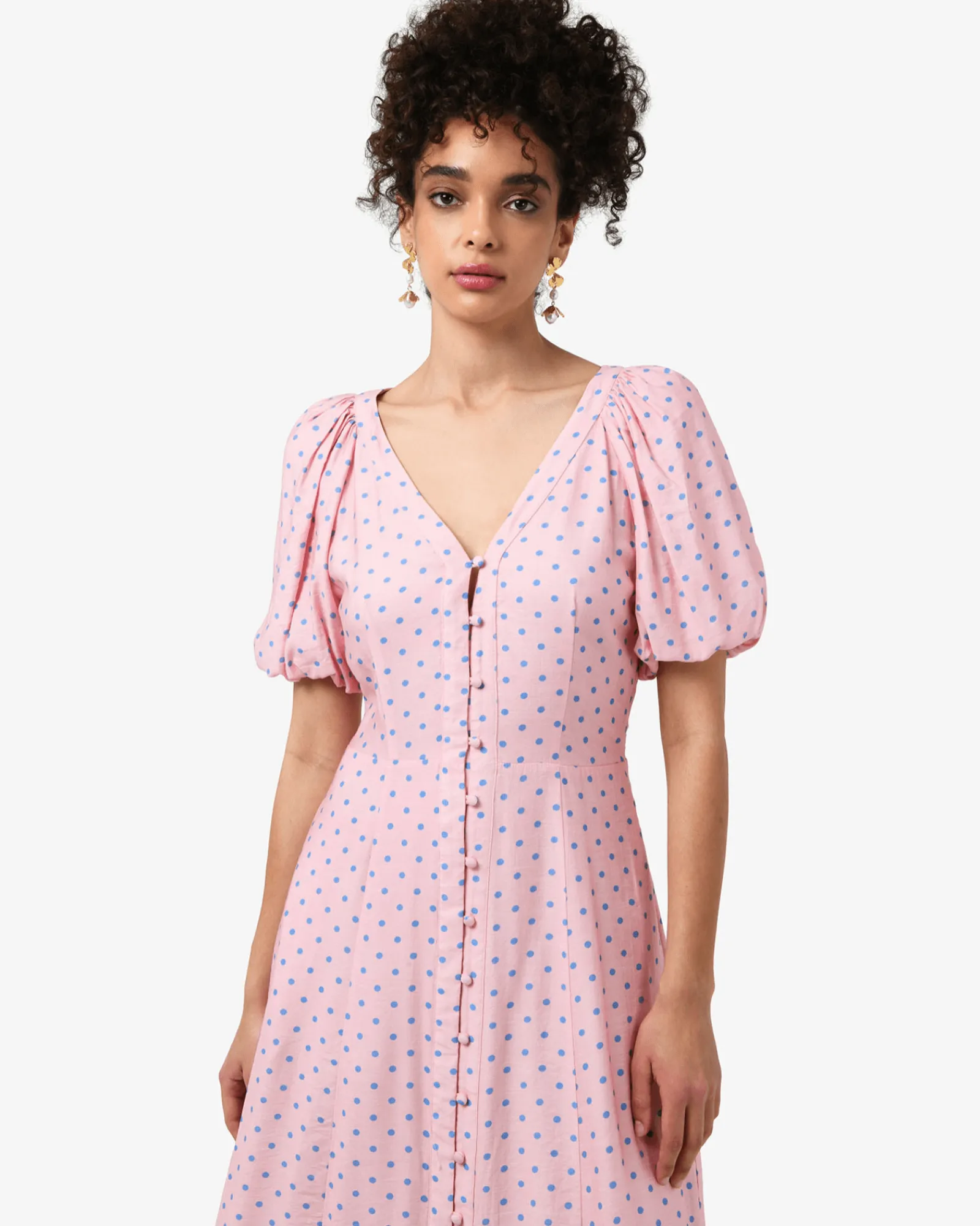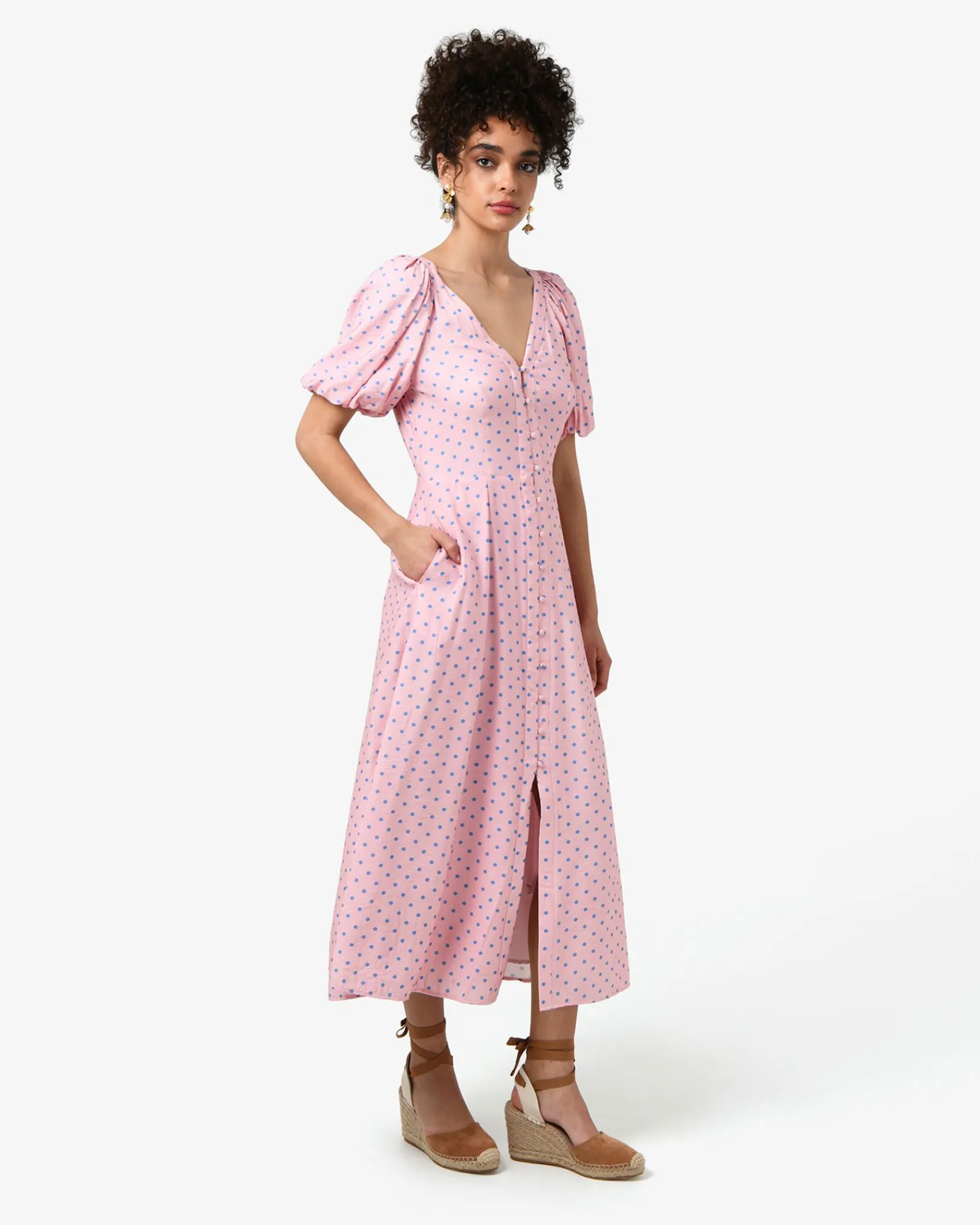 The Almeria Polka Dot Dress is a Spring piece that features a playful polka dot pattern, a V-neckline, puff short sleeves and functional side pockets. Fully lined and cut to a midi length, it can be accessorised with statement accessories to complete the look.