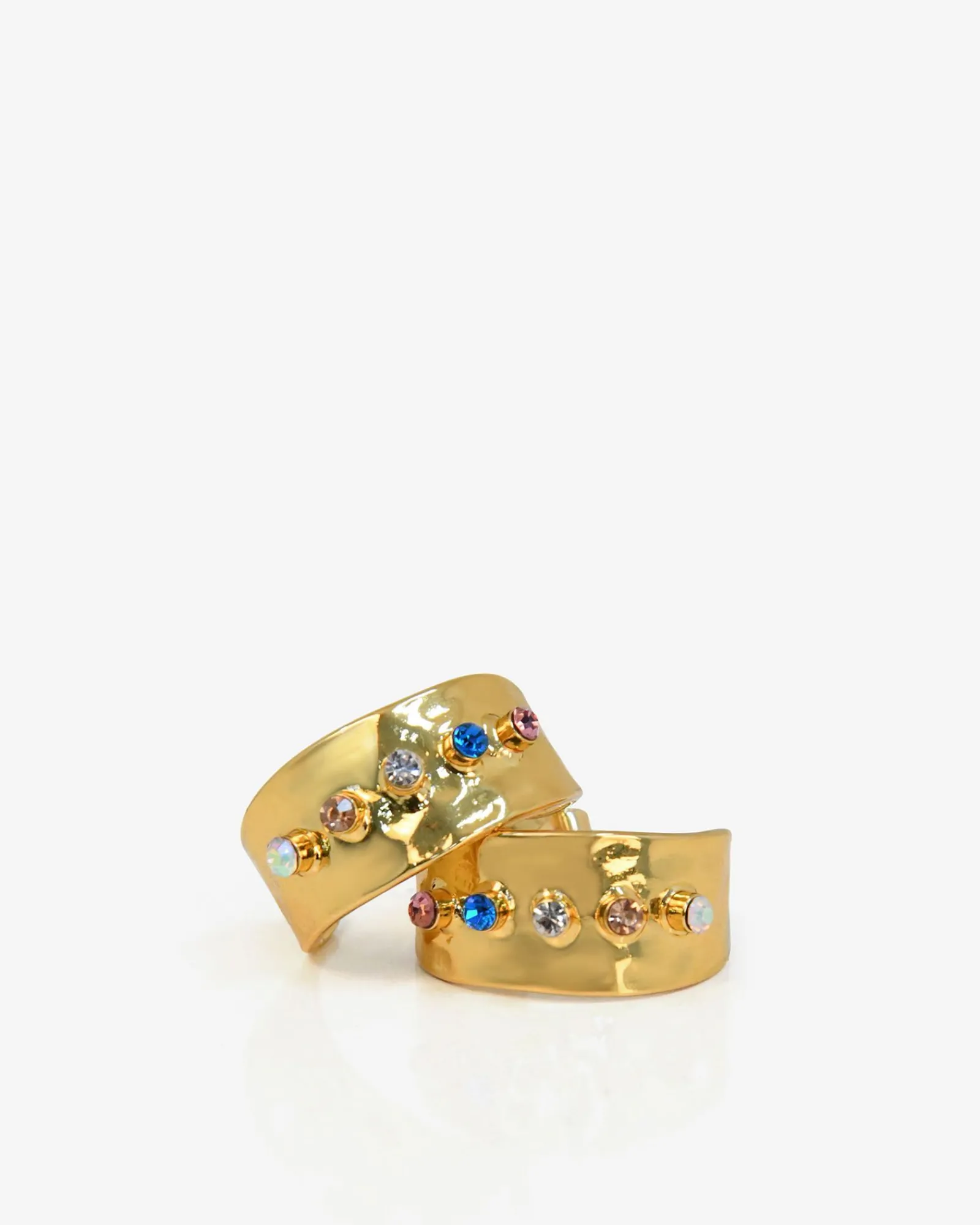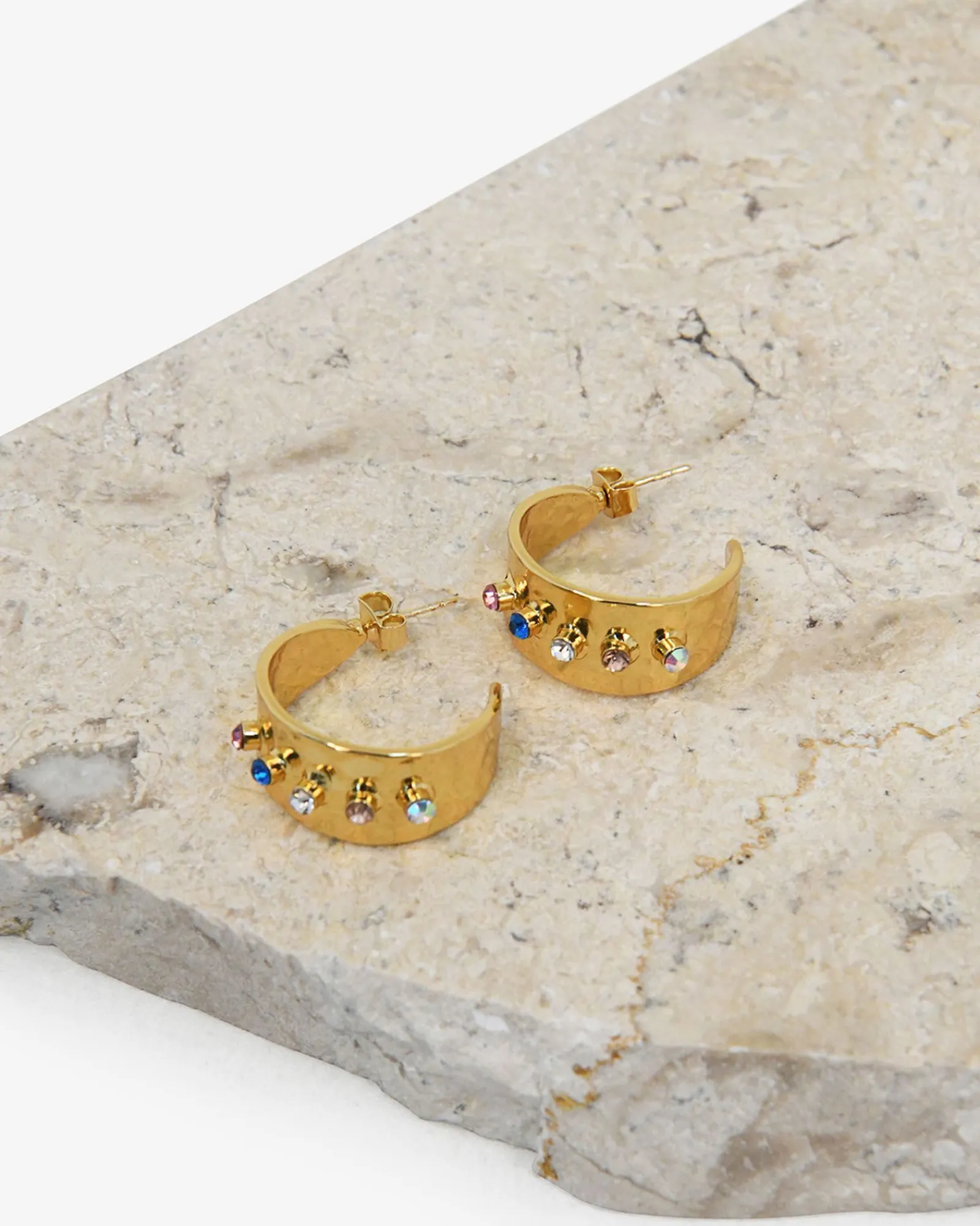 Brighten your look with the Amaris Gold Hoop Earrings. A modern twist on classic hoops. Crafted in 16k gold plating with multi-coloured stones, these half-hoops add playful sparkle to both casual and dressy outfits. Hypoallergenic, and easy to wear, they’re the perfect everyday statement earrings.