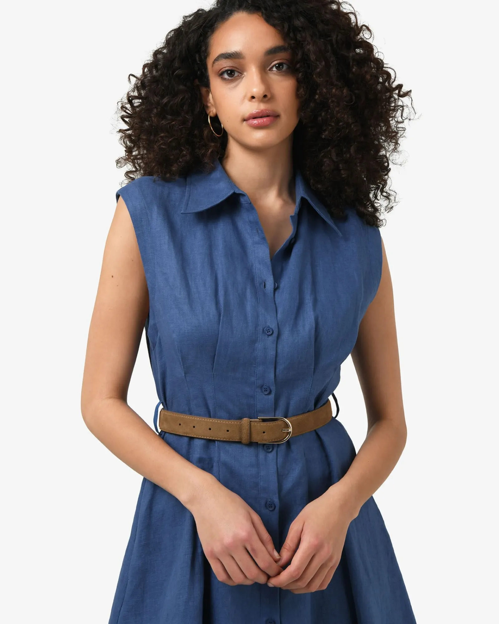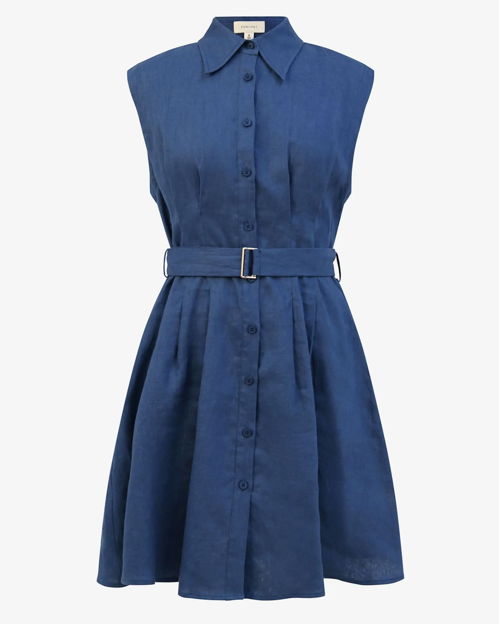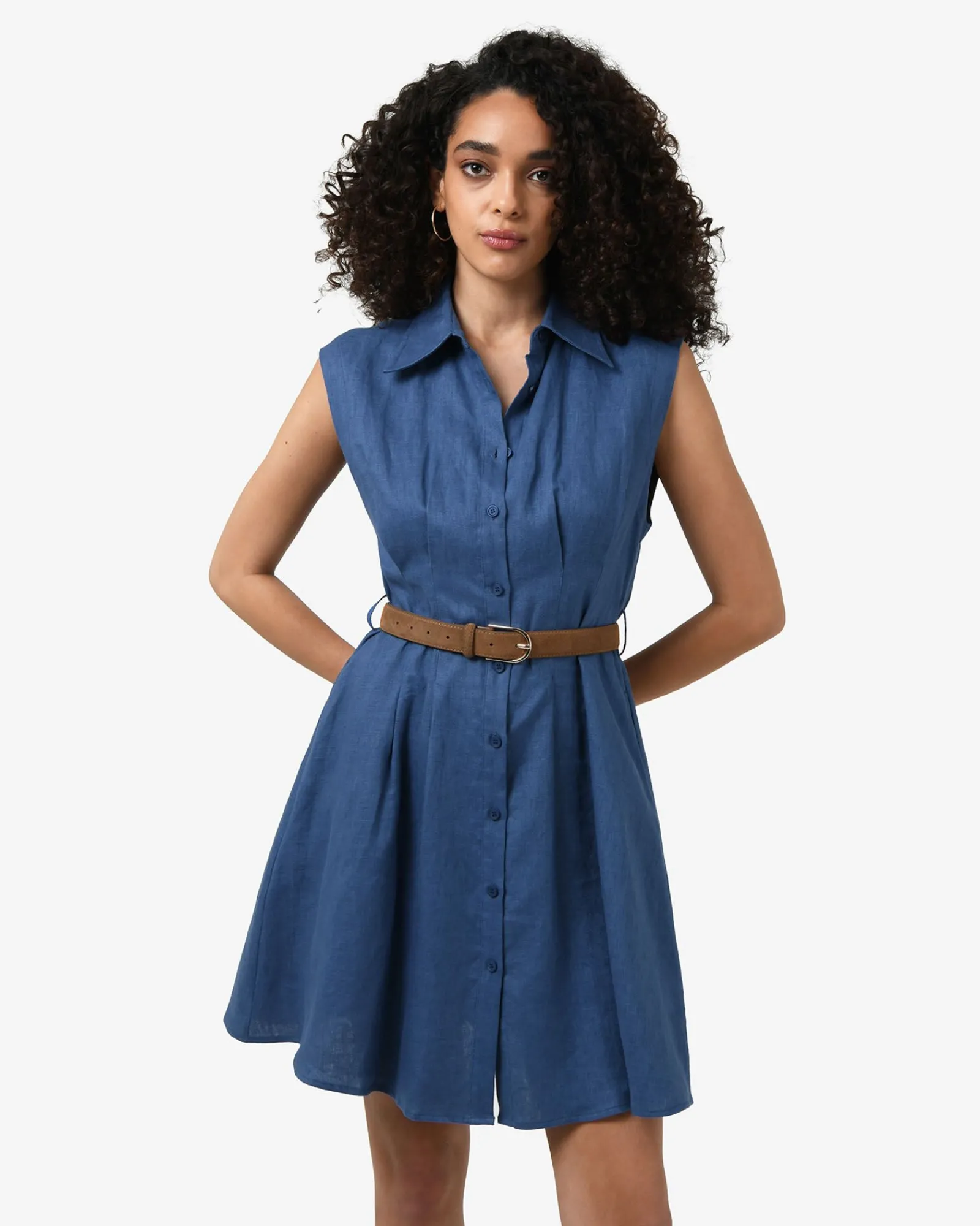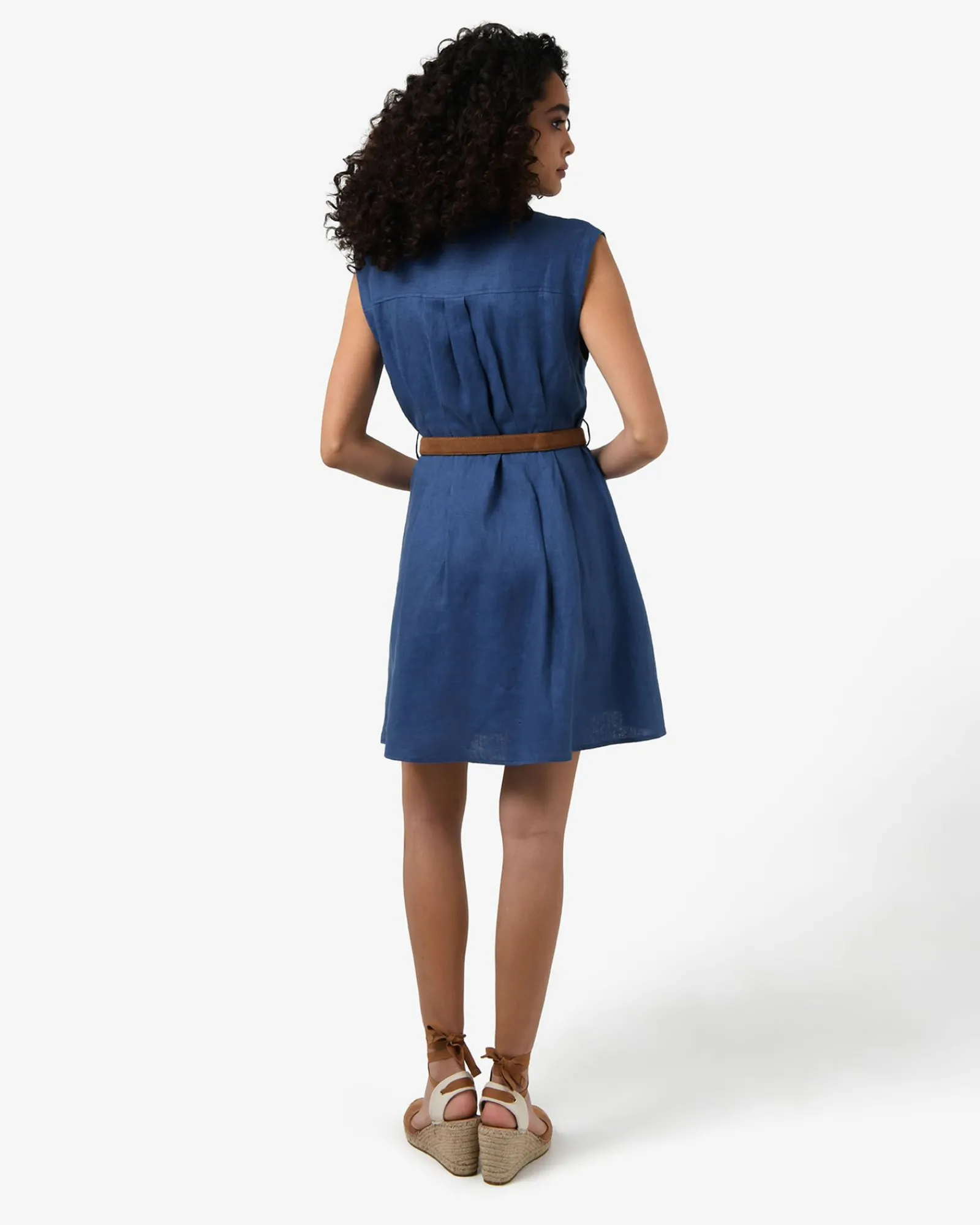 Made from 100% linen, the Ami Linen Mini Beach Dress is a sleeveless mini dress that features a pointed collar, button-down front, and pleated waist detailing. Designed with an A-line silhouette, it comes with a removable self-tie belt with gold-tone buckle. Available in two colours, with Ivory in a more semi-sheer finish, it can be worn as a casual dress or as a beach wear cover-up.