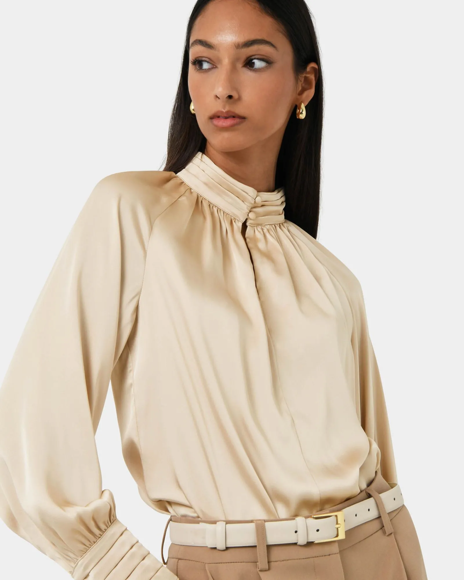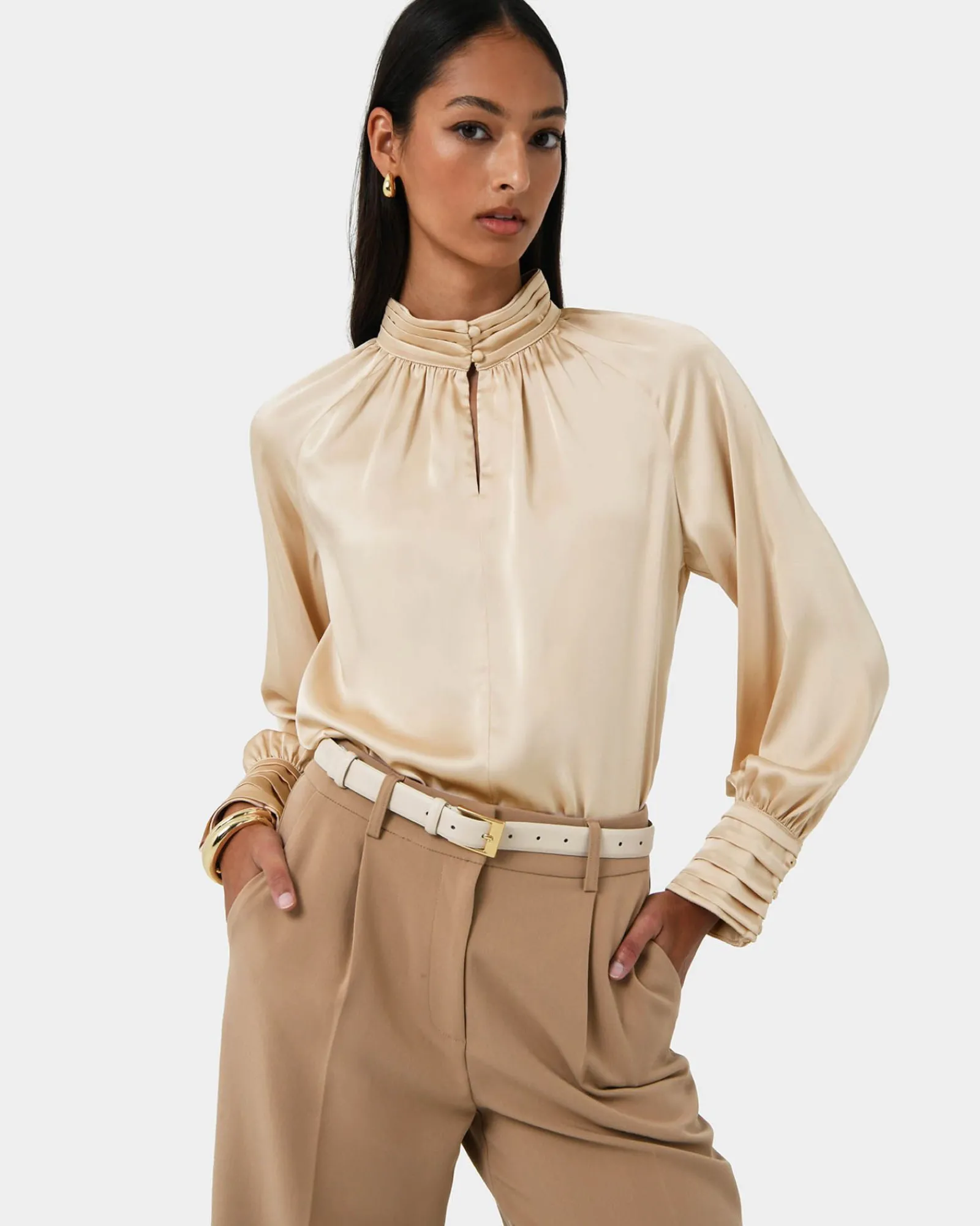Elevate your wardrobe with this chic piece – the Anna Pleated Satin Blouse. Featuring a mock neckline with delicate pleating details, it is made from luxurious satin for a touch of elegance. It is designed with a front keyhole and loop button closure, while the soft gathering and balloon sleeves add a feminine, structured look. It is lightweight, making it ideal for both casual and formal occasions.