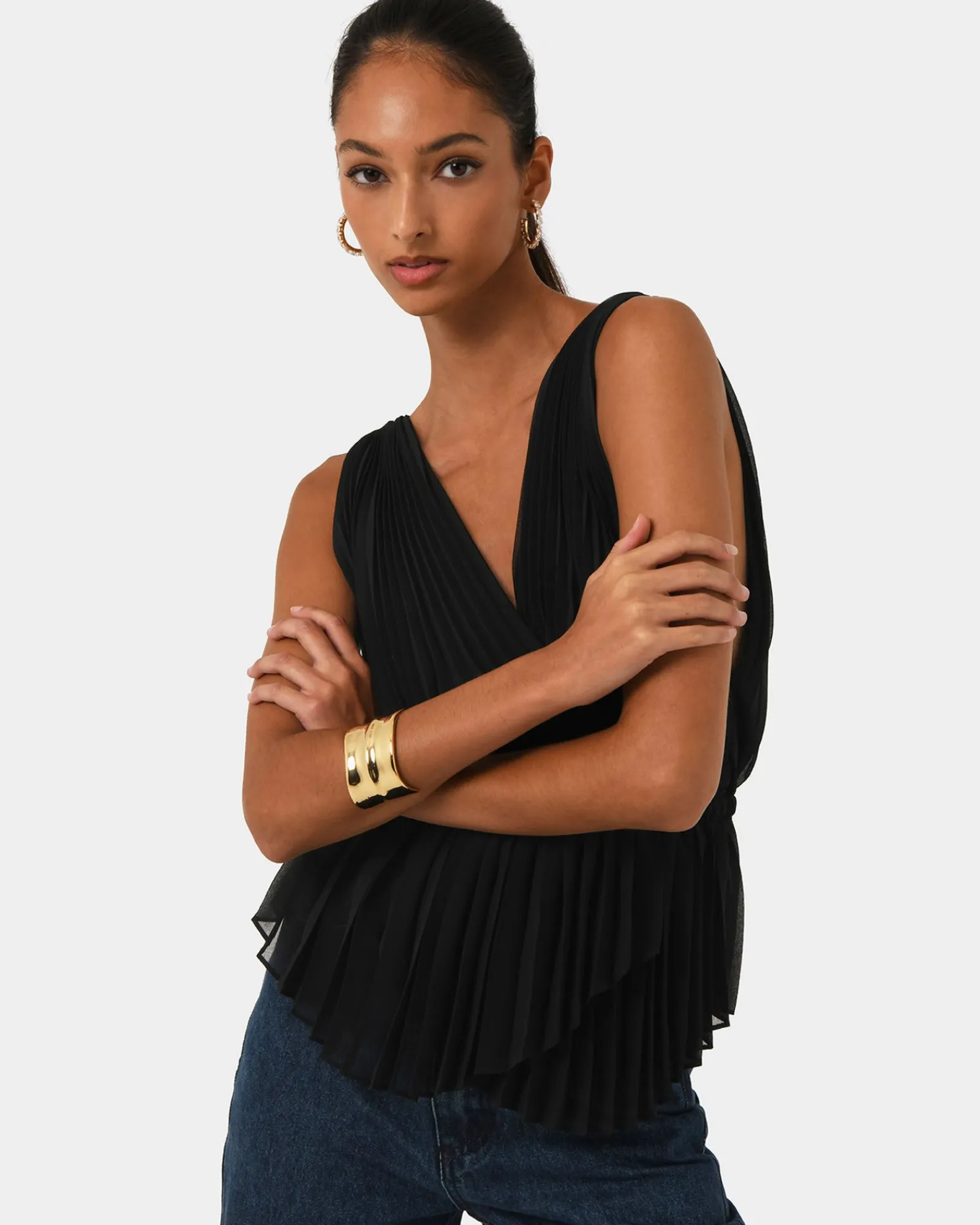 The Arina Pleated Top is a stylish piece with a stunning array of pleats that create a beautiful statement piece. The cross front v-neckline and wrap front design is the focal point of the top while it highlights its pleated texture. Pair it with skinny jeans or leggings for a casual look, or high-waisted skirts or trousers for a more formal occasion with statement jewellery.
