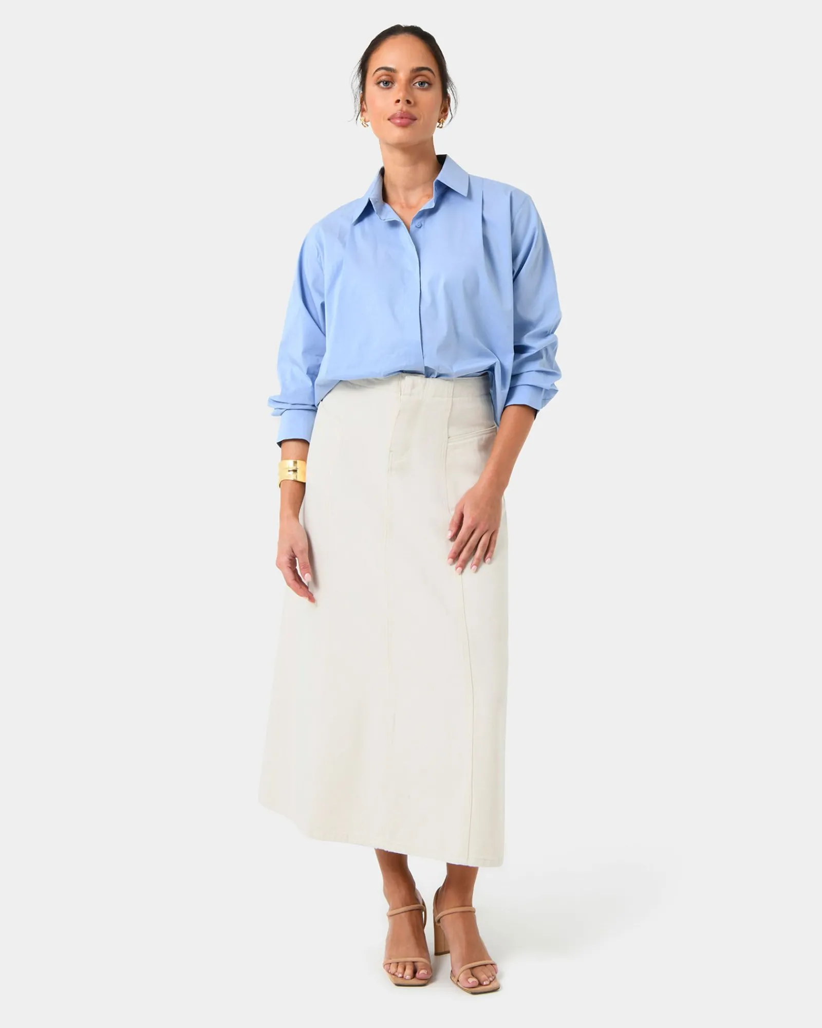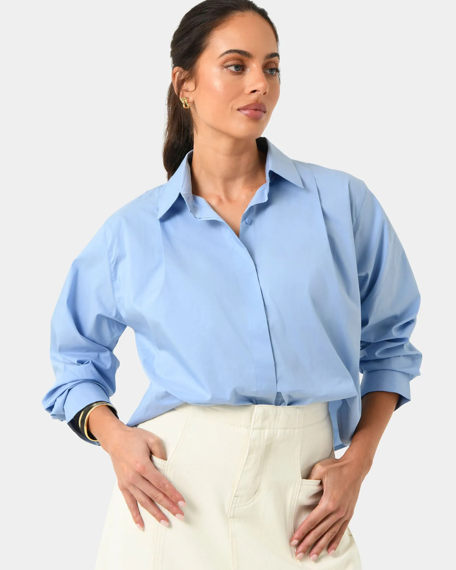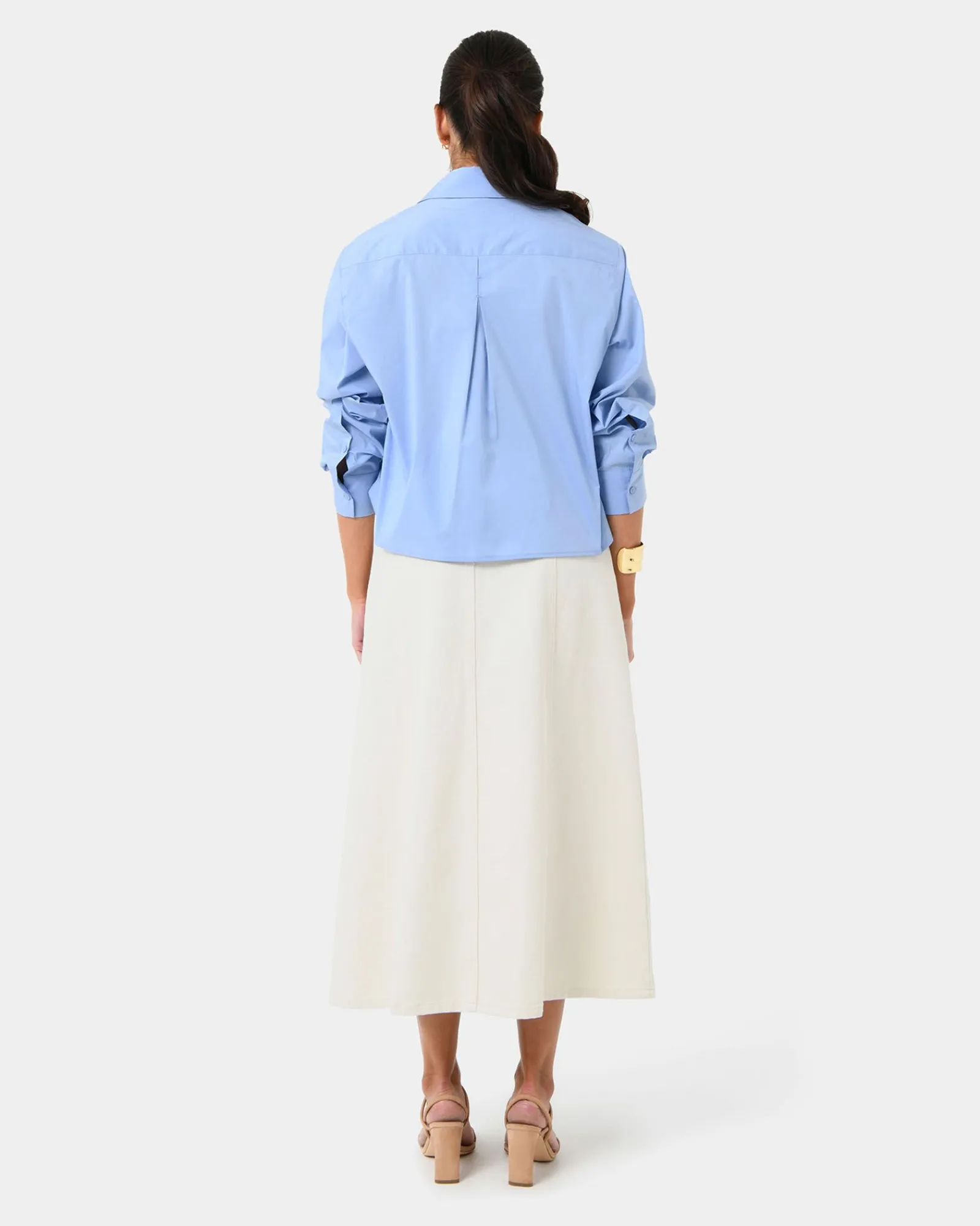 Introducing the Baire Pleated Crop Shirt, it is crafted from a lightweight cotton blend for comfortable wear. The relaxed-fit top features a cropped length and long sleeves, creating a versatile balance that makes it a staple for elevated casual styling.