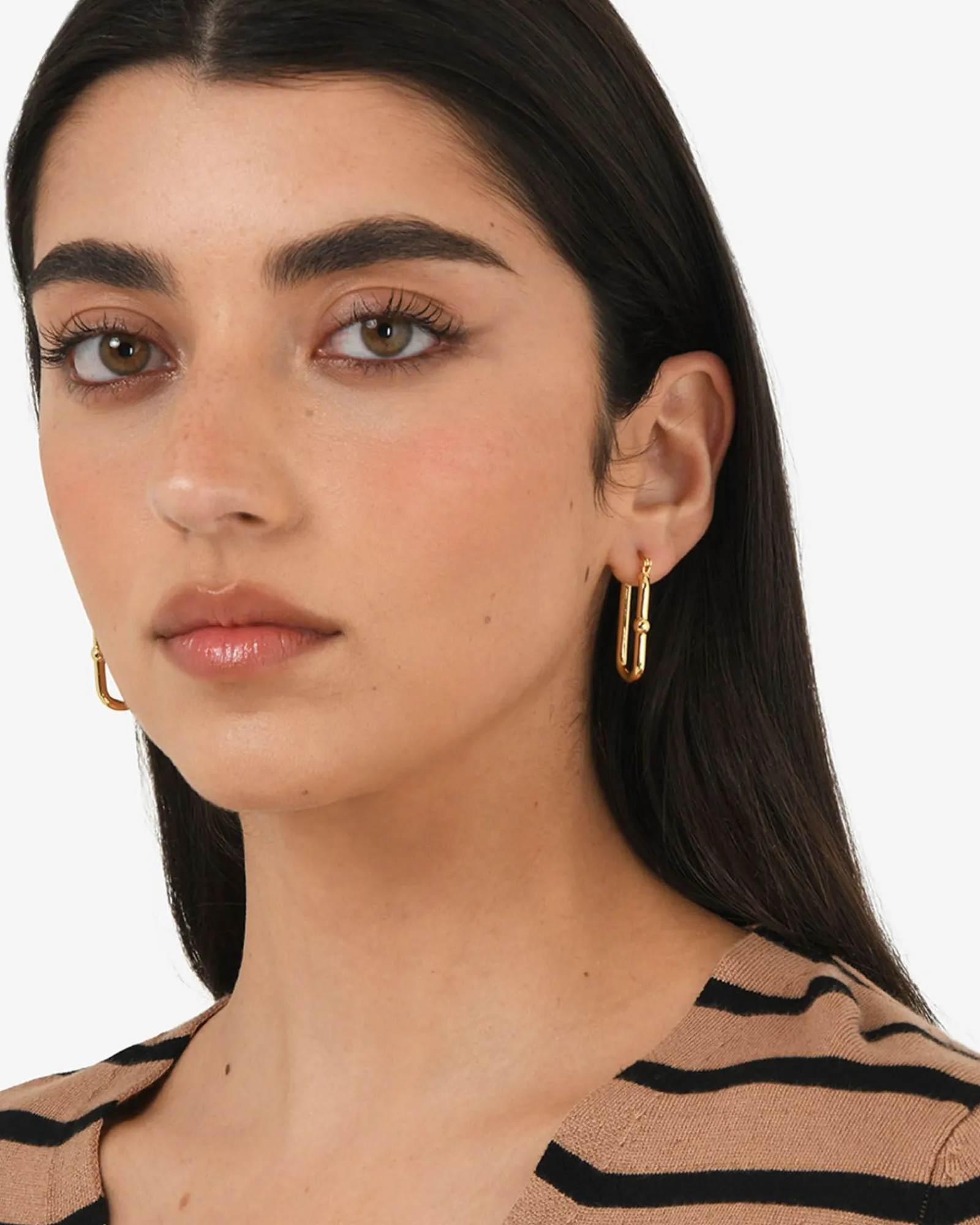 A modern twist on a classic. The Carmen Gold Earrings feature an elongated oval hoop with a spherical detail, finished in a radiant gold tone.