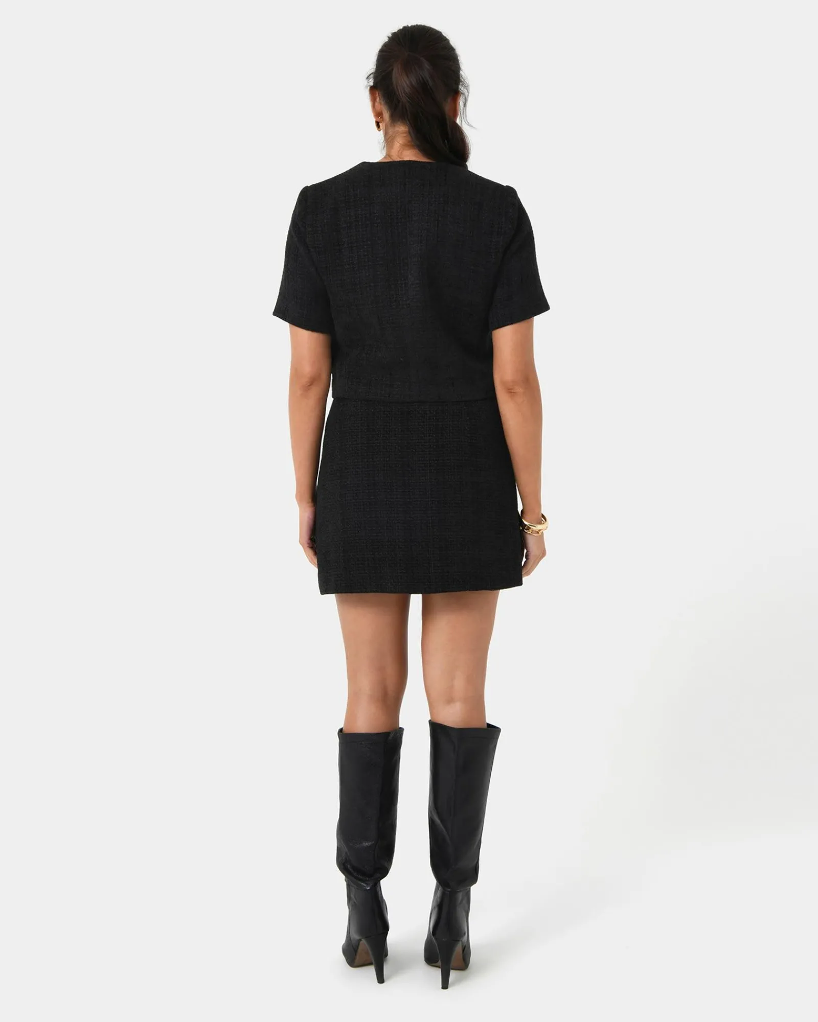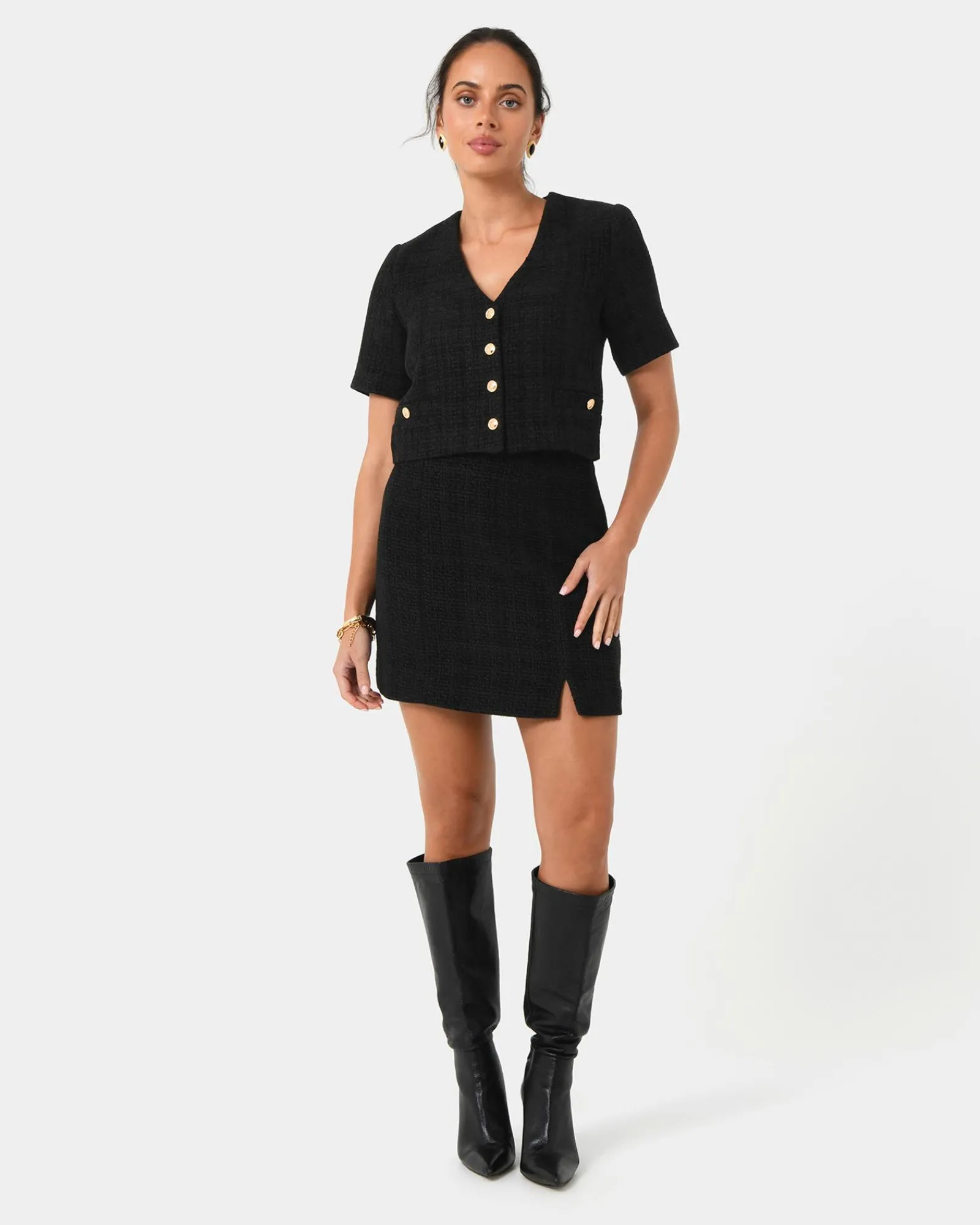 Chic, cropped, and effortlessly polished, the Carmen Tweed Crop Jacket has a tailored fit, a sleek V-neckline, and elegant gold-tone buttons. With its tweed fabrication, the jacket adds instant sophistication to any look. Short sleeves and faux pockets complete the look, making it the ideal jacket for a refined finish.