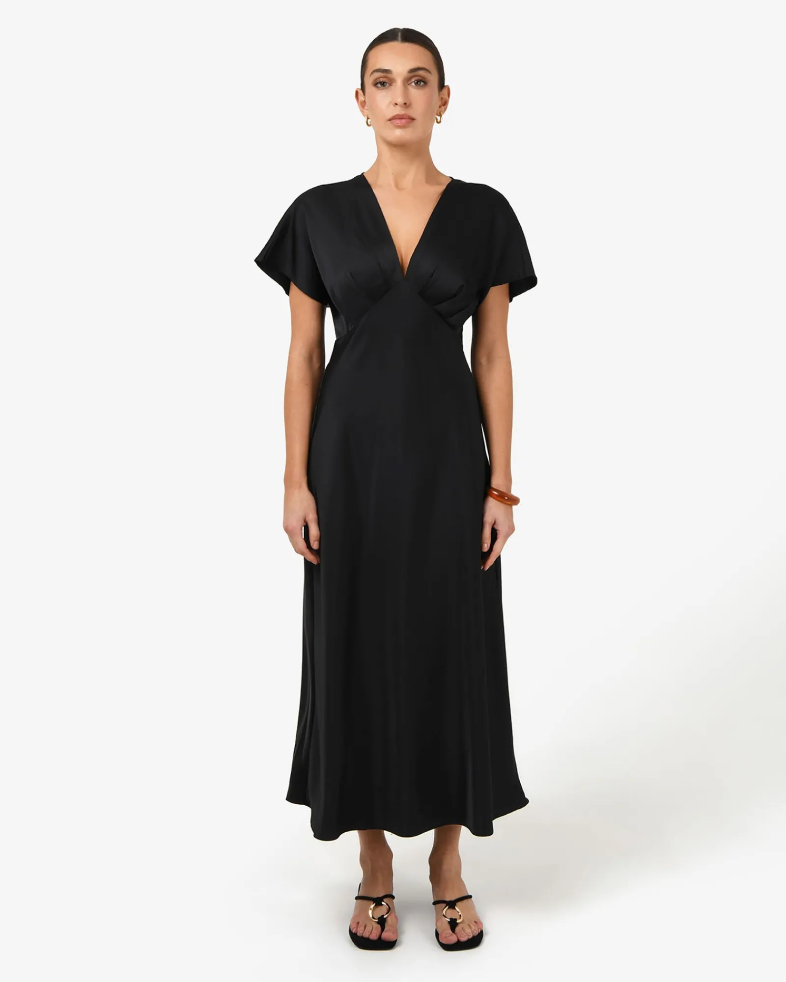The Catalina V-Neck Satin Dress exudes elegance with its soft satin finish and flattering silhouette. Featuring a V-neckline, short batwing sleeves and a fitted waist, it falls to graceful midi length with a bias-cut skirt. Finished with an invisible side zipper closure, this dress offers a refined look for your special occasions.