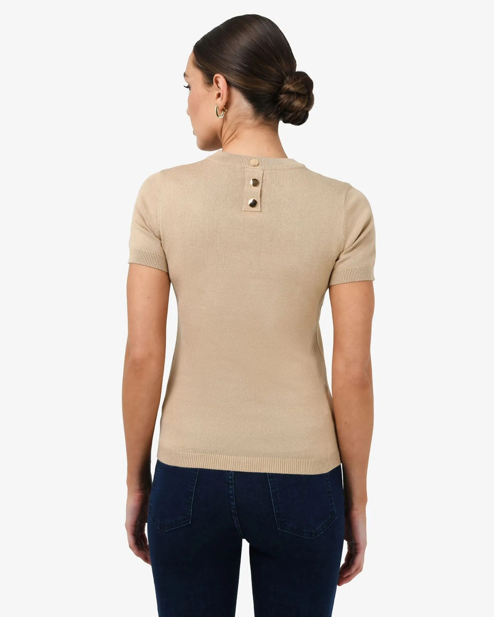 - Back neck gold-tone button detail