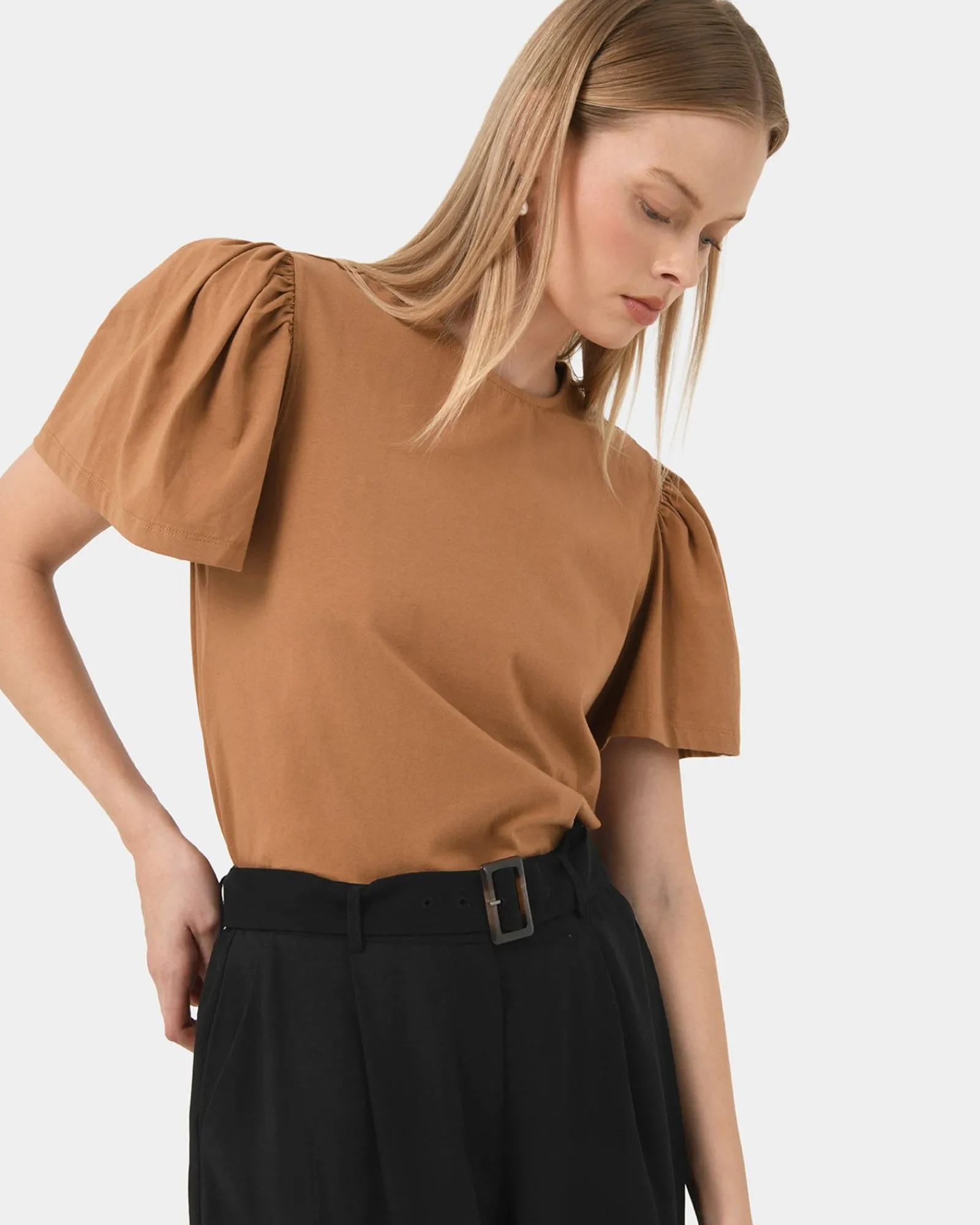 For a clean and comfortable addition to your corporate closet, choose the Cayla Gathered Sleeve Tee. This feminine and contemporary take on the classic tee is the perfect choice for an outfit that will take you through your busy schedule. Style it with slim pants and classic heels for a comfortable yet polished professional look.