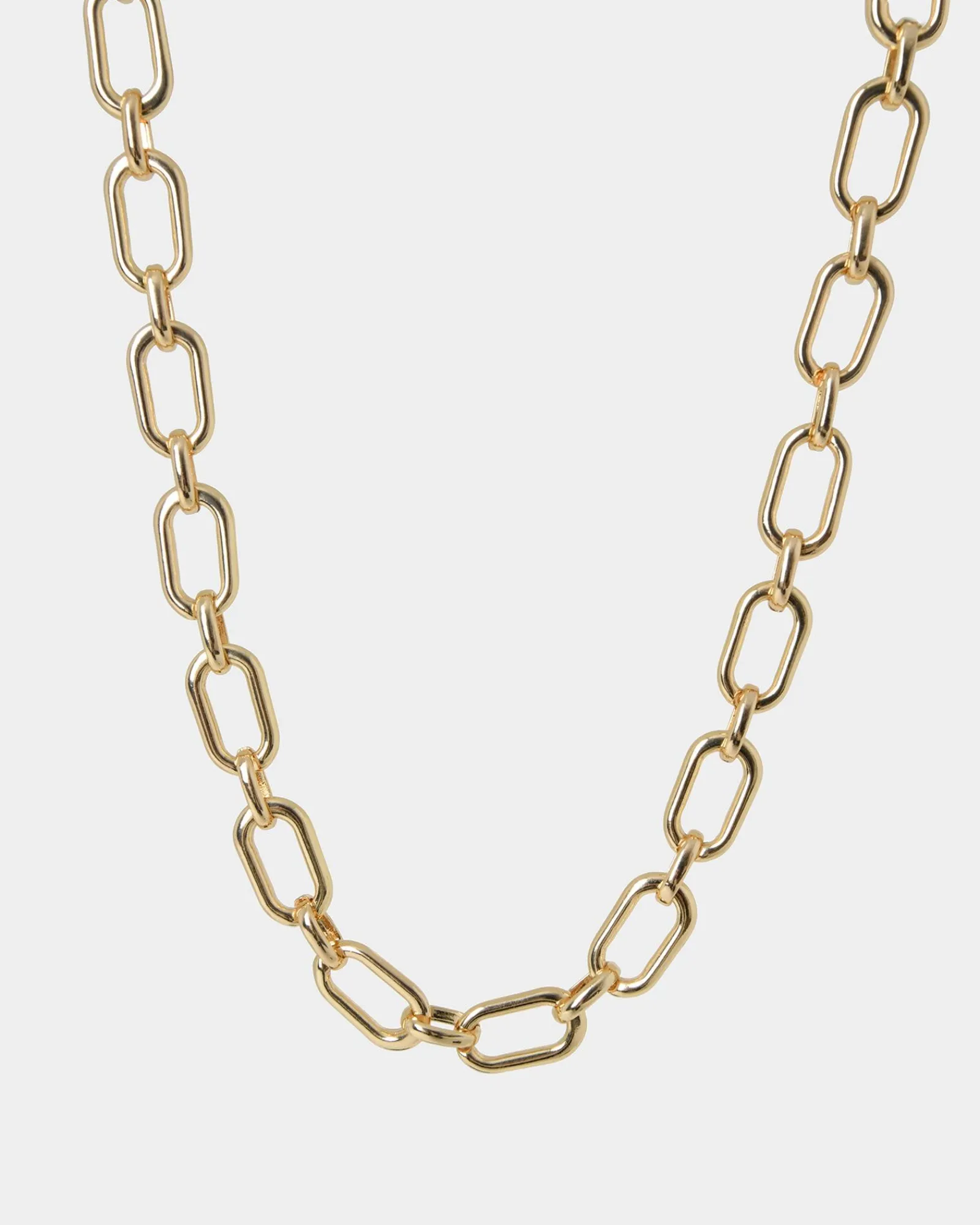 This bold and stylish Elvira Gold Plated Necklace features a chunky rectangular link chain. The oversized links create a striking and eye-catching statement piece.