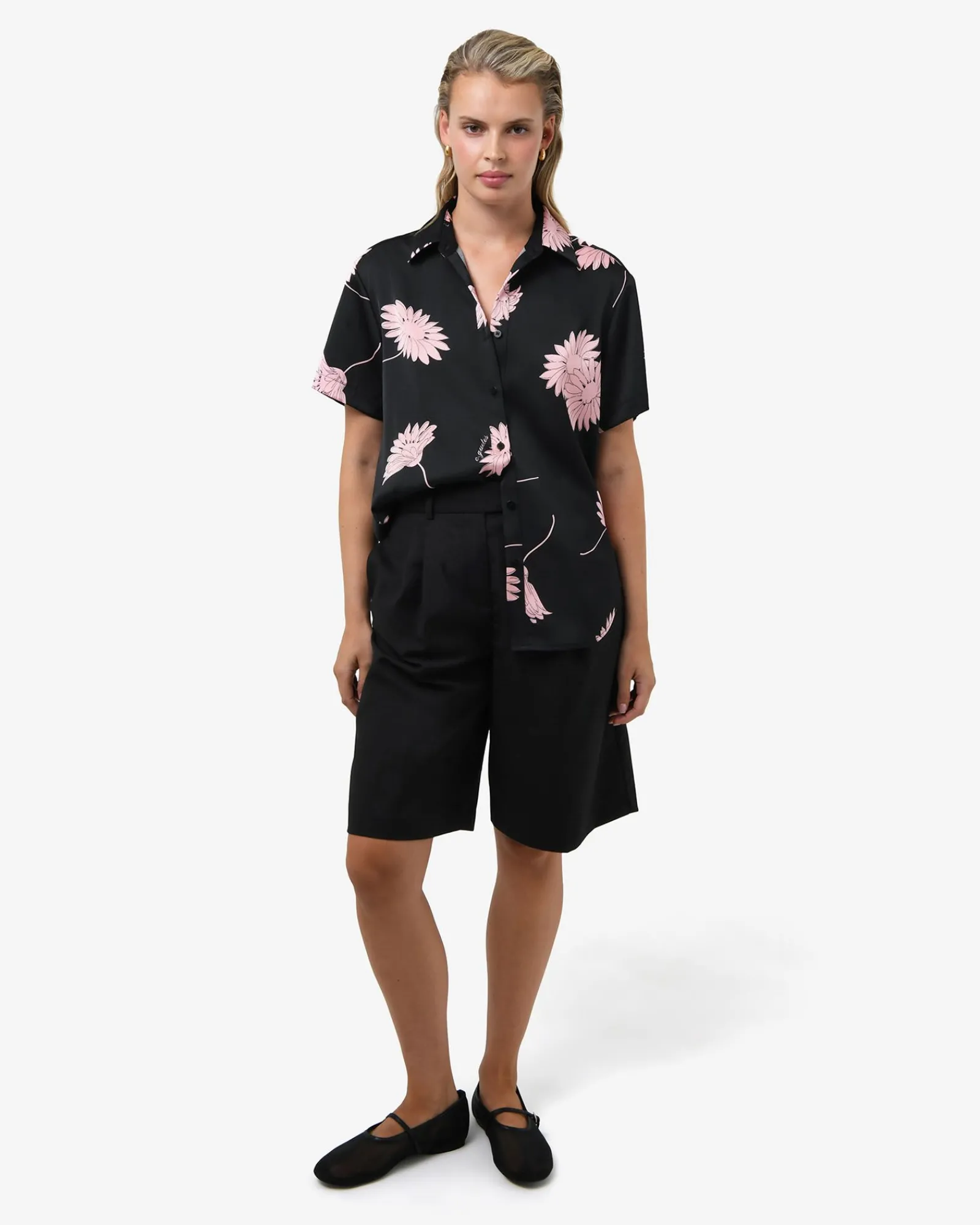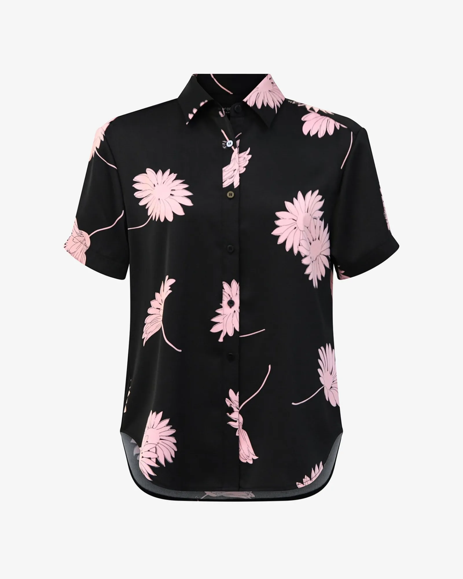 The Felicia Satin Shirt blends timeless charm with everyday ease. Crafted in a blush-pink floral print on smooth, luxurious satin, it drapes beautifully in a relaxed fit with a curved hemline. Perfect for elevating your casual wear.