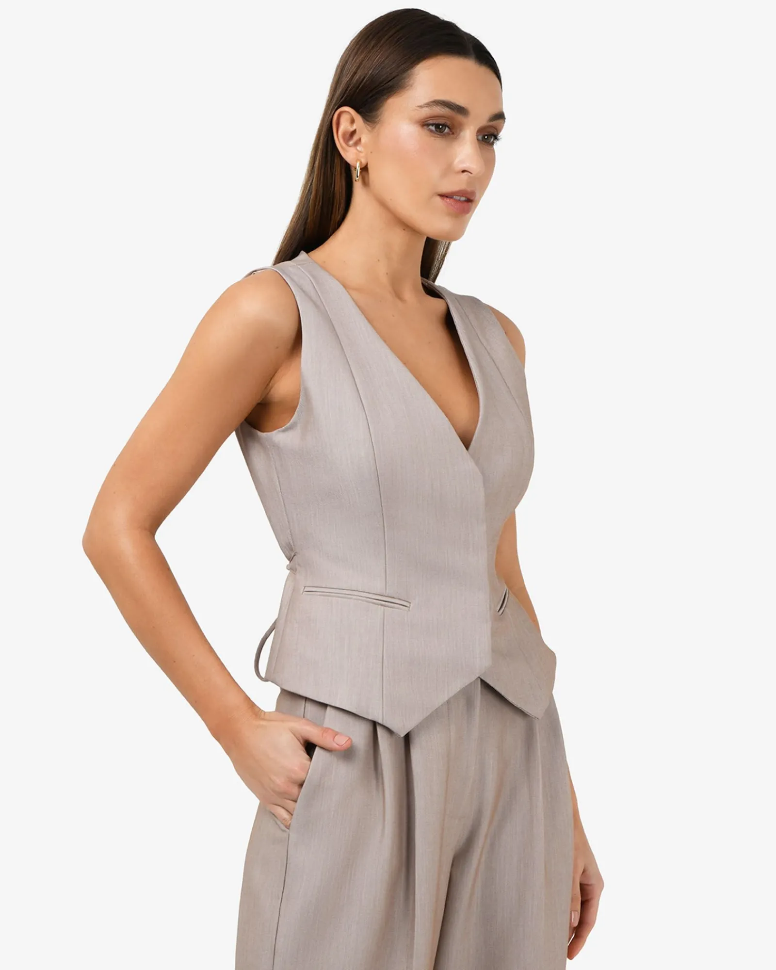 The Fitzroy Belted Vest is designed with princess seams and a deep V-neck for a flattering look. Its self-tie at the waist shapes the figure, while the asymmetrical hem, single-button closure, and functional front pockets add style and practicality – perfect for layering or wearing on its own.