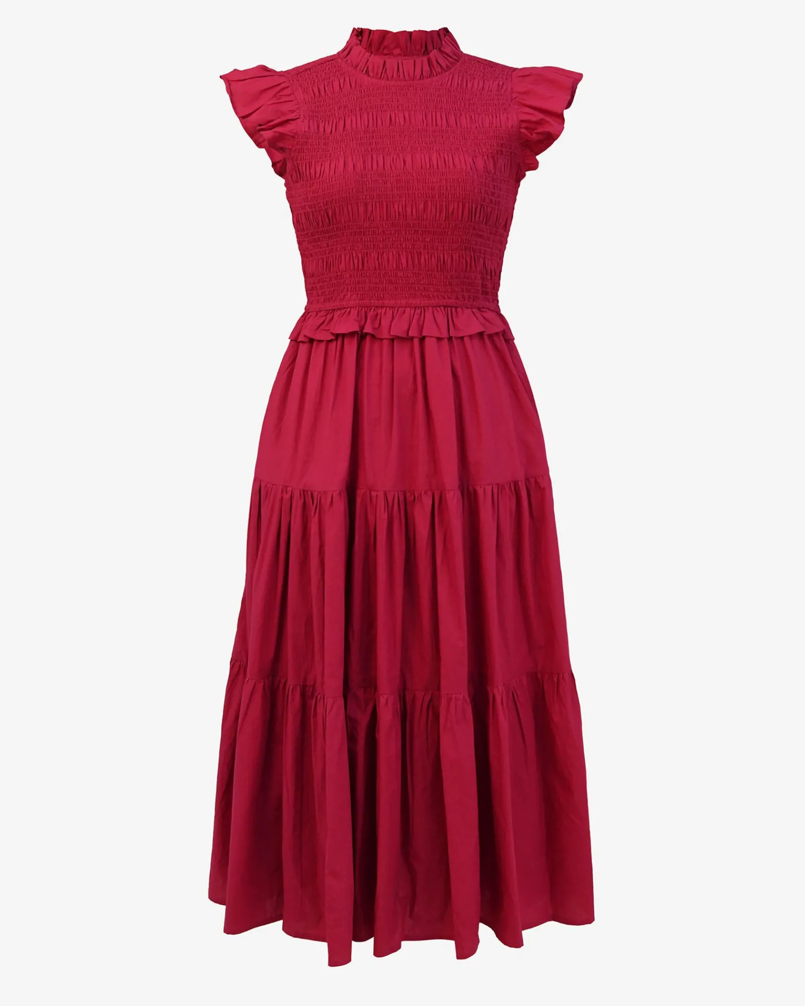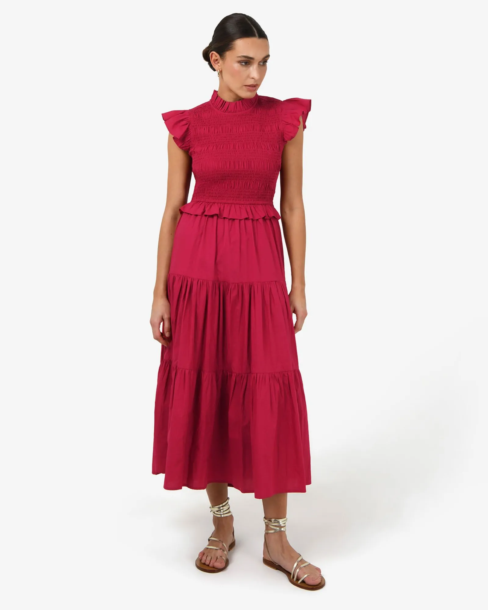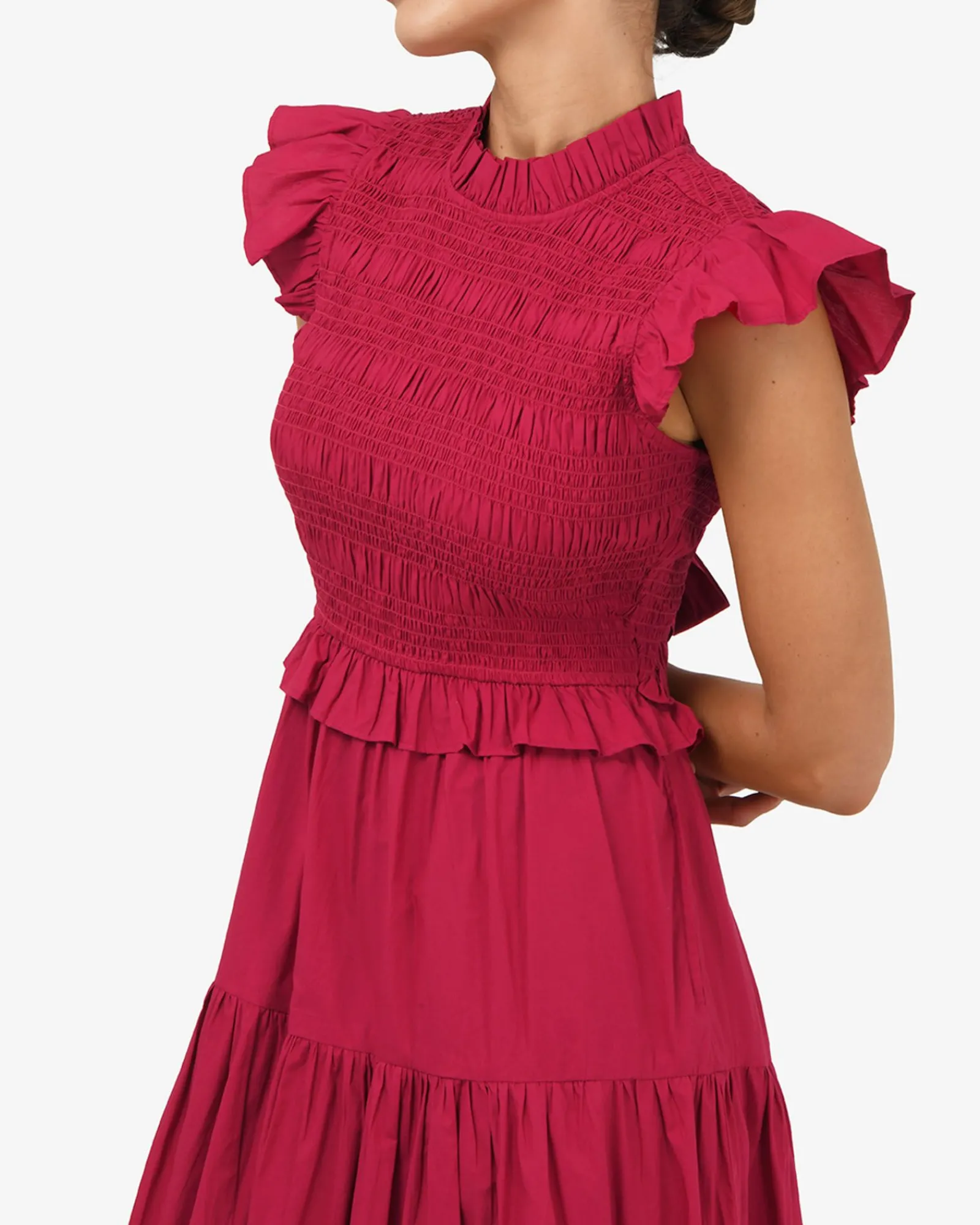 The Gia Cotton Poplin Dress is made from 100% cotton poplin and features a high ruffled neckline with matching short sleeves, a shirred bodice and an open back with a self-tie closure. The tiered midi skirt adds soft volume while the look can be styled with statement accessories for an elevated finish.