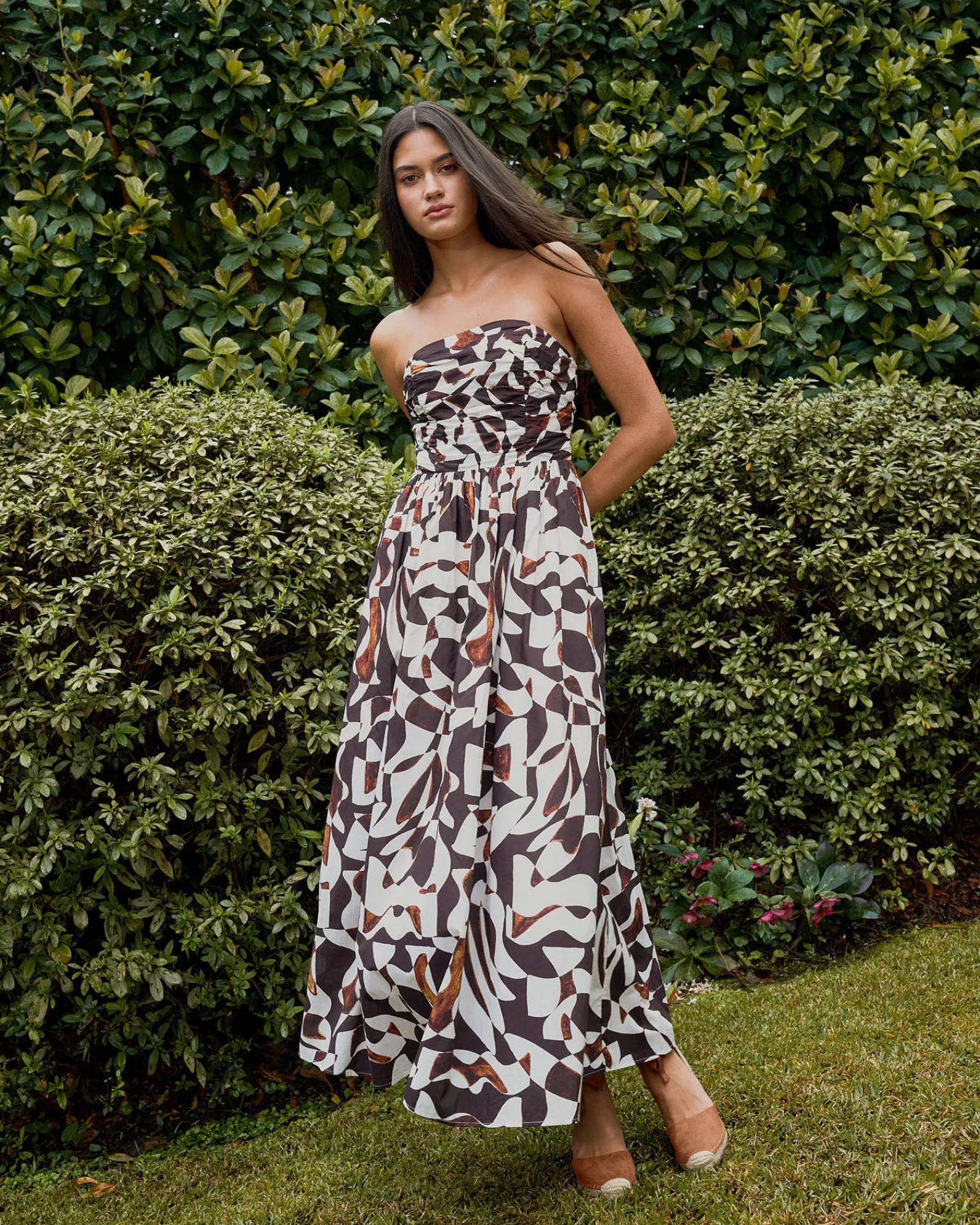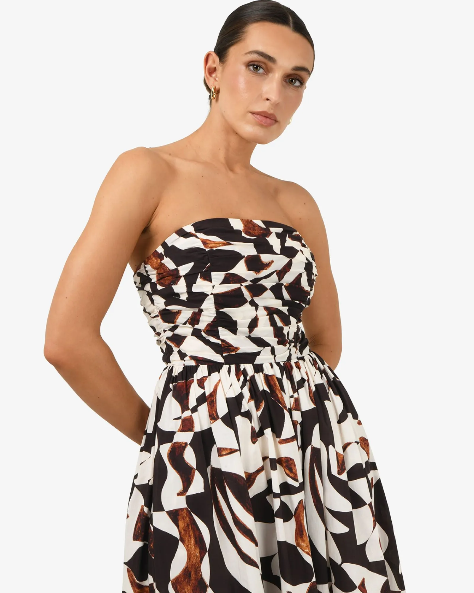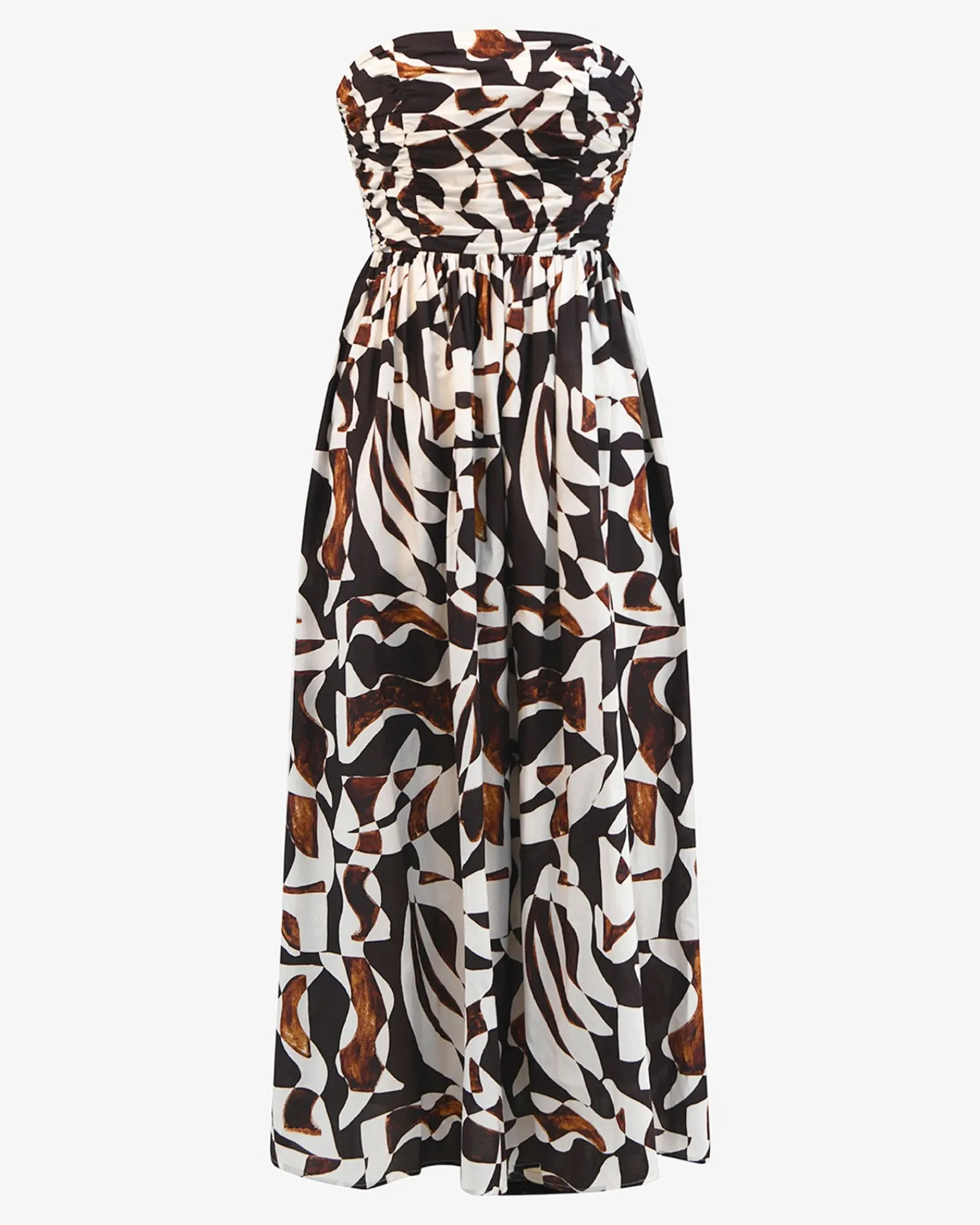 Meet the Hazel Printed Strapless Dress, an elegant piece in 100% cotton for your special occasions and events. It features a bold abstract print, a ruched strapless bodice and a gathered waist that flows into an A-line maxi skirt. Style with statement accessories to complete your look.