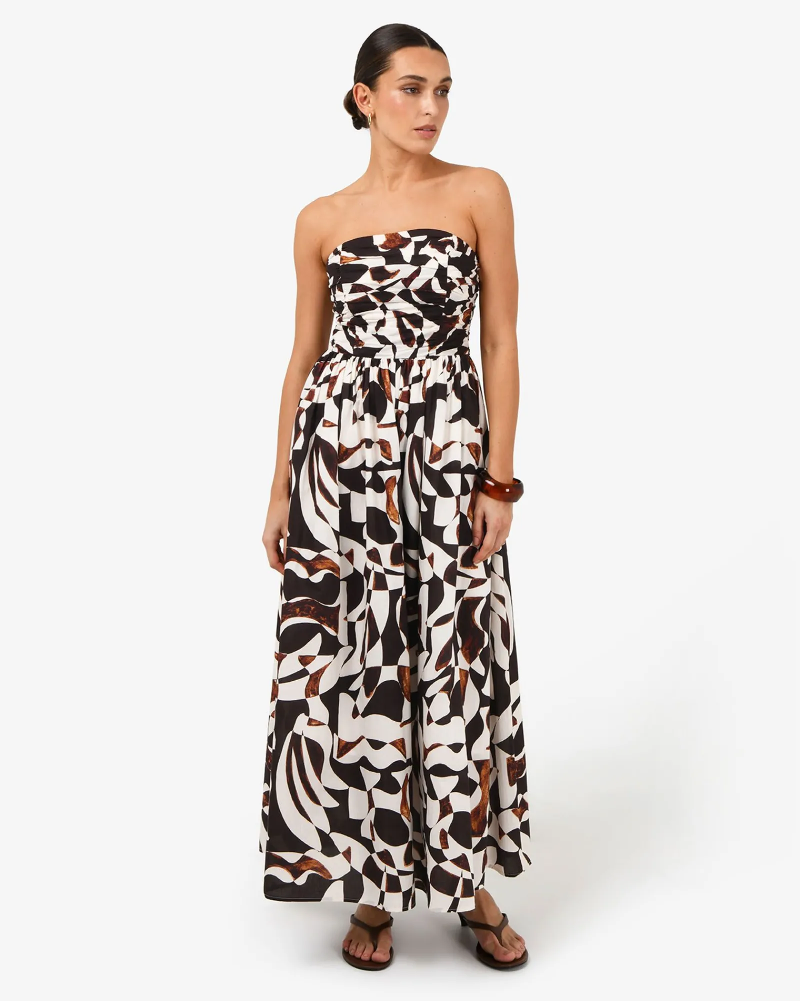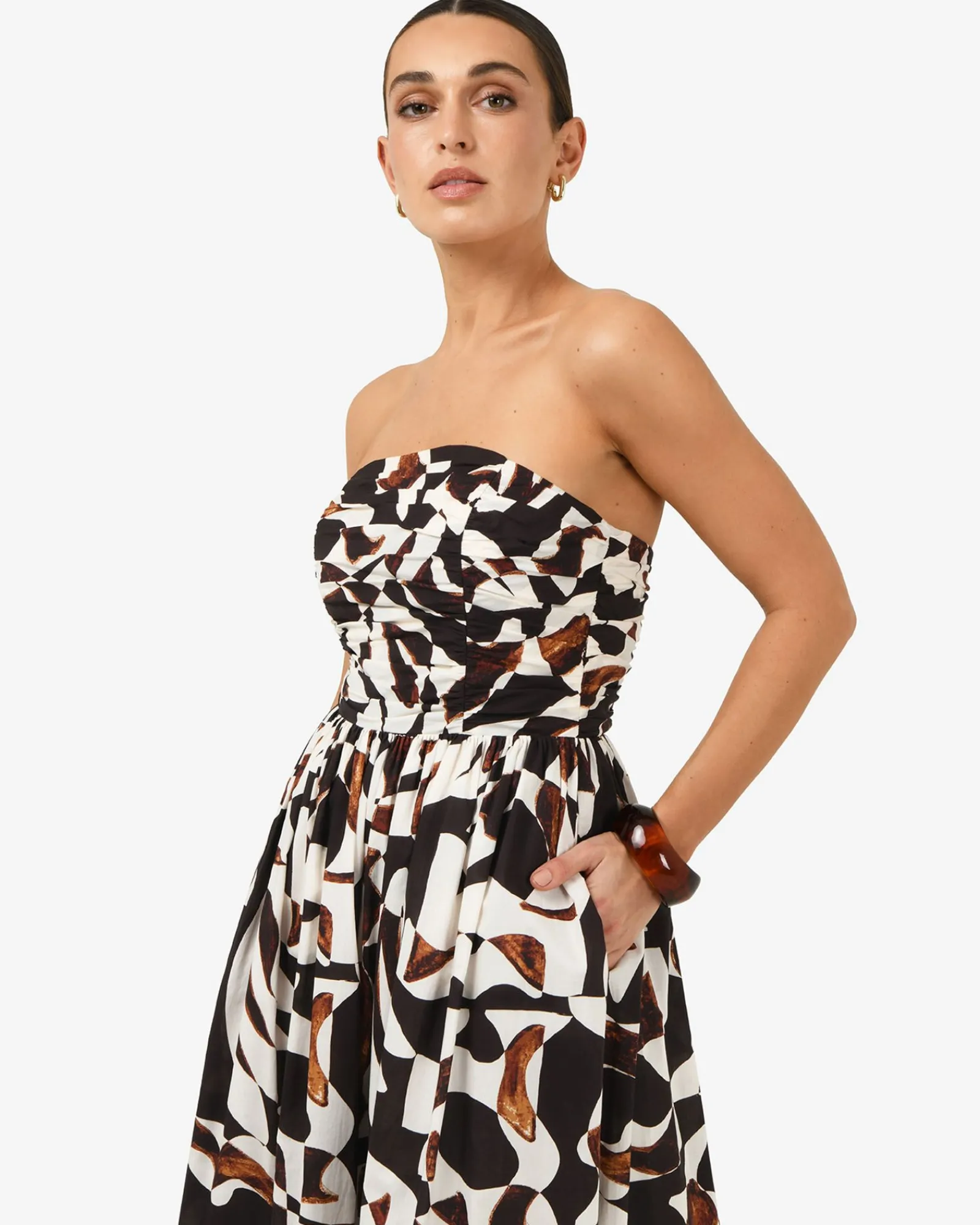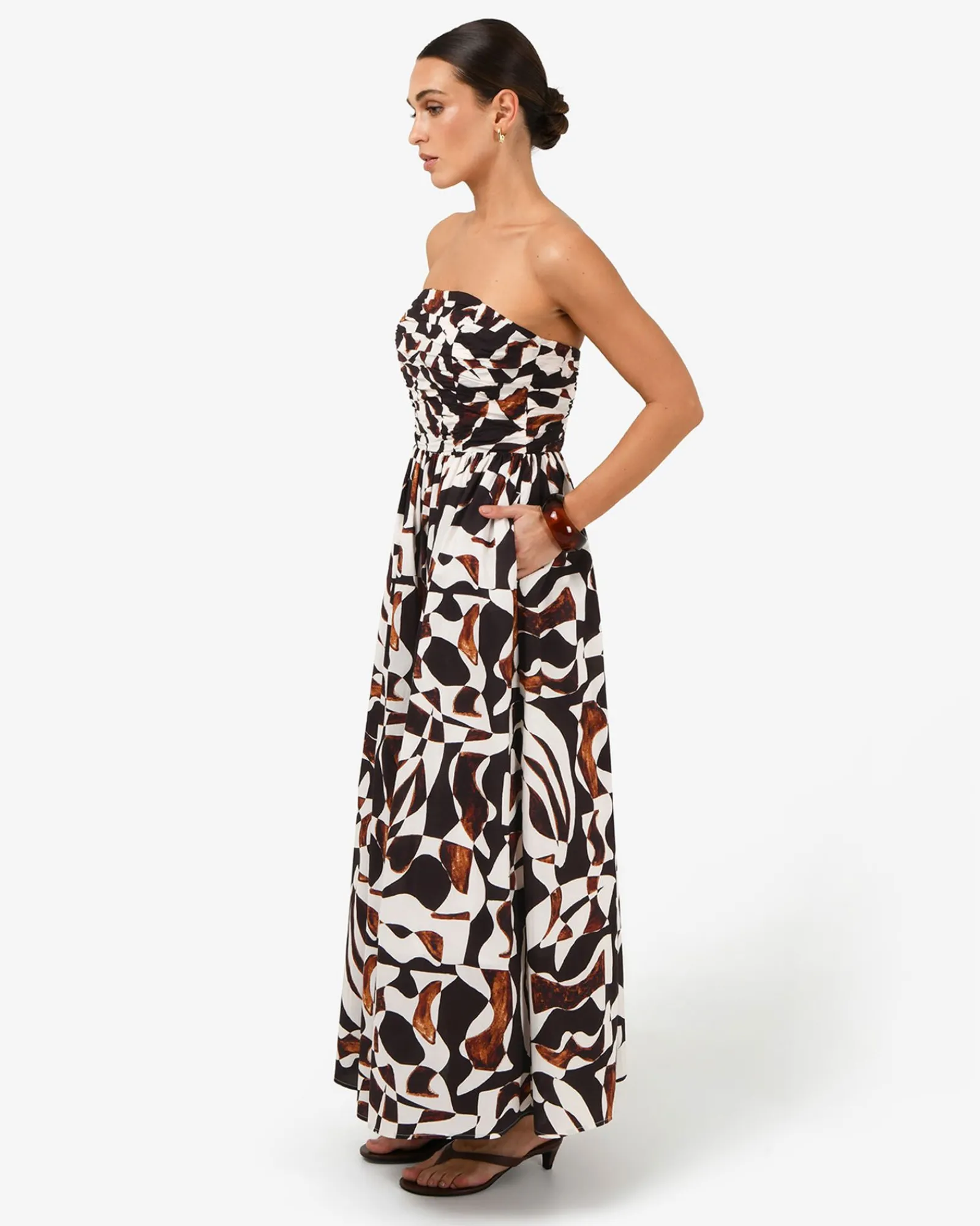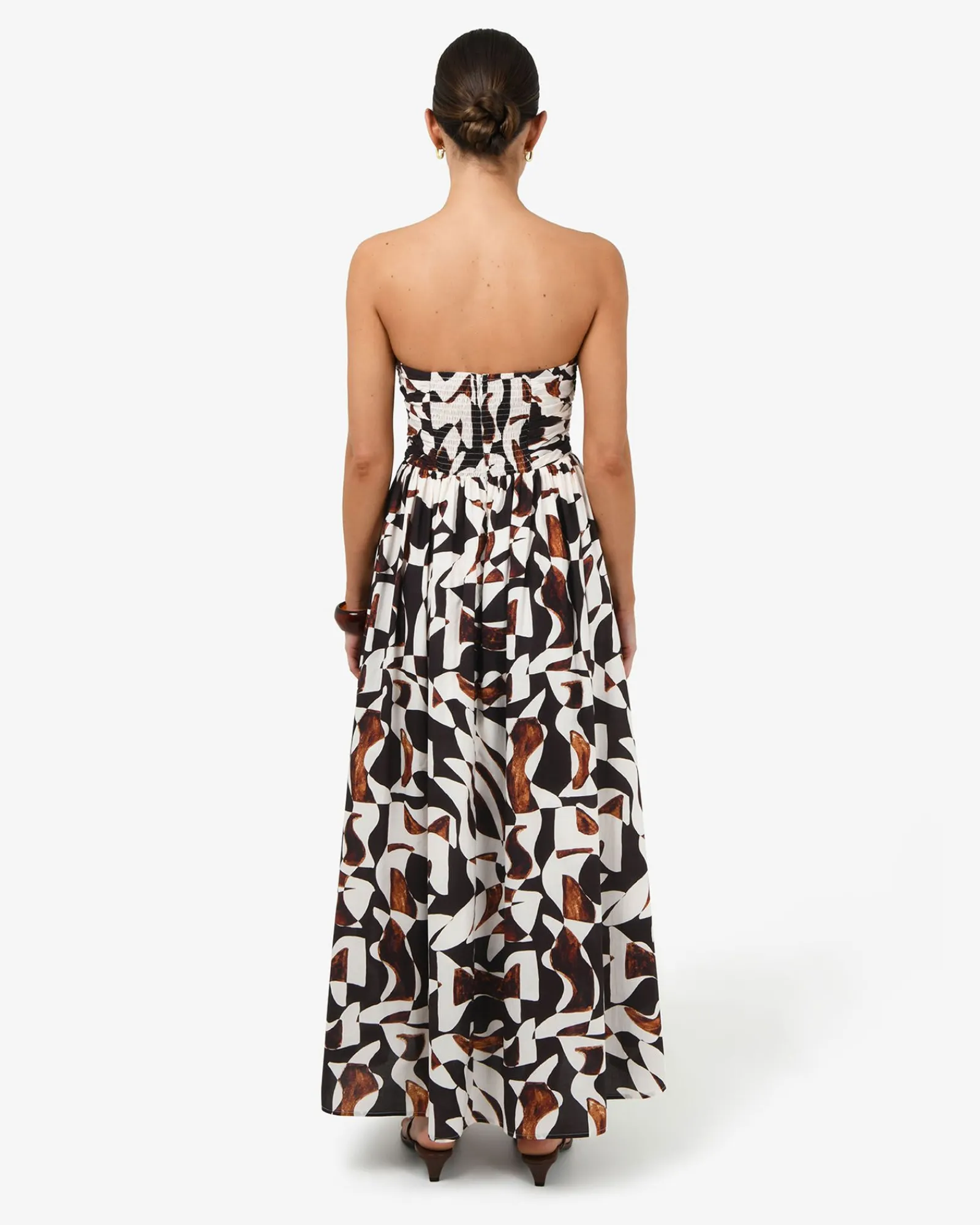 Meet the Hazel Printed Strapless Dress, an elegant piece in 100% cotton for your special occasions and events. It features a bold abstract print, a ruched strapless bodice and a gathered waist that flows into an A-line maxi skirt. Style with statement accessories to complete your look.