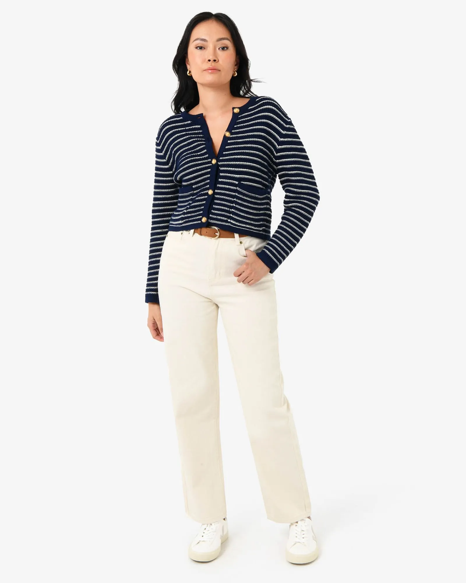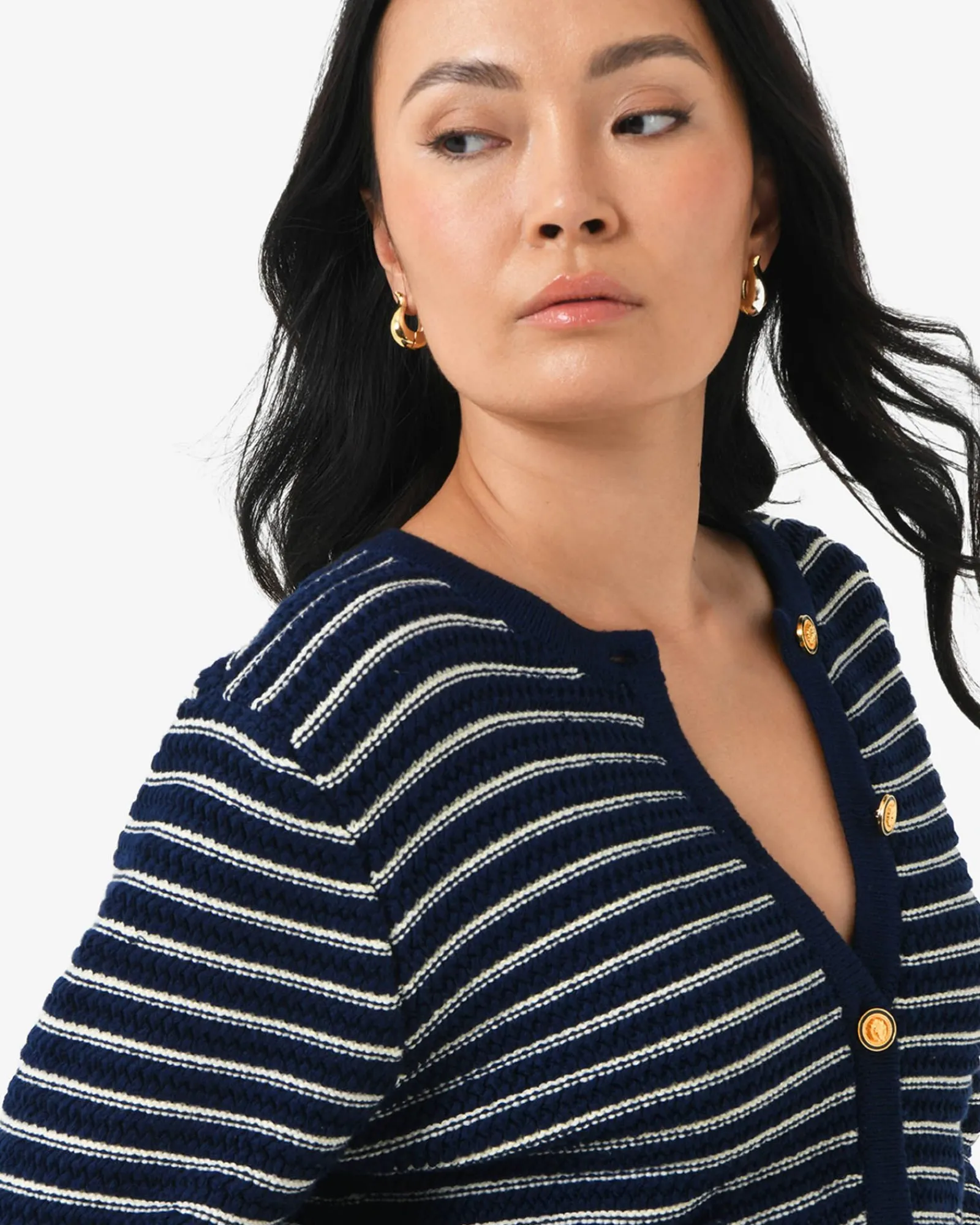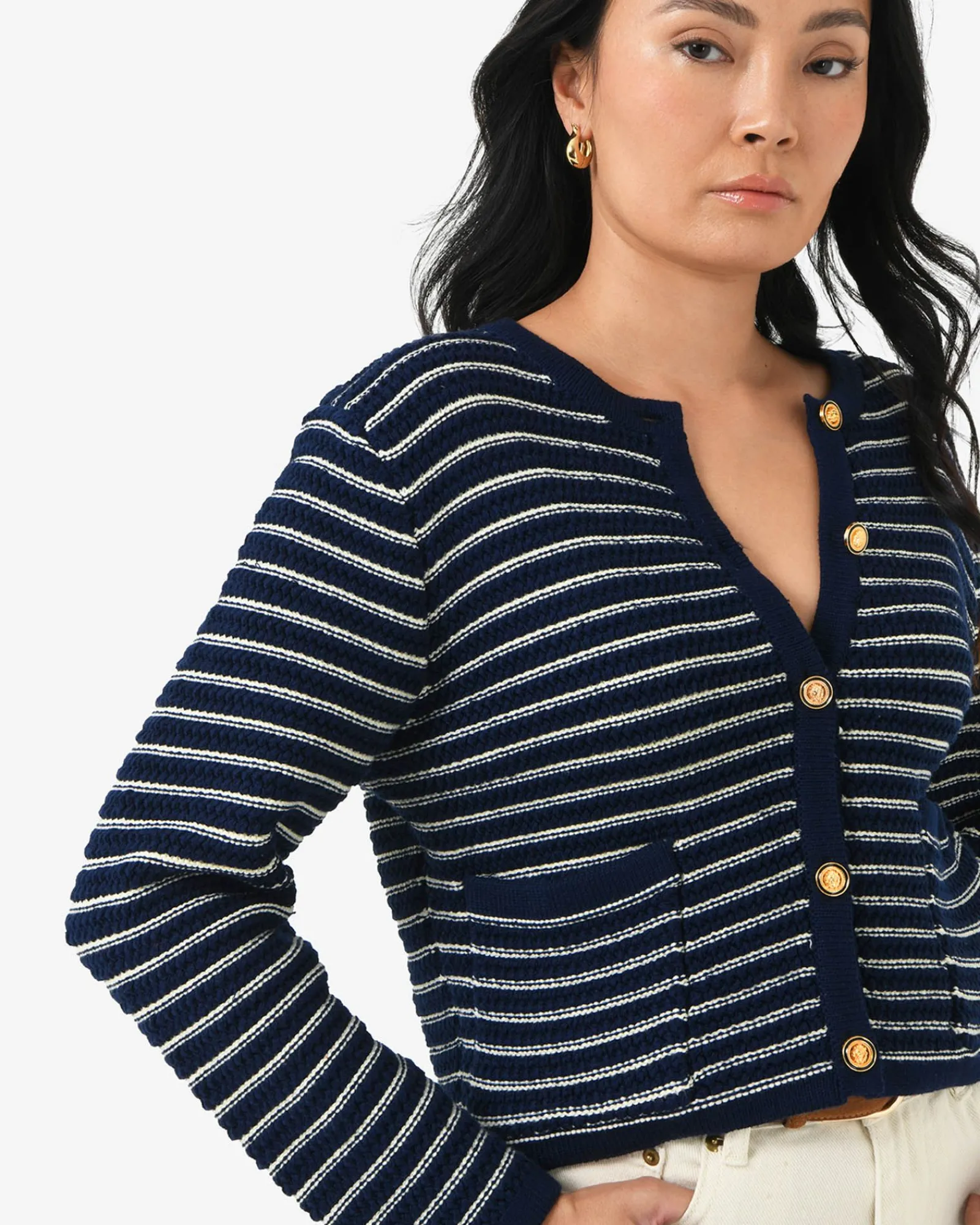 The Hollis Textured Cardigan is the transeasonal wardrobe hero. Designed with embossed gold tone buttons and woven in a luxurious textured knit, this cropped cut cardigan can be worn as a top or open as a jacket.