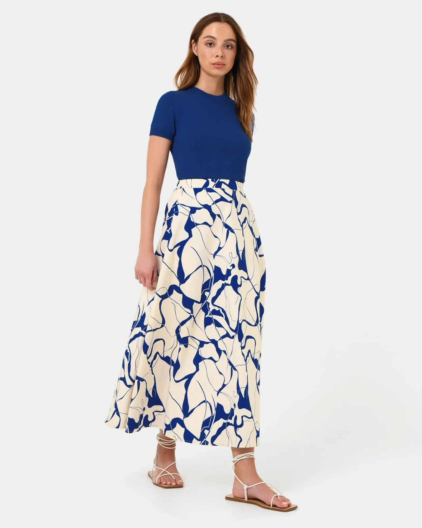 Discover effortless style with the Jayleen Midi Skirt, a perfect blend of comfort and sophistication. Featuring an eye-catching abstract water print, this skirt brings a modern, artistic flair to your wardrobe.