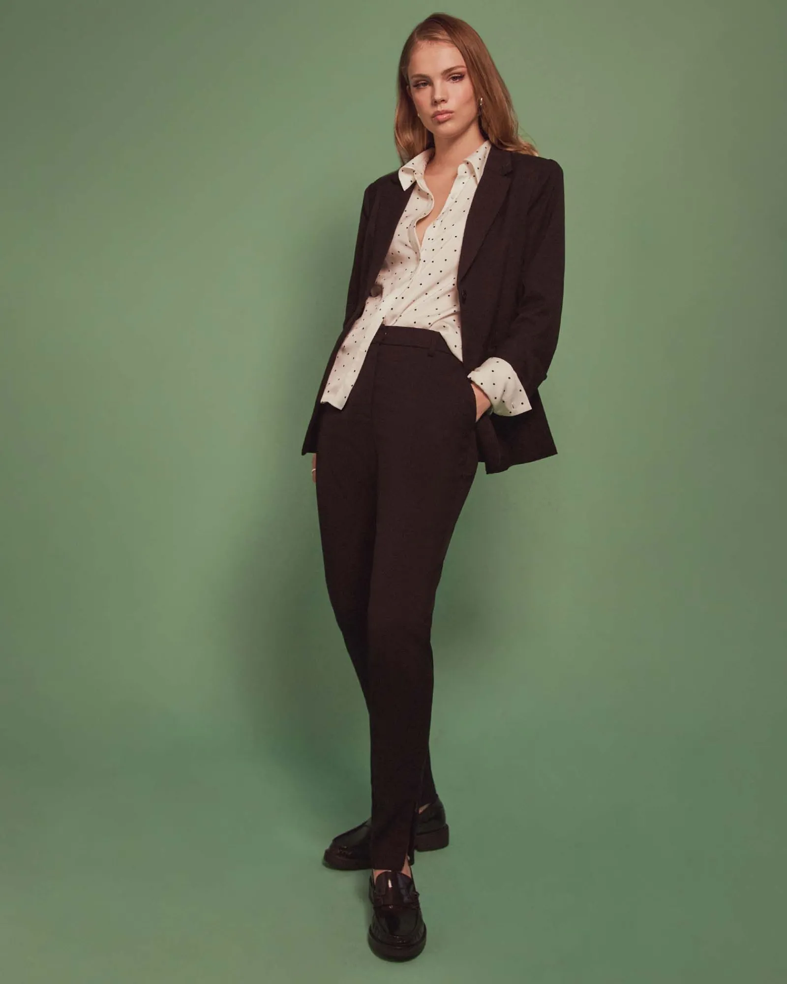 - Side zipper detail in lower hem