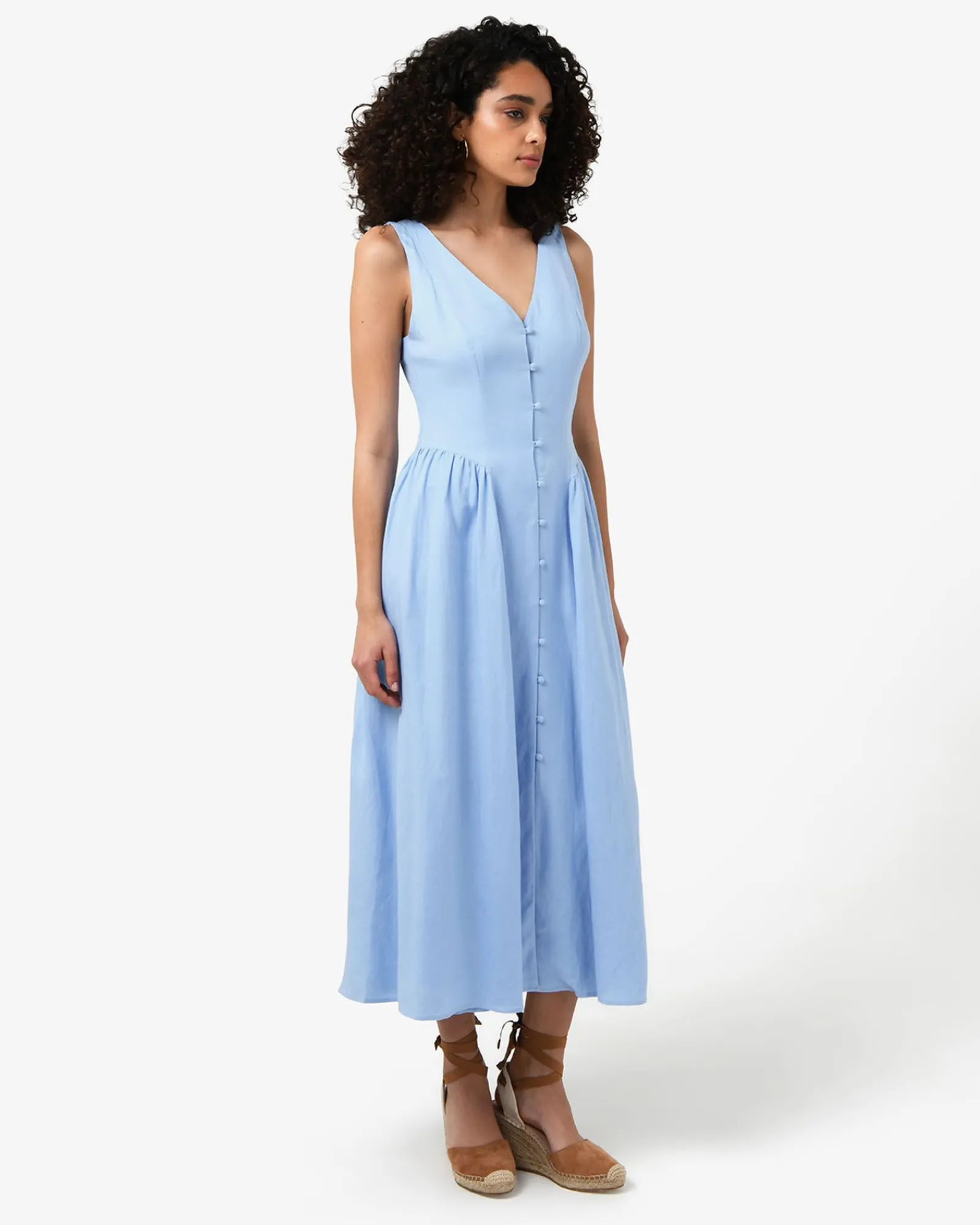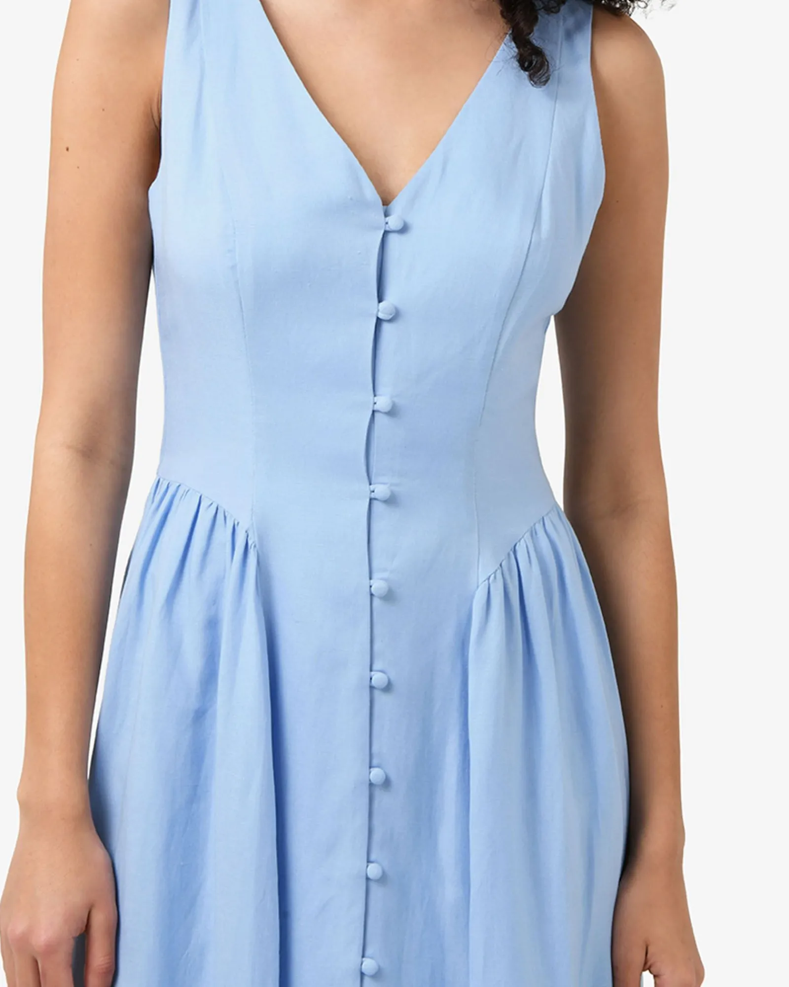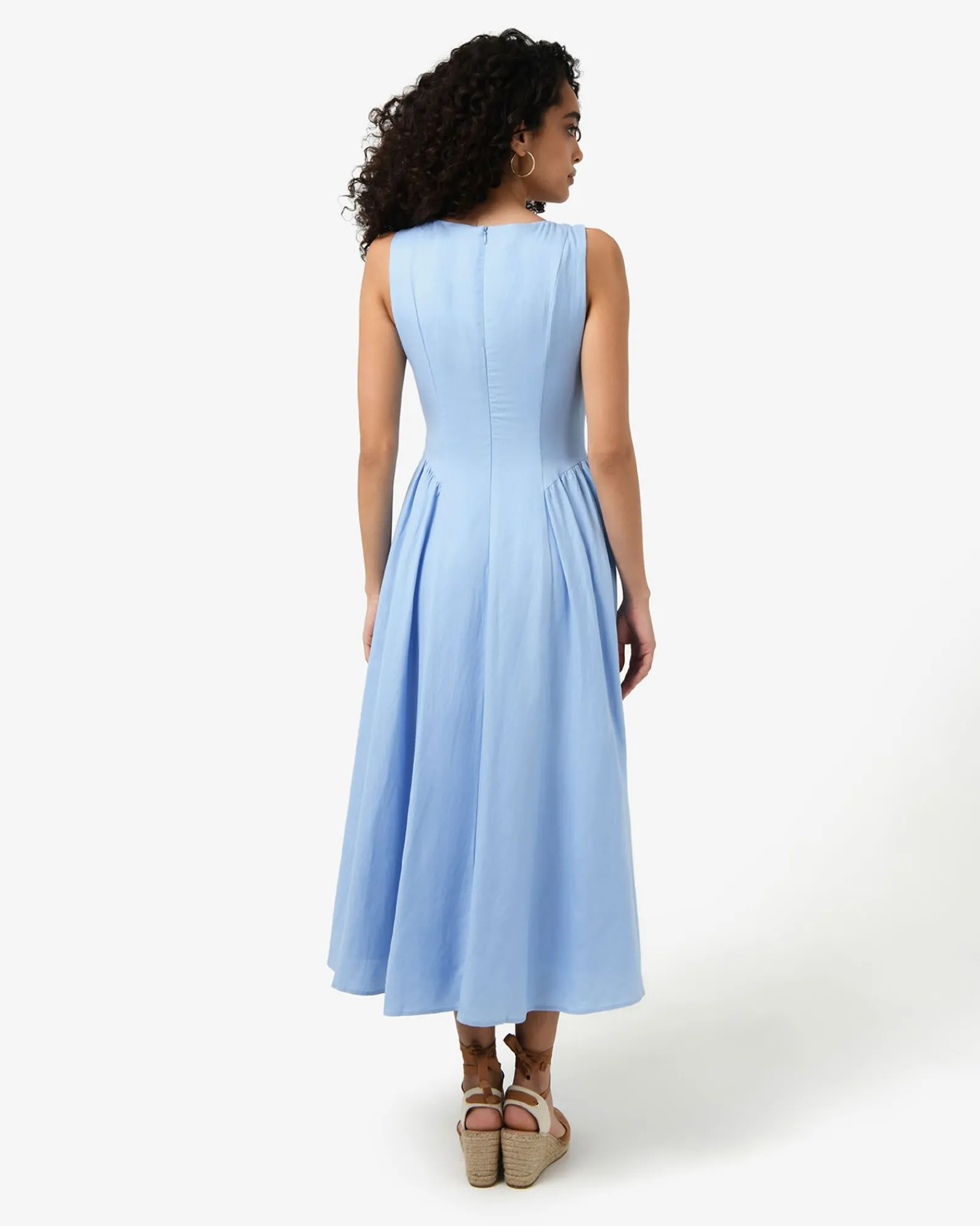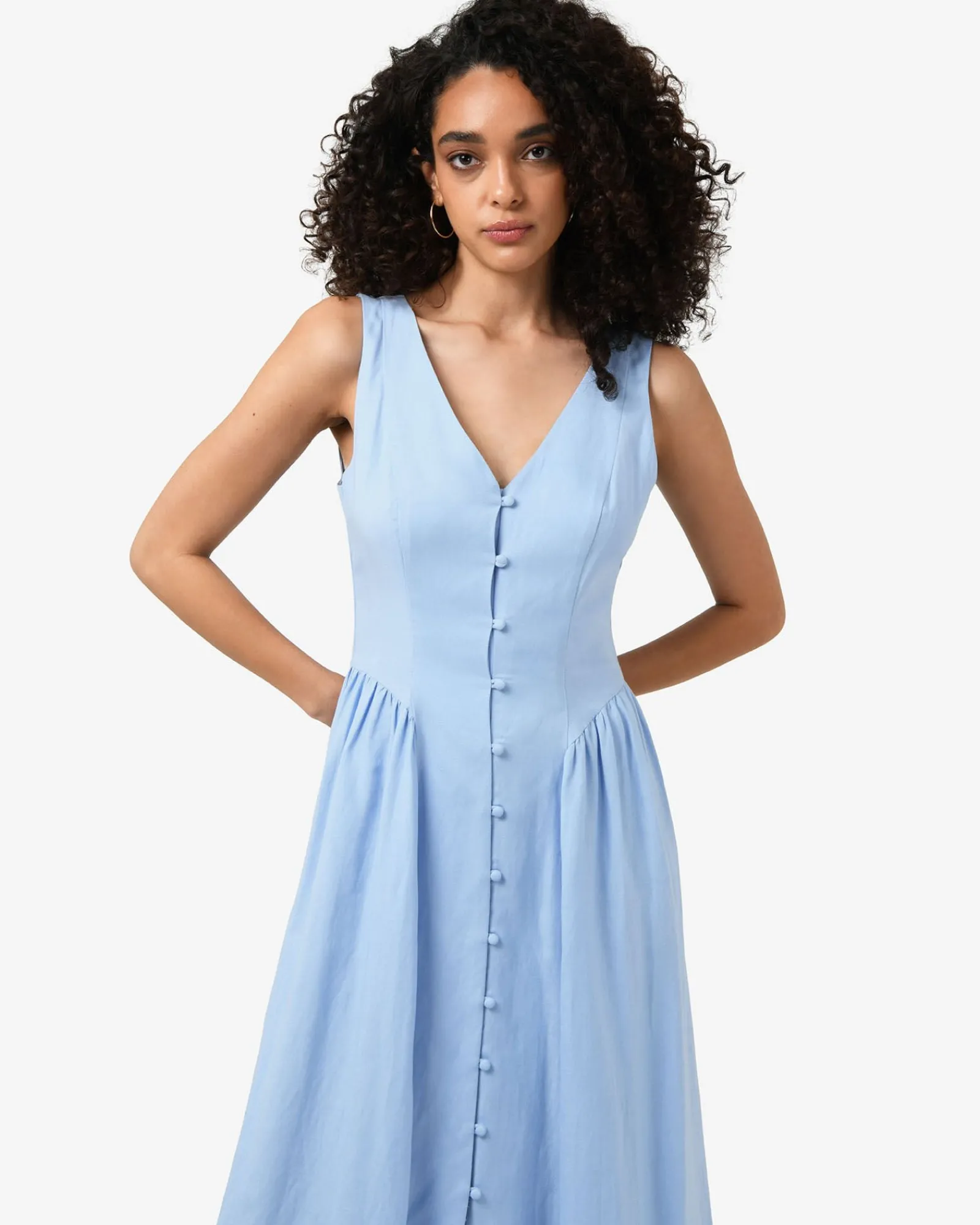 The Kendal Linen Blend Dress features a sleeveless design with a V-neckline, invisible back zipper and functional front loop buttons, while the lined midi skirt is finished with side gathering panels. The dress can be dressed up or down for both casual and occasion wear – style with your favourite accessories to complete the look.
