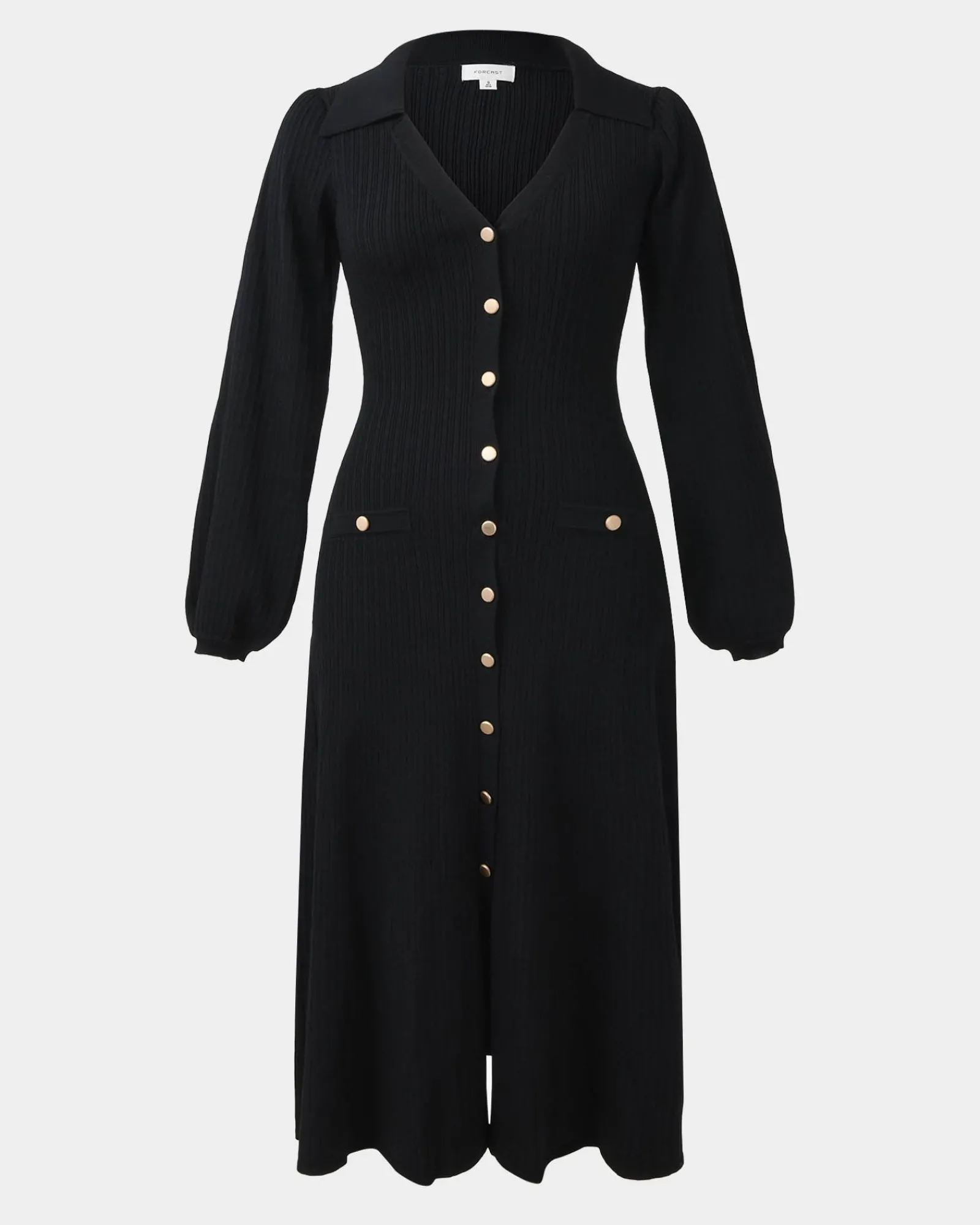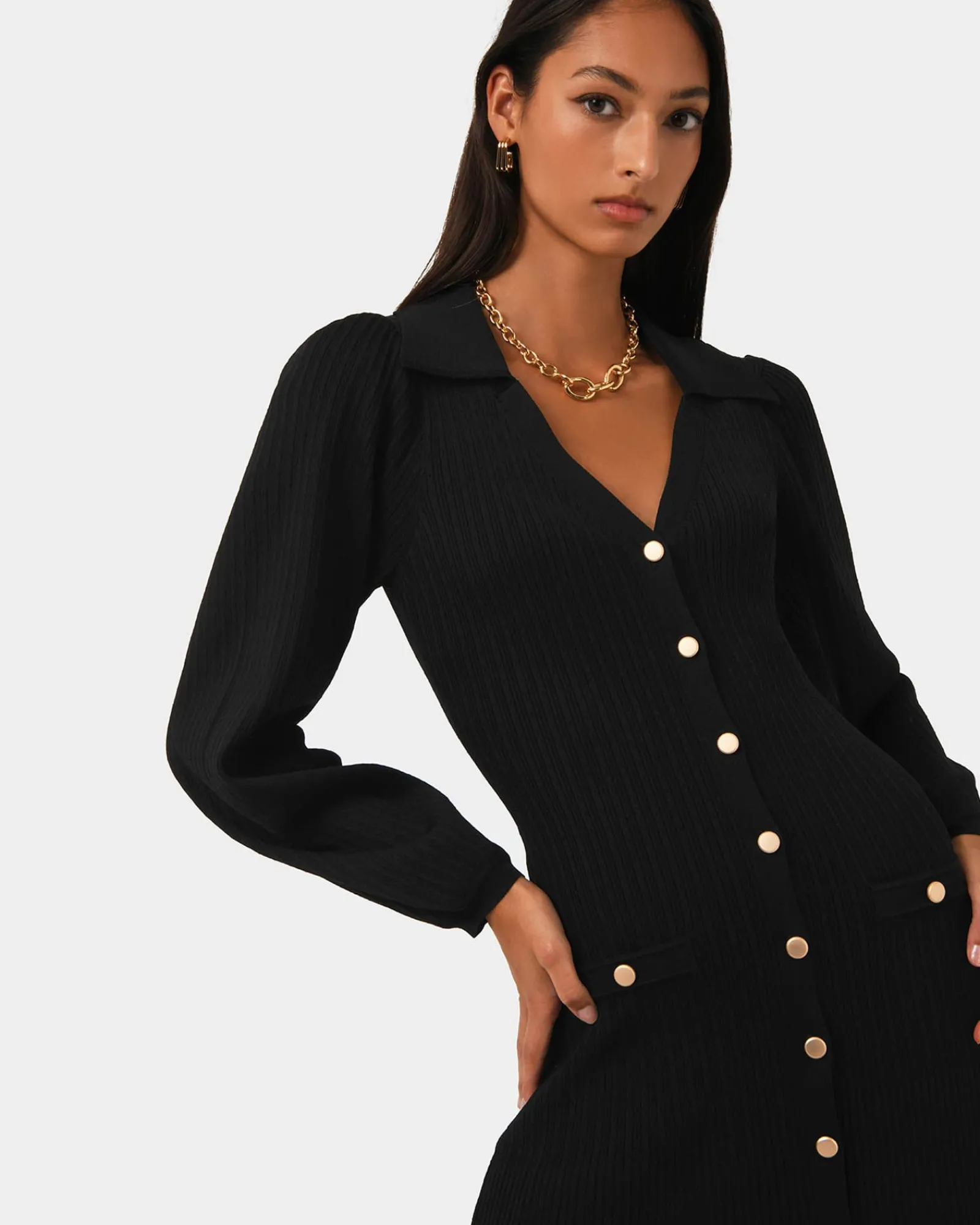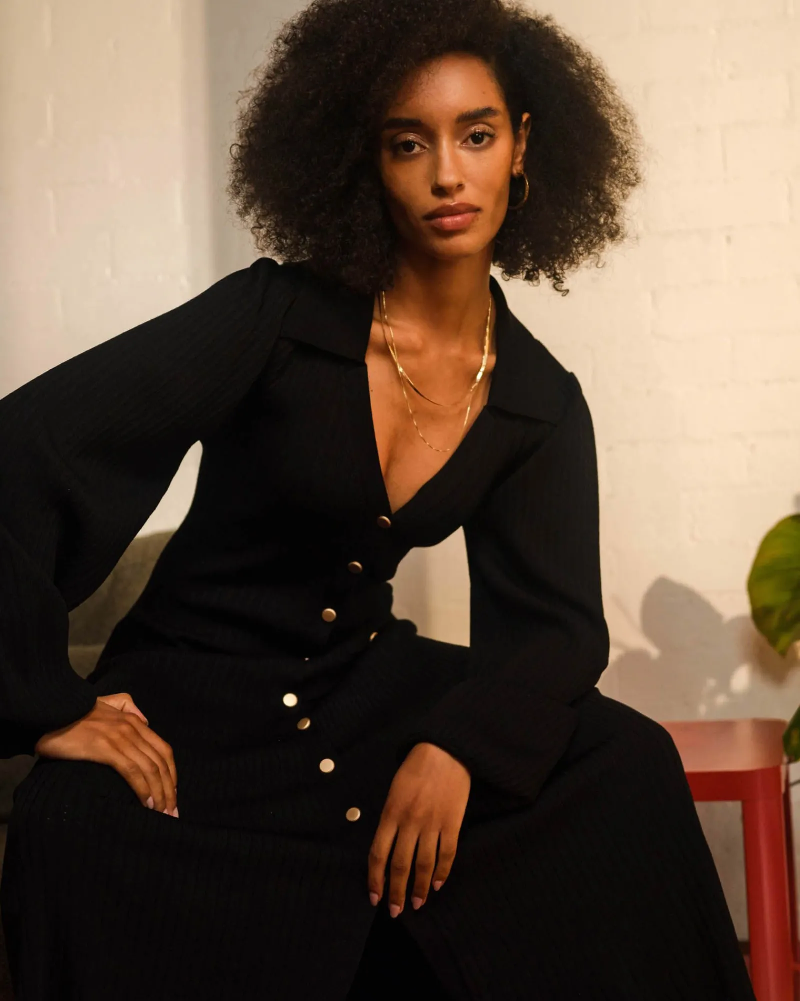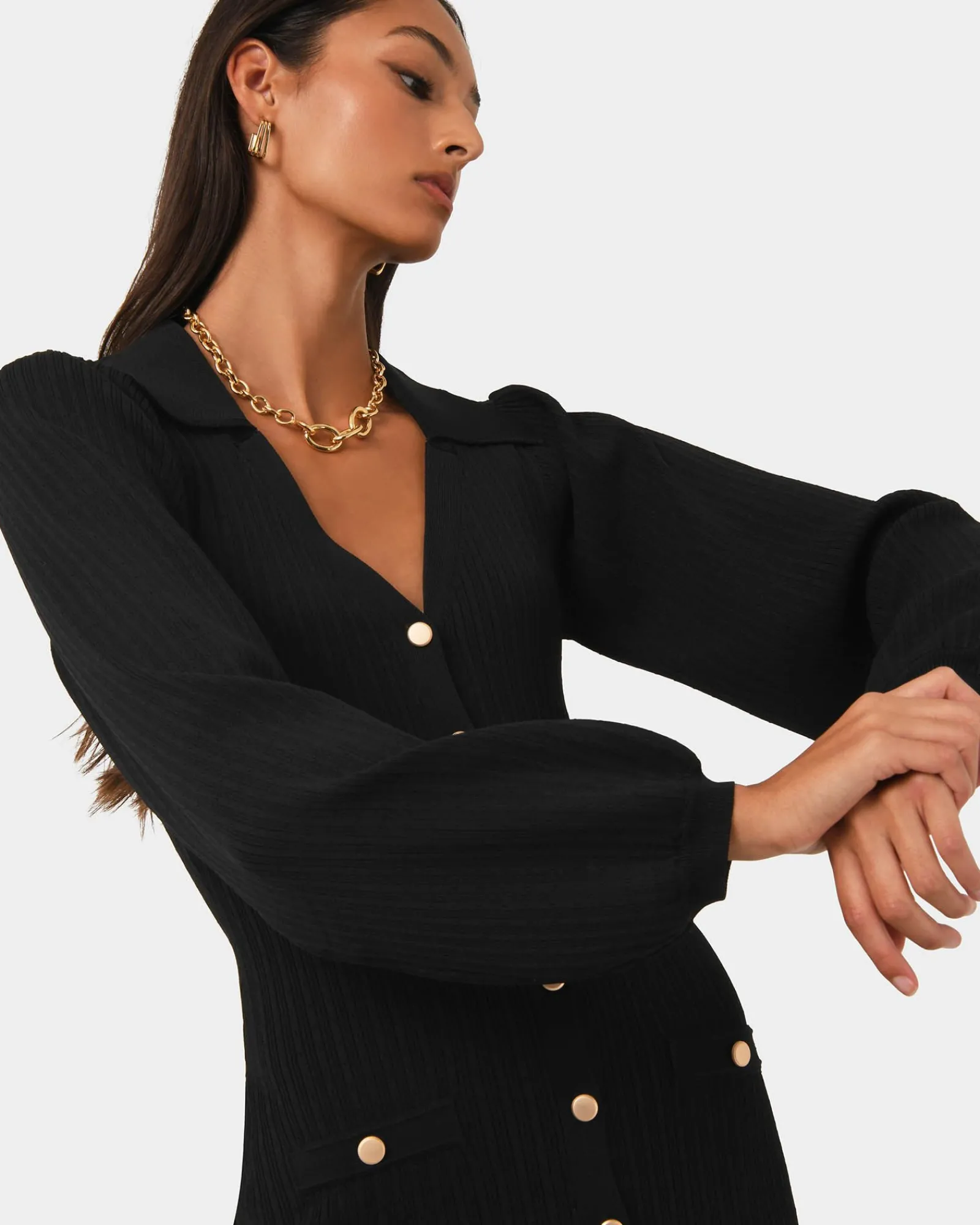 Make a statement with the Lara Collar Midi Knit Dress and wear the dress with class and grace. Featuring a collared V-neckline, it is made from heavyweight ribbed knit fabric with just the right amount of stretch for a flattering fit. The centre front gold button closure adds a touch of poise, while the long balloon sleeves with ribbed cuffs offer a stylish, yet relaxed finish.