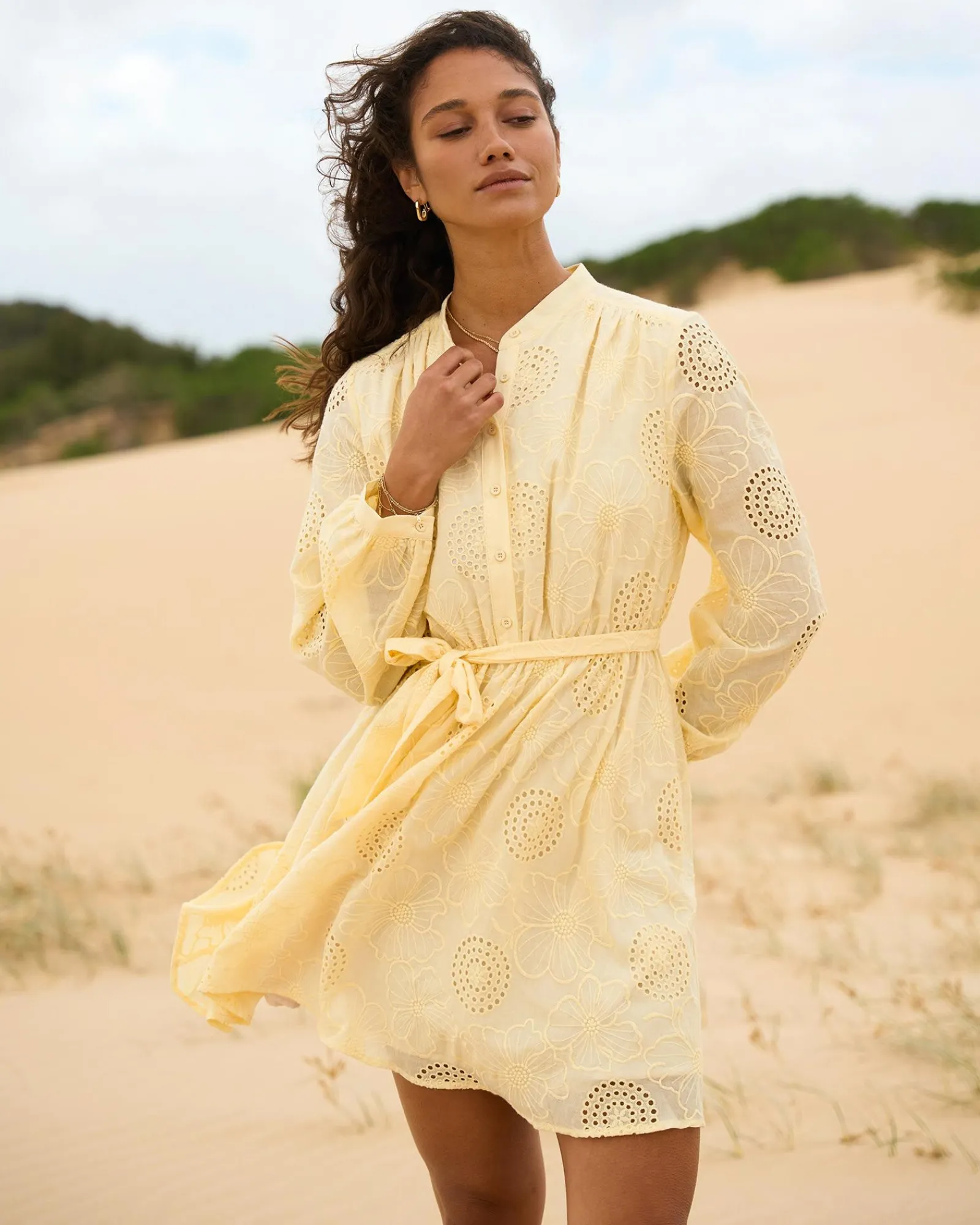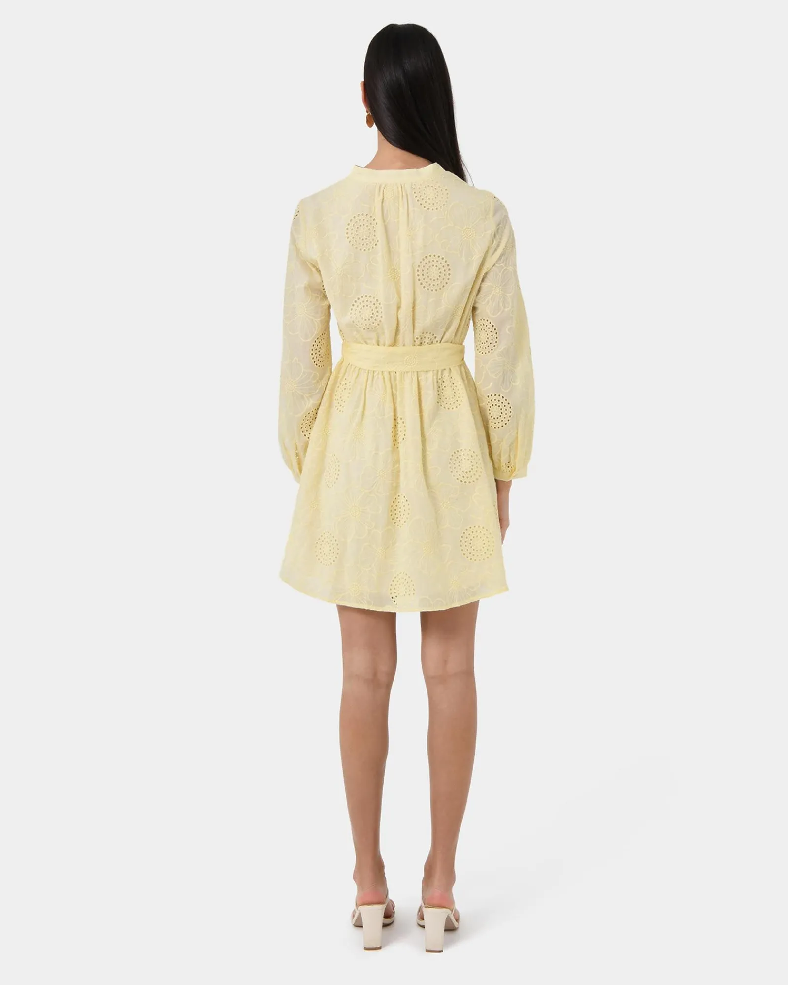 Elevate your summer style with the Lea Cotton Tie Dress. Crafted from soft cotton and adorned with delicate eyelet embroidery, this dress is the epitome of effortless chic. The tie waist cinches your figure, while the long sleeves add a touch of sophistication.