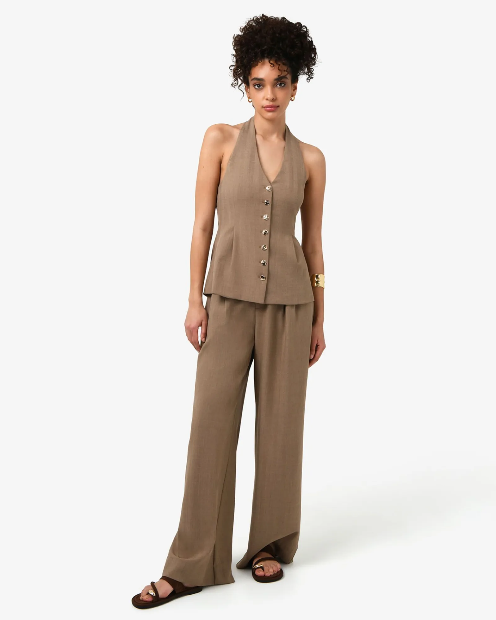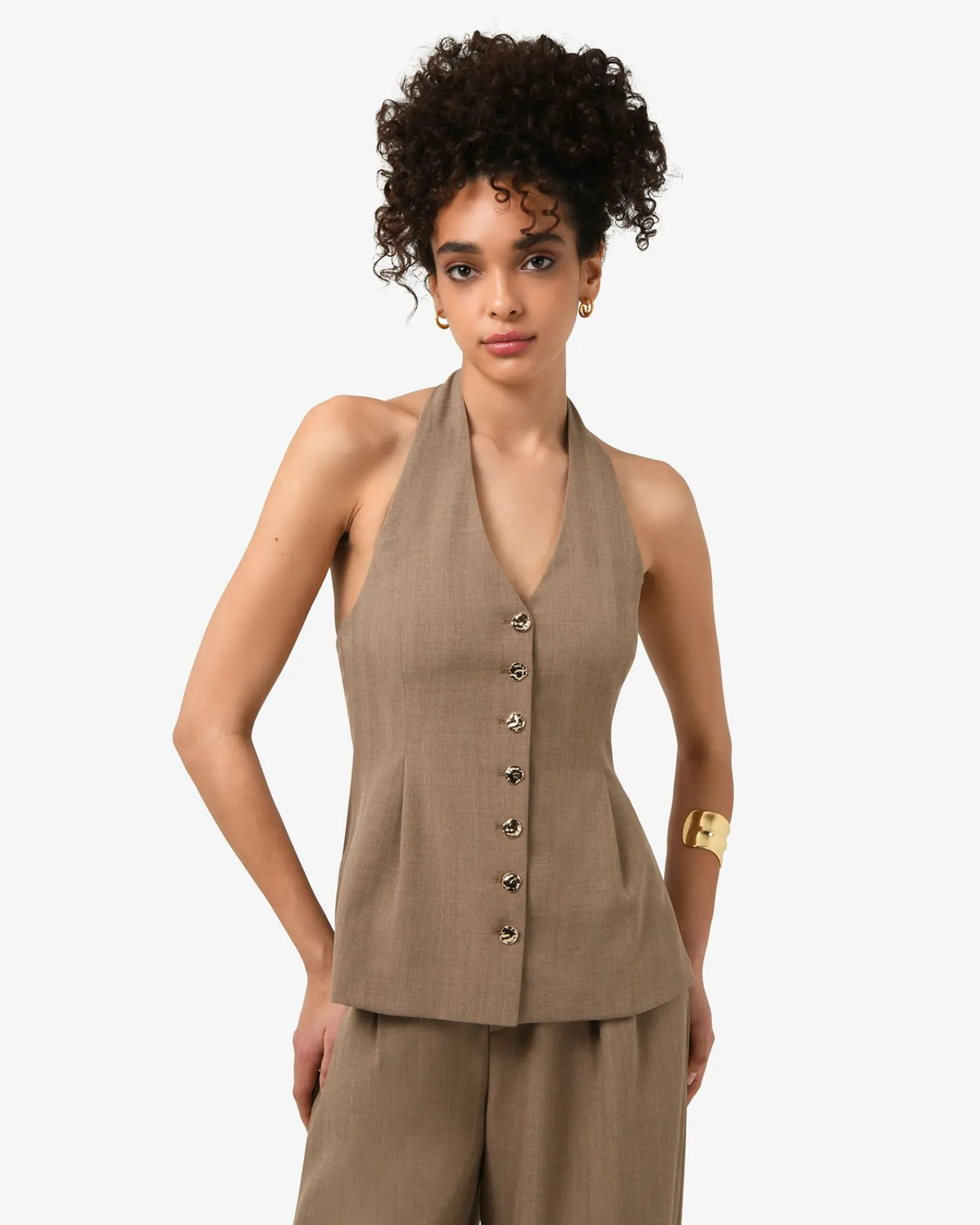 Defined by its halter neckline, the Lola Halter Neck Peplum Vest showcases a fitted waist, subtle flared peplum hem, and gold-toned buttons down the front. Wear as a matching set with the Lola Lurex Blend Wide Leg Pant, or style it with tailored trousers or skirt for a look.