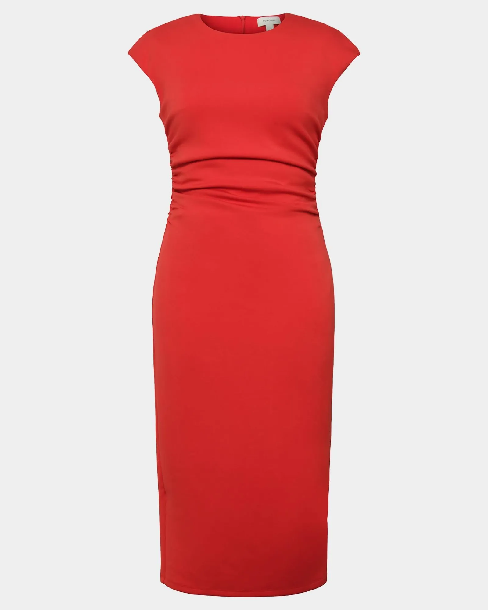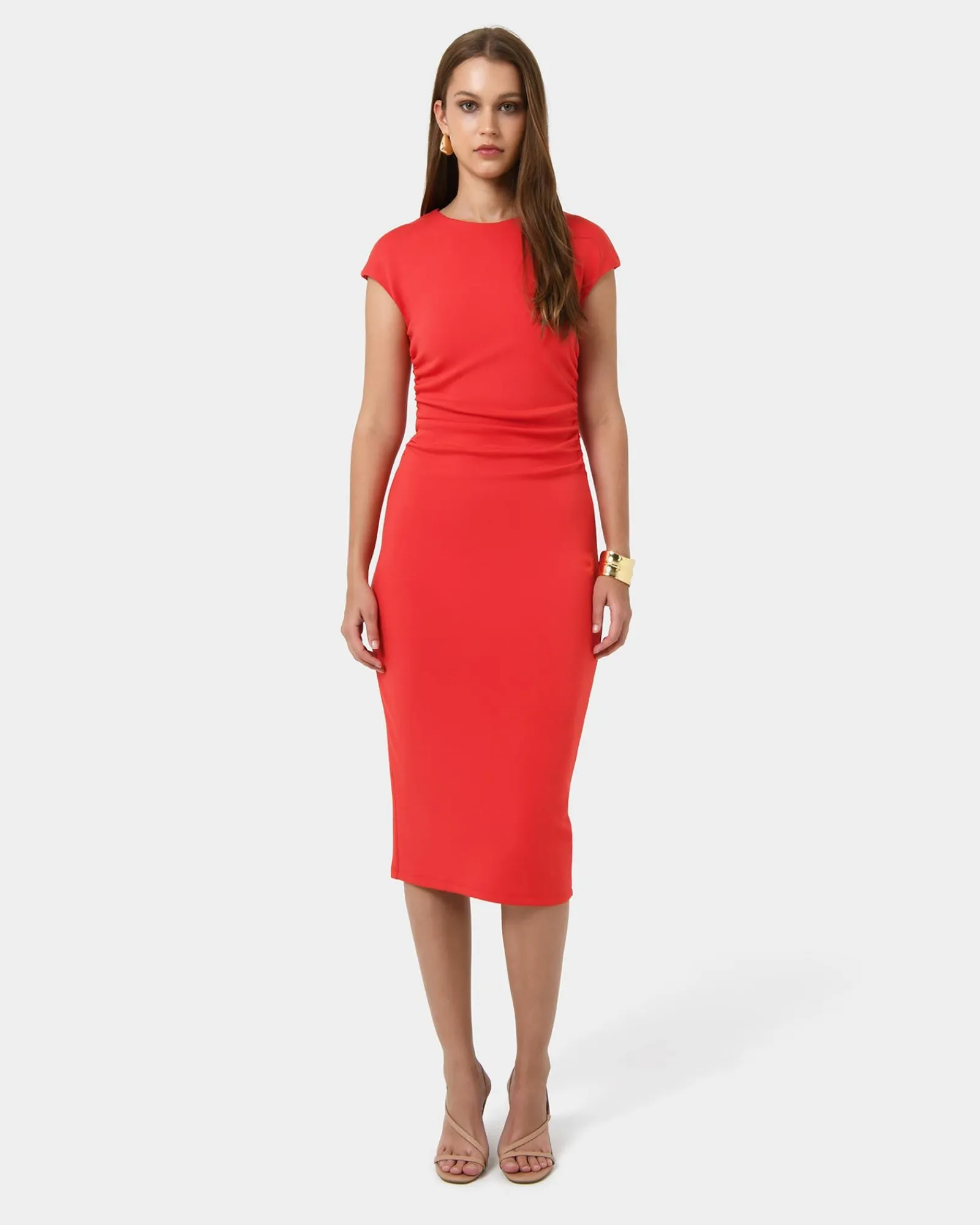 This classic Lulu Ruched Midi Dress is a versatile wardrobe staple that transitions effortlessly from day to night. The flattering silhouette enhanced by delicate ruching exudes femininity, while the cap sleeves offer simple elegance. Wear it with flats for a polished daytime look, or elevate it with strappy heels and statement accessories for an evening look.
