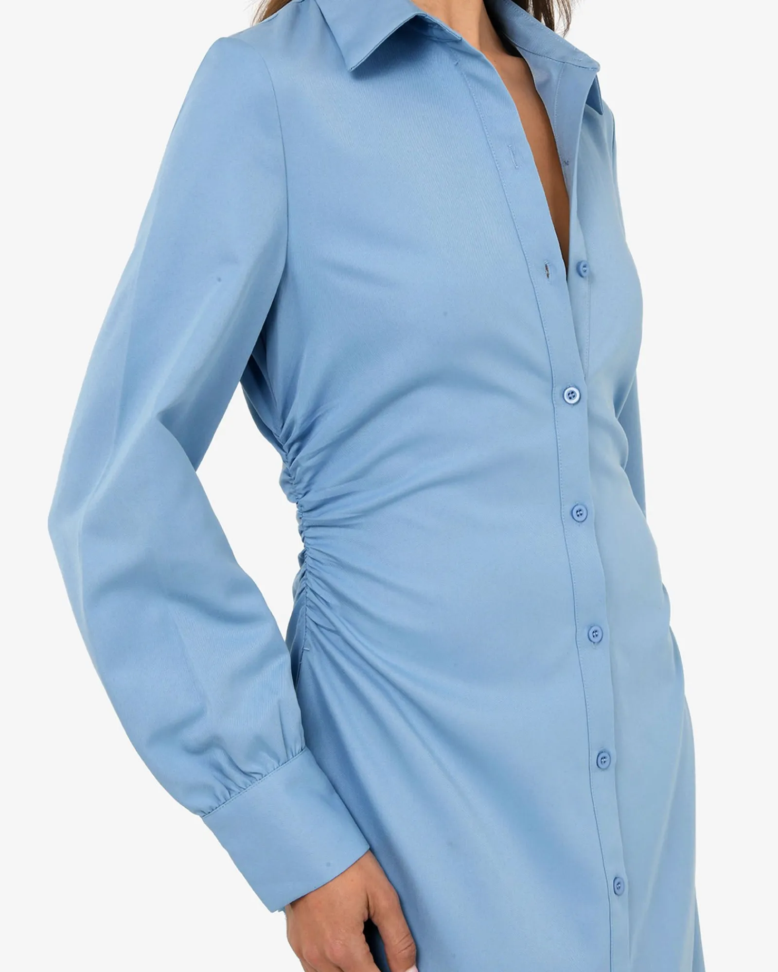 The Lune Ruched Shirt Dress cinches at the waist with delicate side ruching, highlighting your shape while offering all-day comfort. A full row of tonal buttons add a refined touch, giving you adjustable coverage from collar to hem. With its structured collar, and a classic shirt dress silhouette, it is a versatile piece – perfect for both your 9-to-5 and weekend wear.