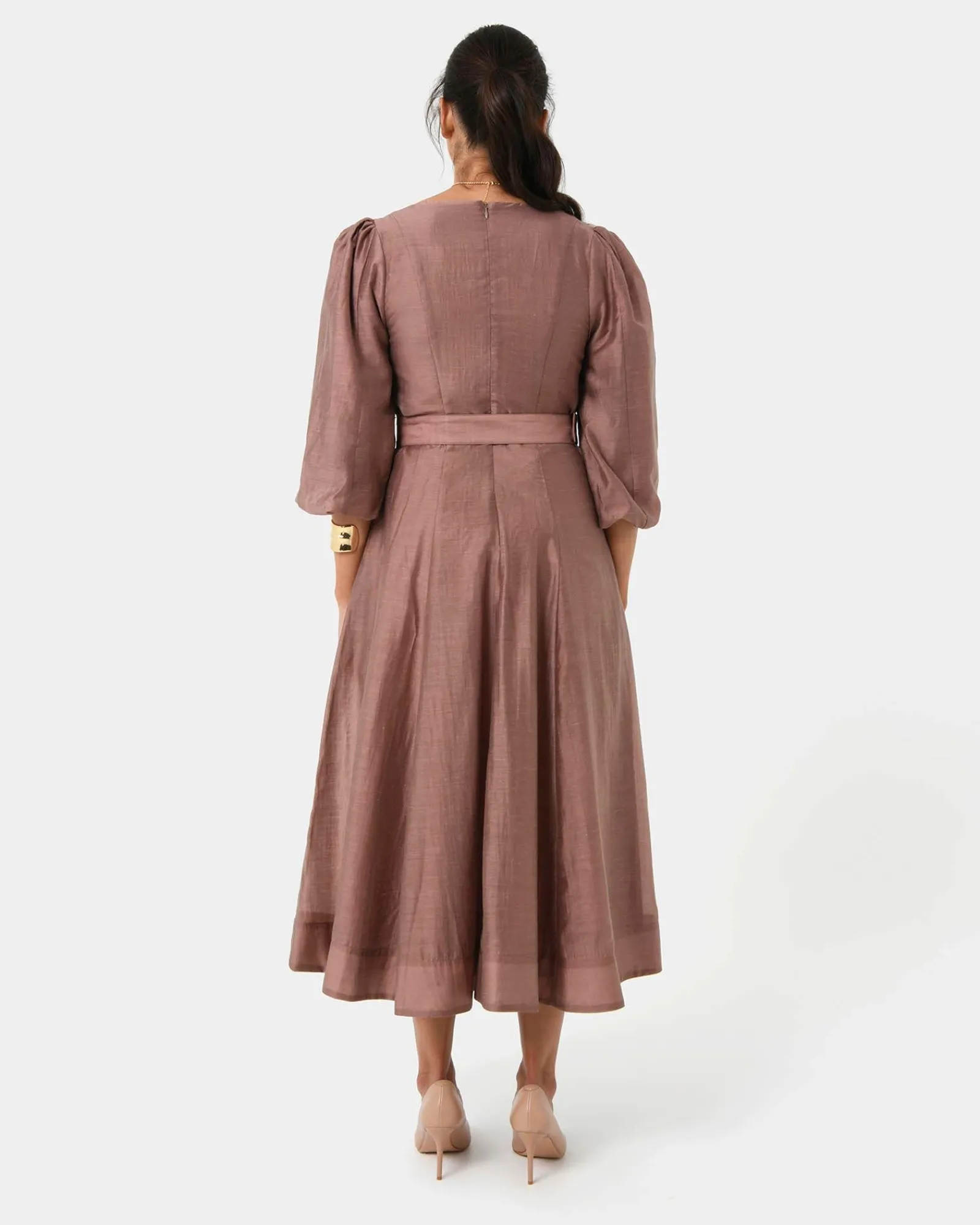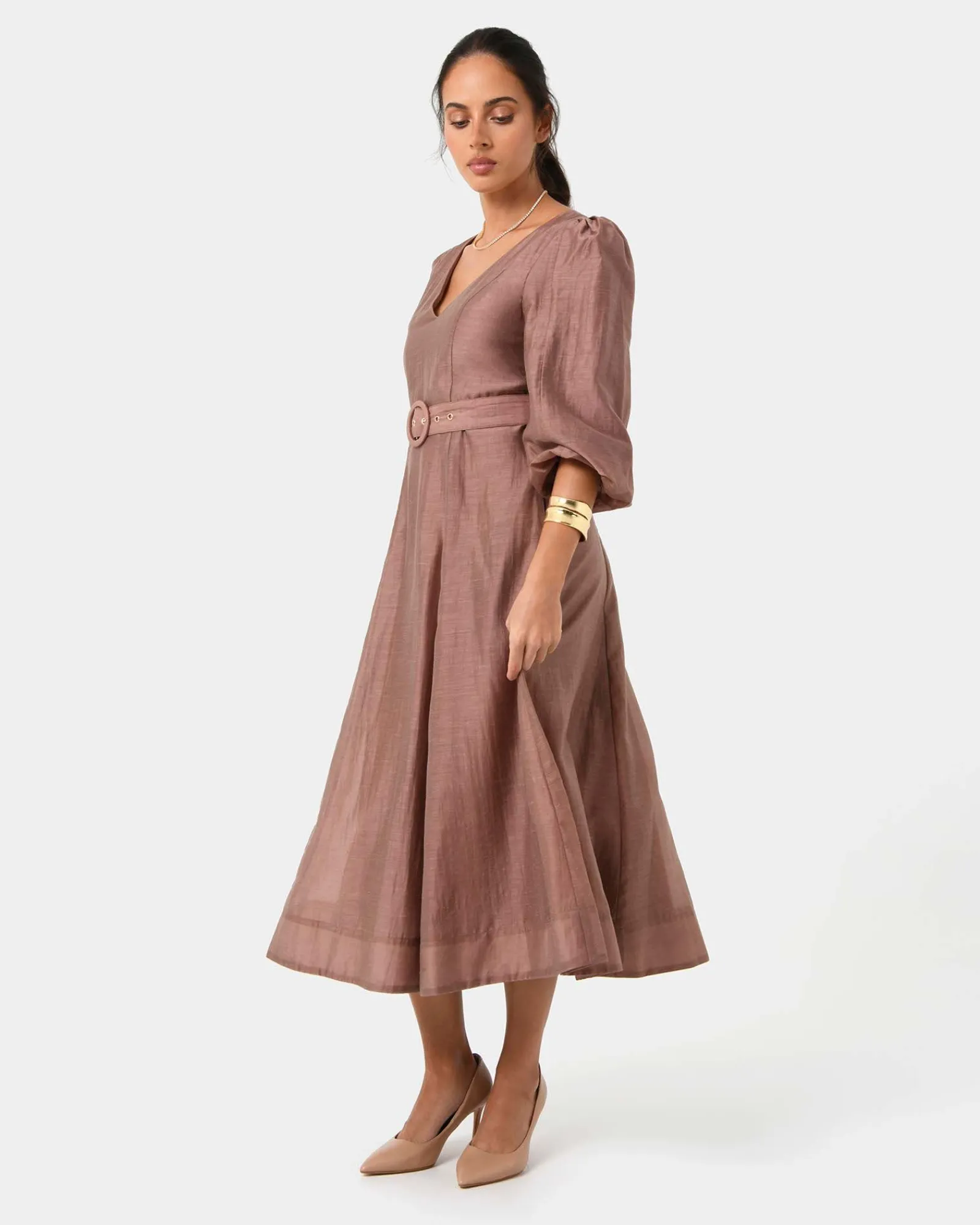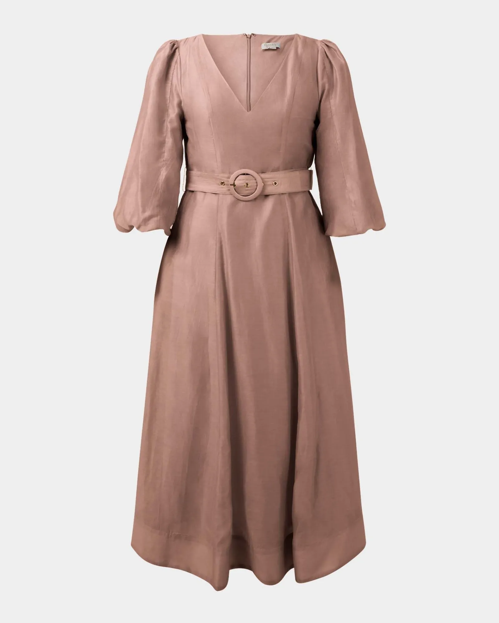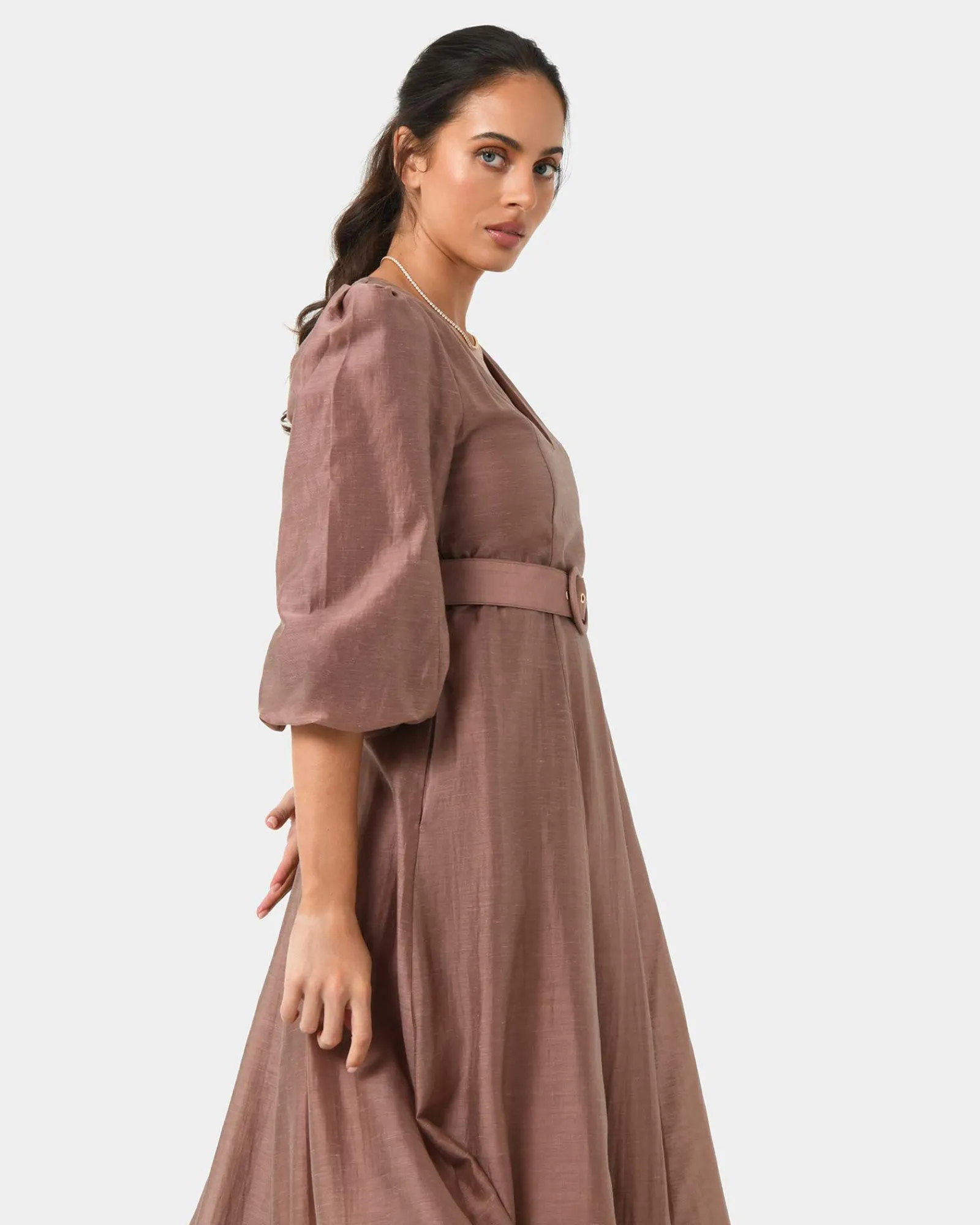 The Marlie Puff Sleeve Midi Dress is a timeless yet modern piece. Designed with a flattering V-neckline, soft puff sleeves, and a flowing A-line skirt, it offers both elegance and comfort. The matching self-covered belt cinches the waist, highlighting a delicate round buckle. Style it with heels and subtle accessories for an effortlessly chic look, whether for brunch, a special event, or an evening out.