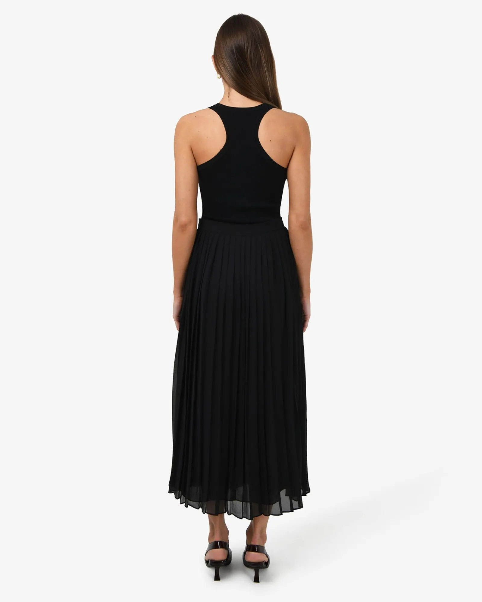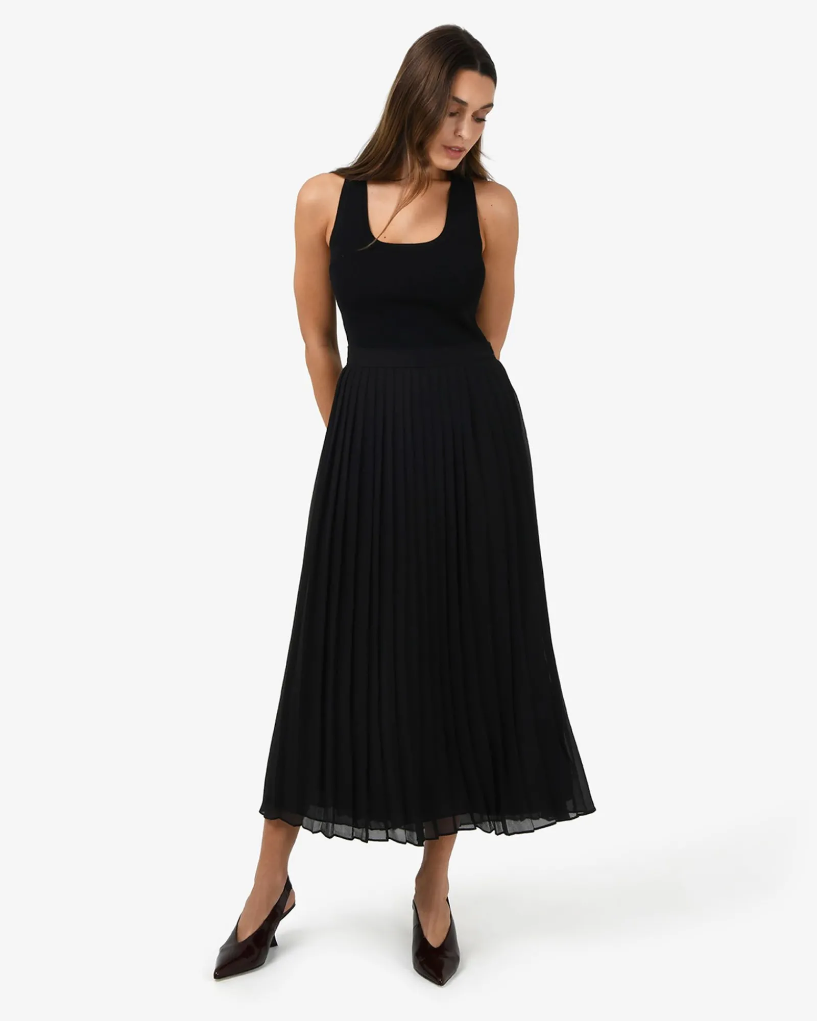 The Melina Pleated Skirt features knife pleats that create volume and movement across a straight silhouette. Designed from lightweight, semi-sheer chiffon with a touch of stretch and fully lined for comfort, it has a fixed waistband with an invisible side zipper closure. A versatile wardrobe piece, it pairs effortlessly with tops or blouses for a chic look from day to night.
