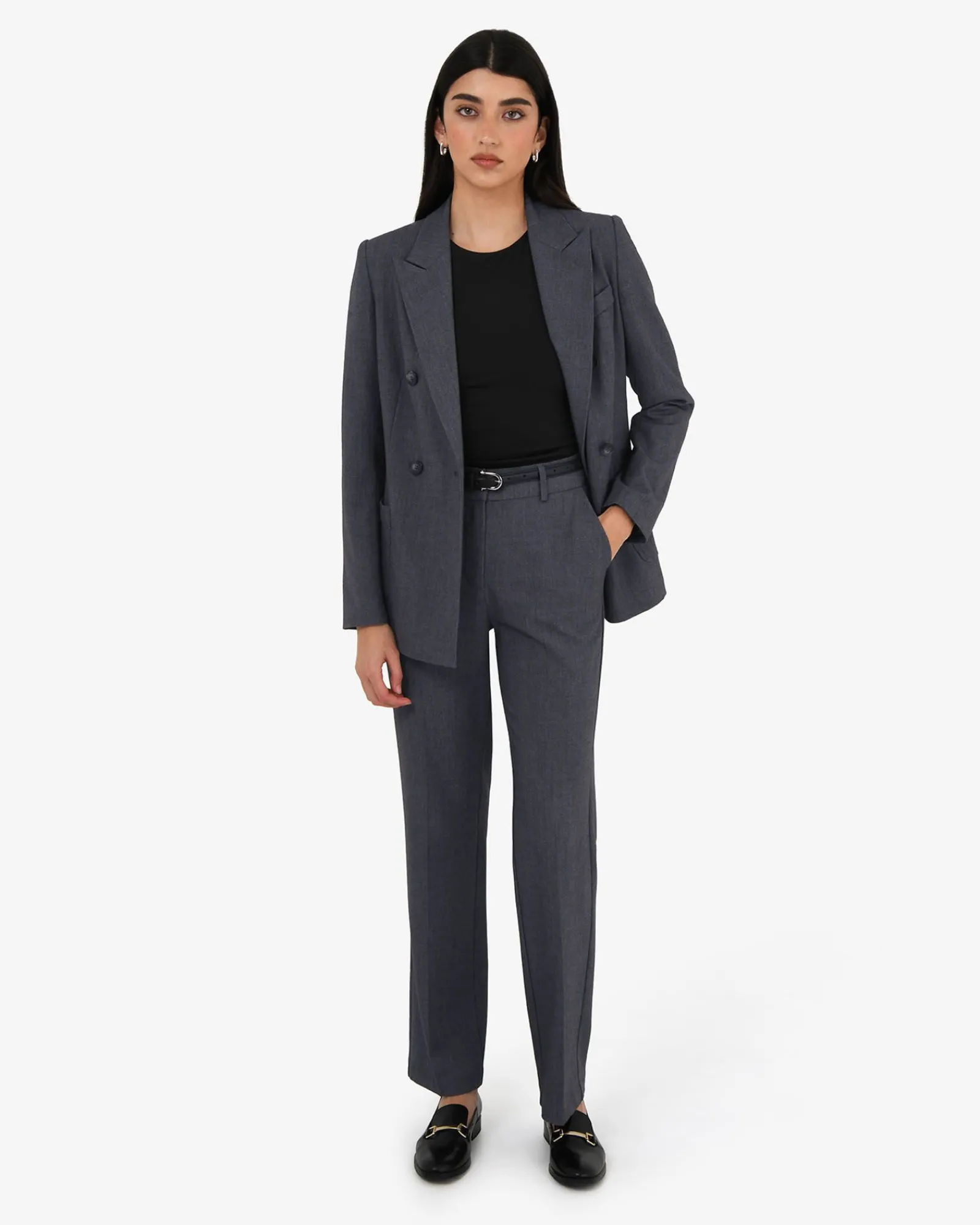 Smart and sleek, your everyday power pants. The Merid Tailored Pants bring ease to professional dressing with a clean, straight-leg silhouette structured feel. Featuring a fixed waistband, belt loops, and functional pockets, pair them with the matching Merid Double Breasted Blazer for a sharp set, or dress them down with a relaxed knit and loafers for effortless weekday style.
