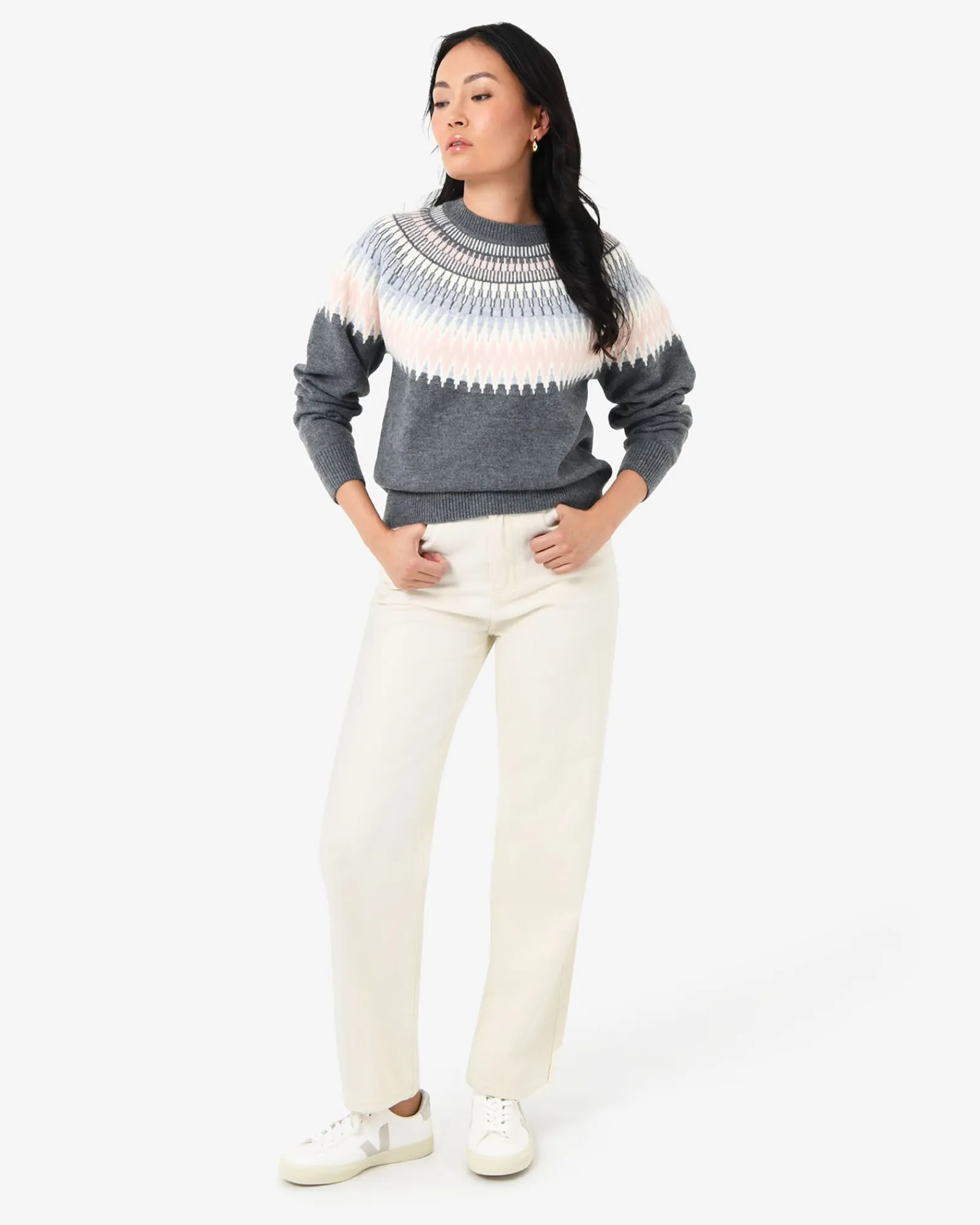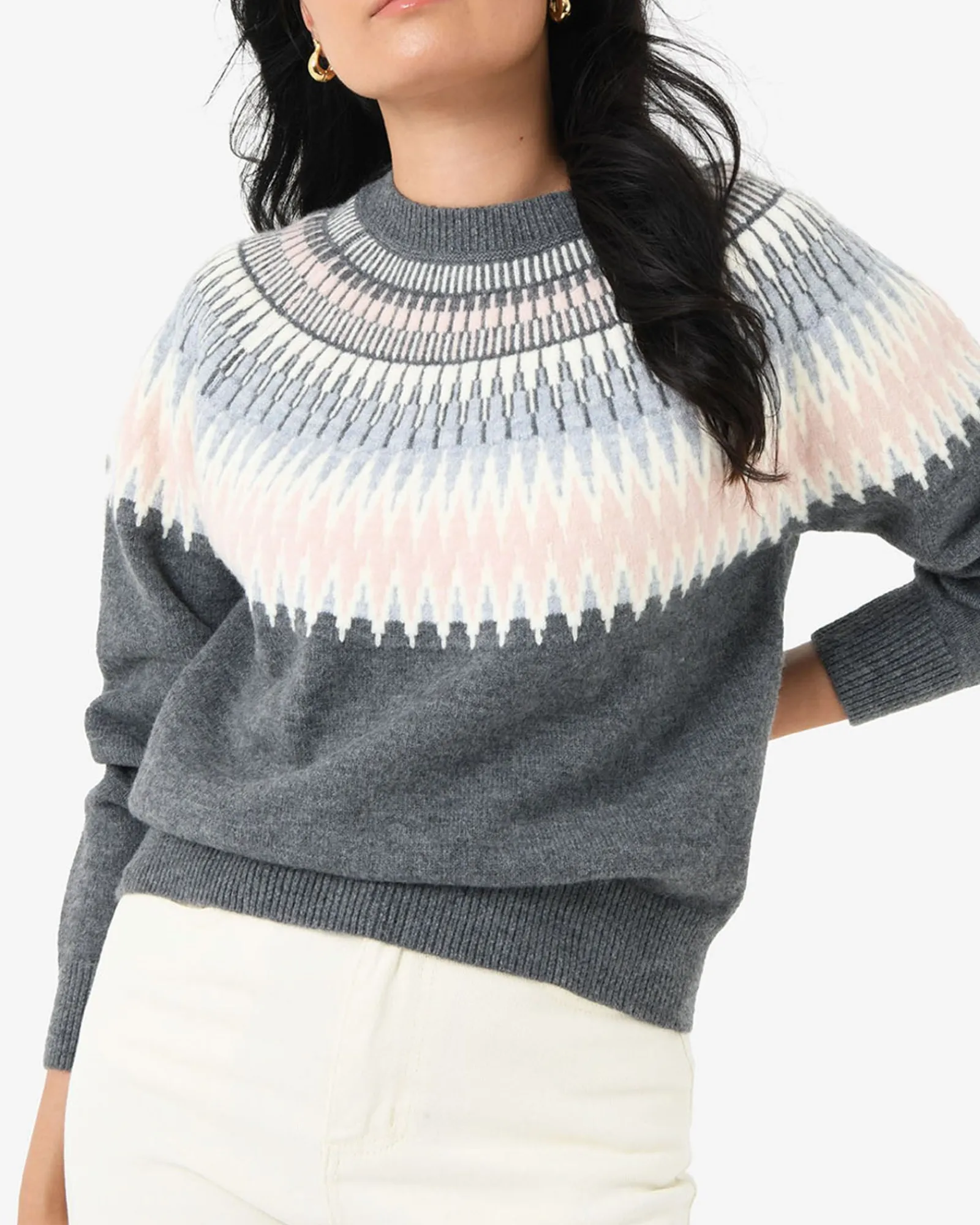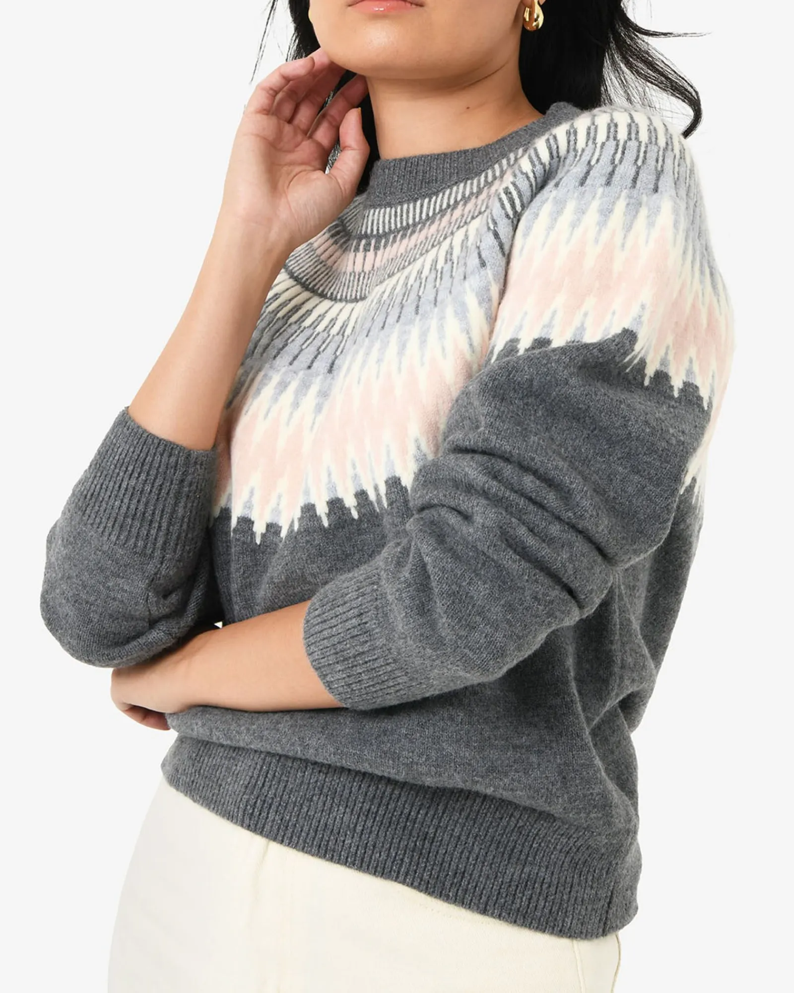 Cozy up in the Natasha Fair Isle Sweater, where soft shades of pink, grey, and off-whites form an intricate geometric pattern. Gracefully framing the neckline and shoulders, the design blends elegance with everyday comfort.