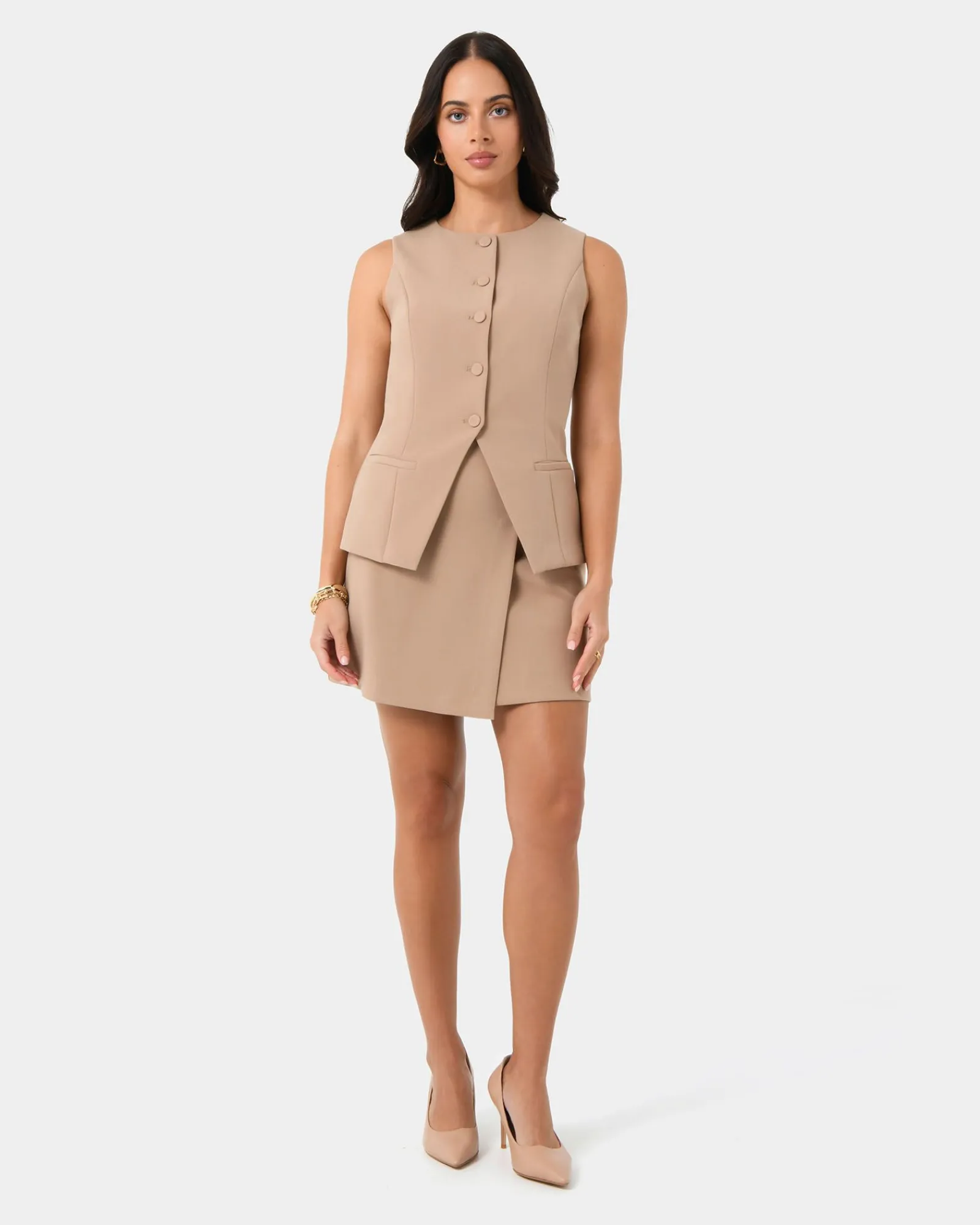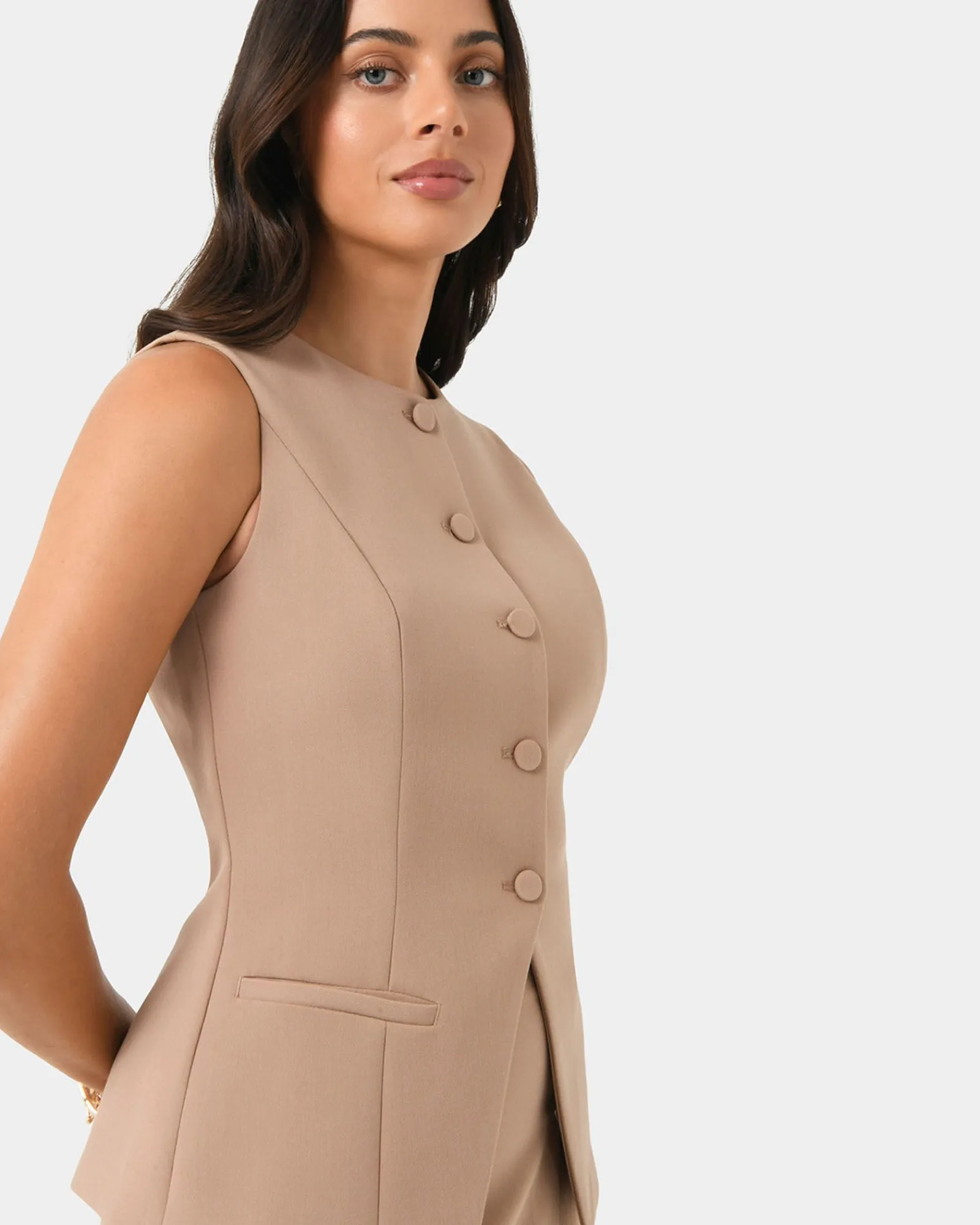 Stay sharp and stylish in this Nikki Longline Vest. Its tailored design and premium fabric make it perfect for work or casual outings. Complete the look by pairing it with the matching Nikki Tailored Wide Leg Pants.