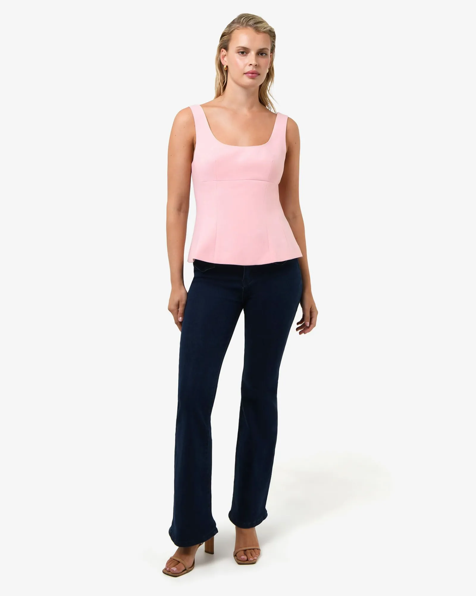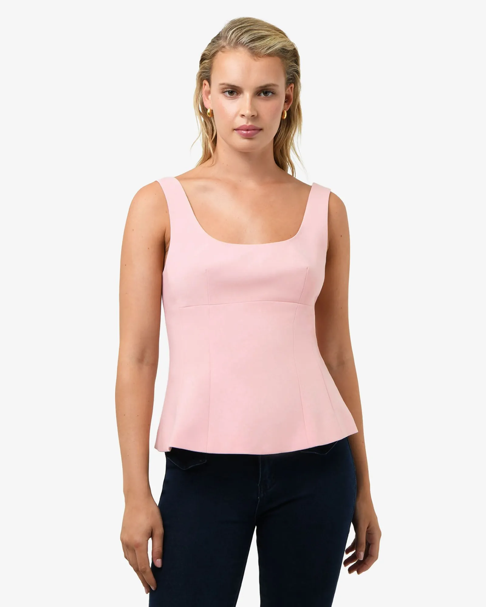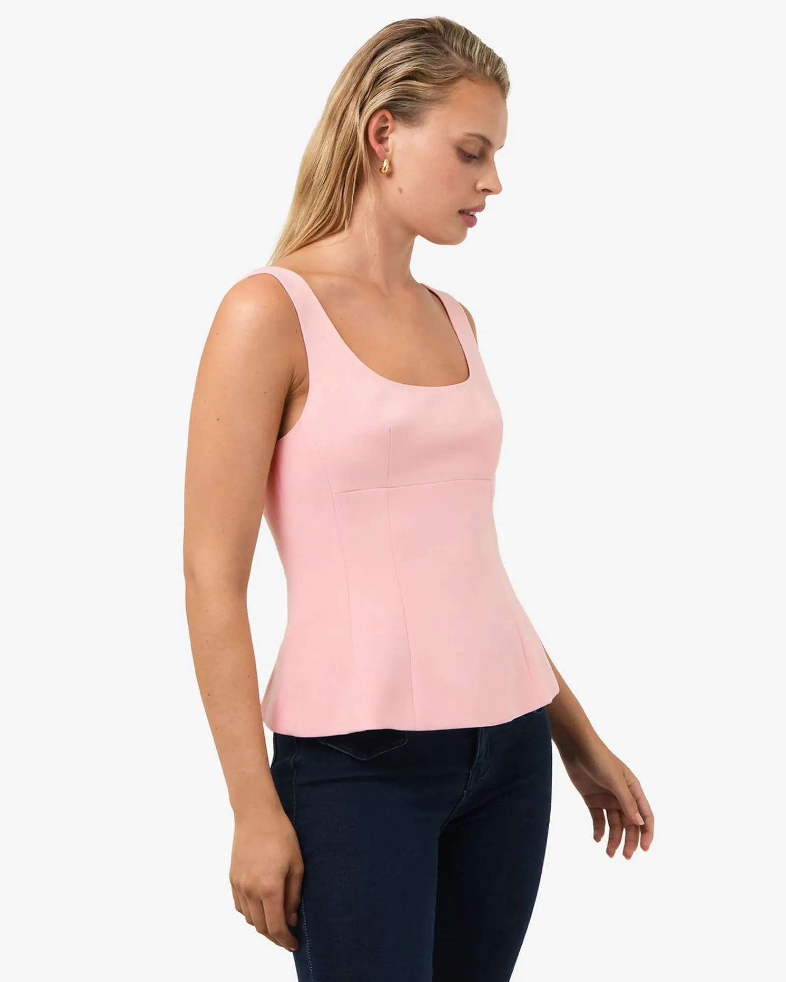 Enhance your silhouette with the Nikki Peplum Top. Designed with a fitted shape through the hips that flows into a softly flared peplum hem, this sleeveless top offers a flattering finish. With its scoop neckline, lightweight structured fabric, it’s a polished and versatile piece – perfect for work or special occasions.
