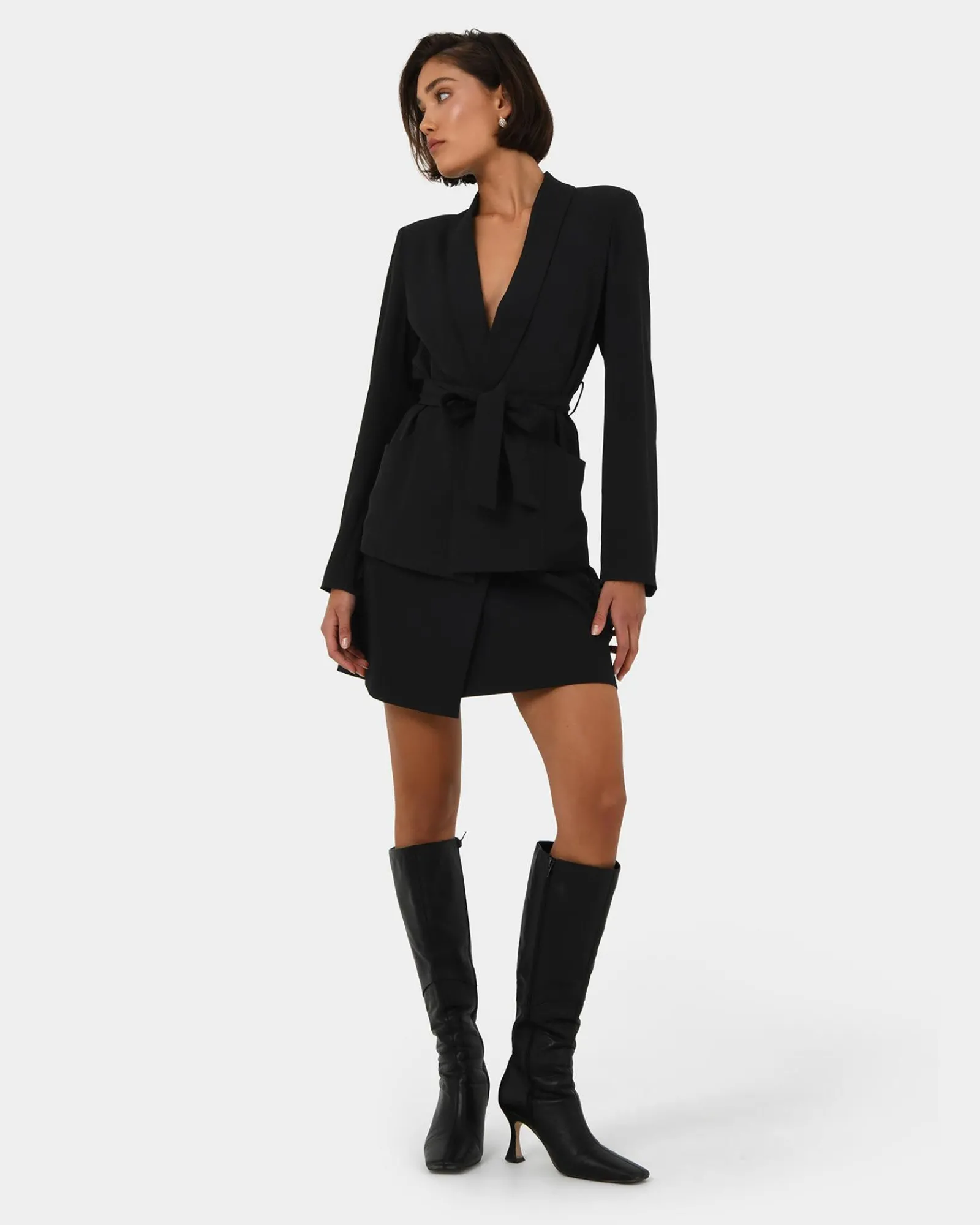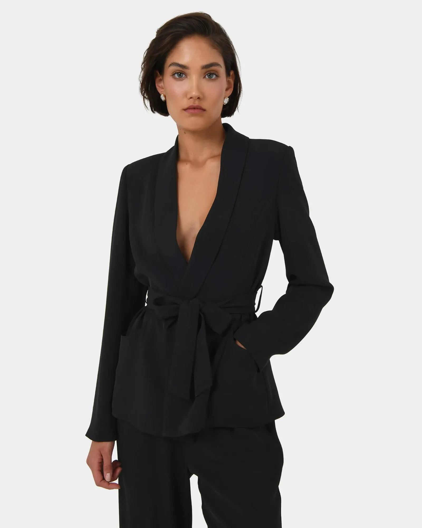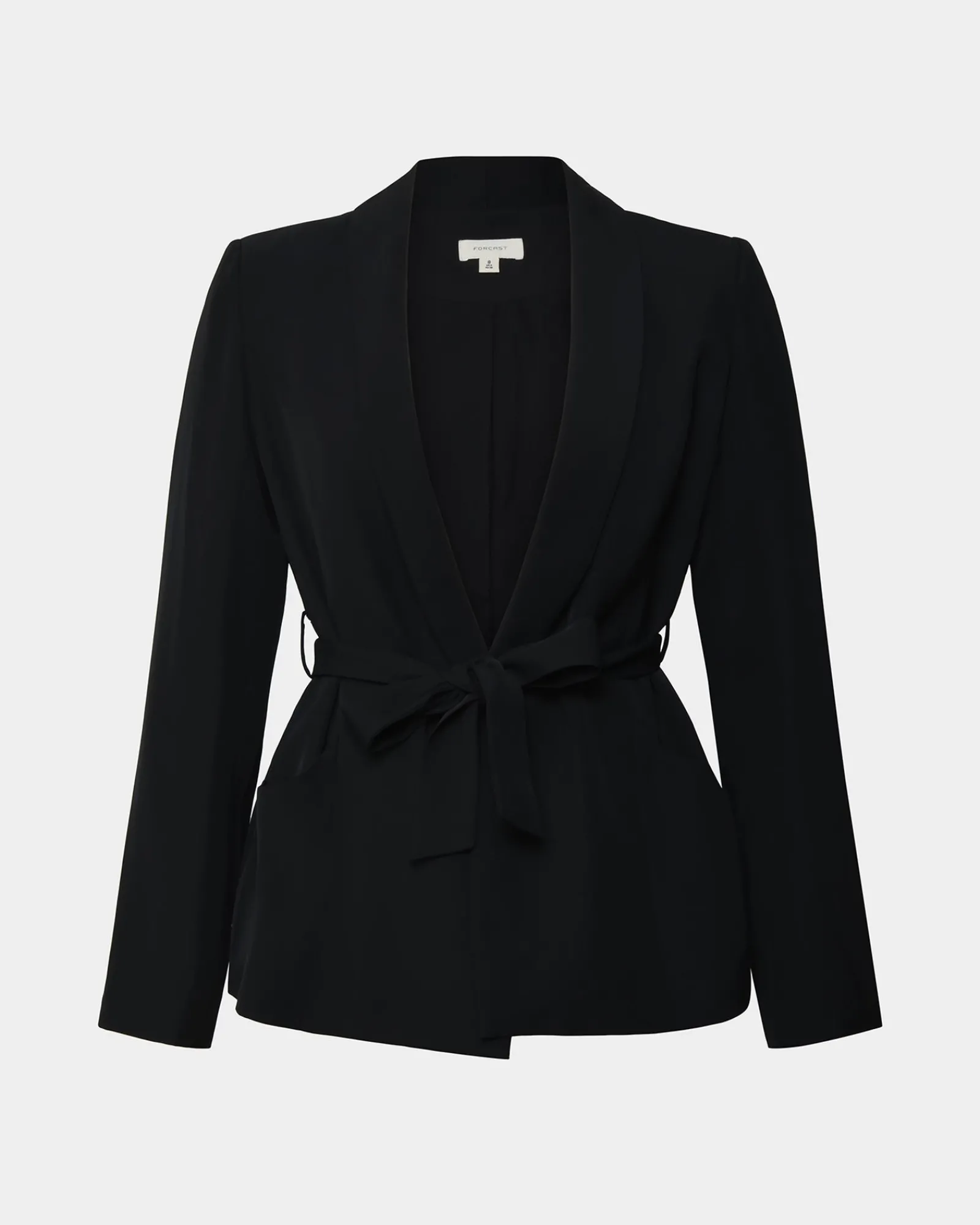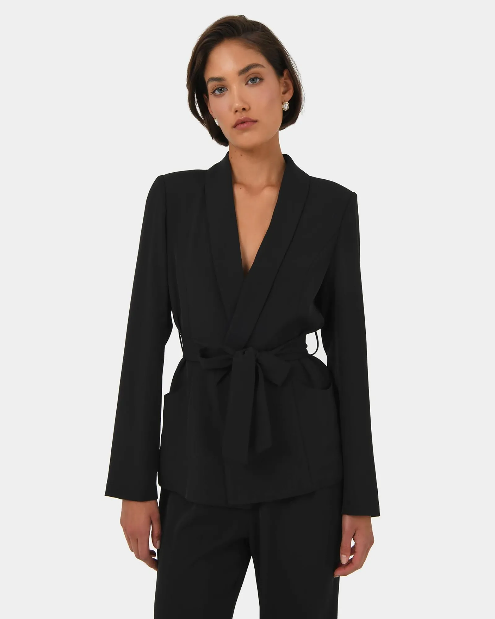 The Rain Belted Blazer is a chic and versatile piece with a matching belt at the waist. It features shawl lapels and functional pockets, making it perfect for both work and casual outings.