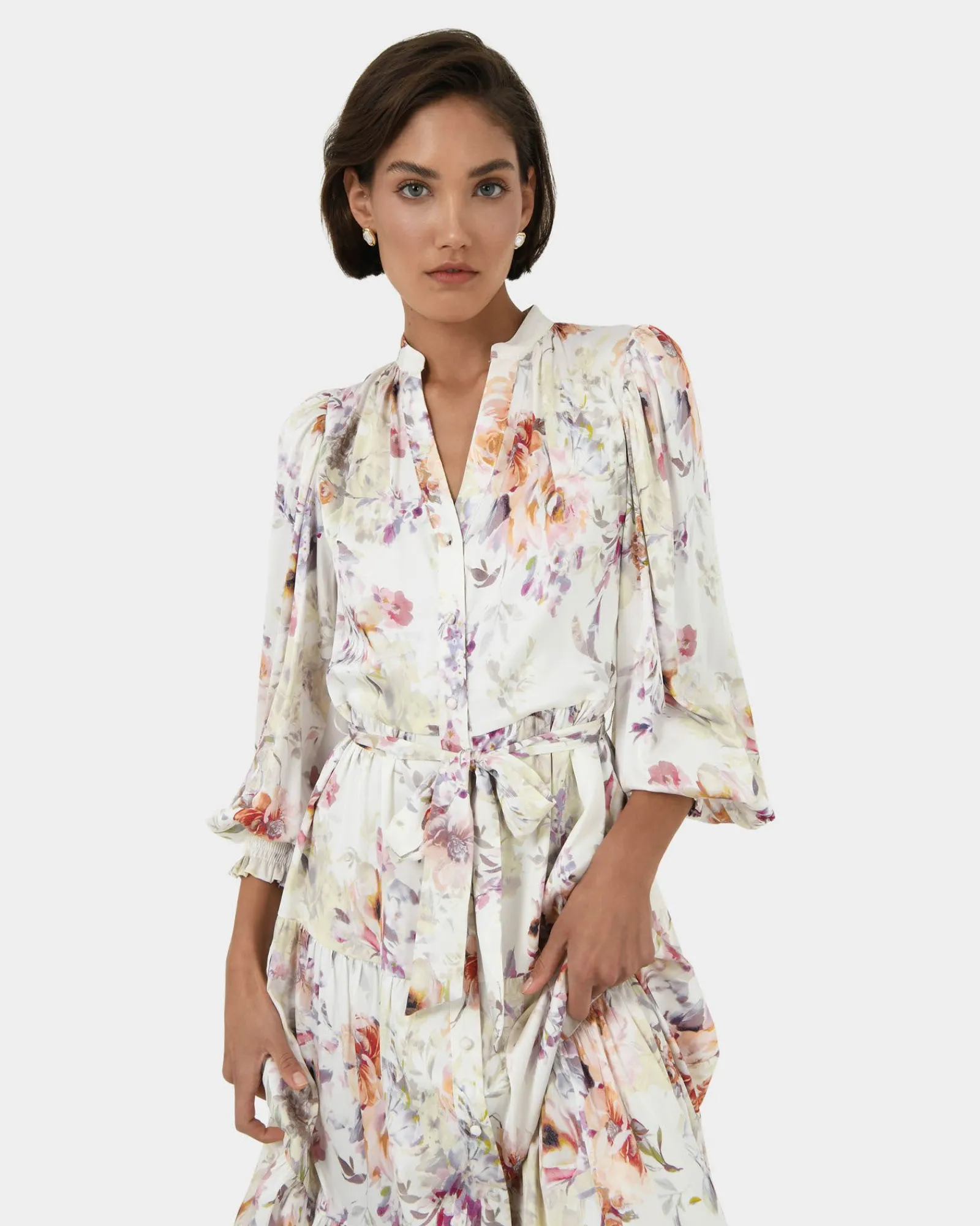 - Long bell sleeves with shirred cuffs