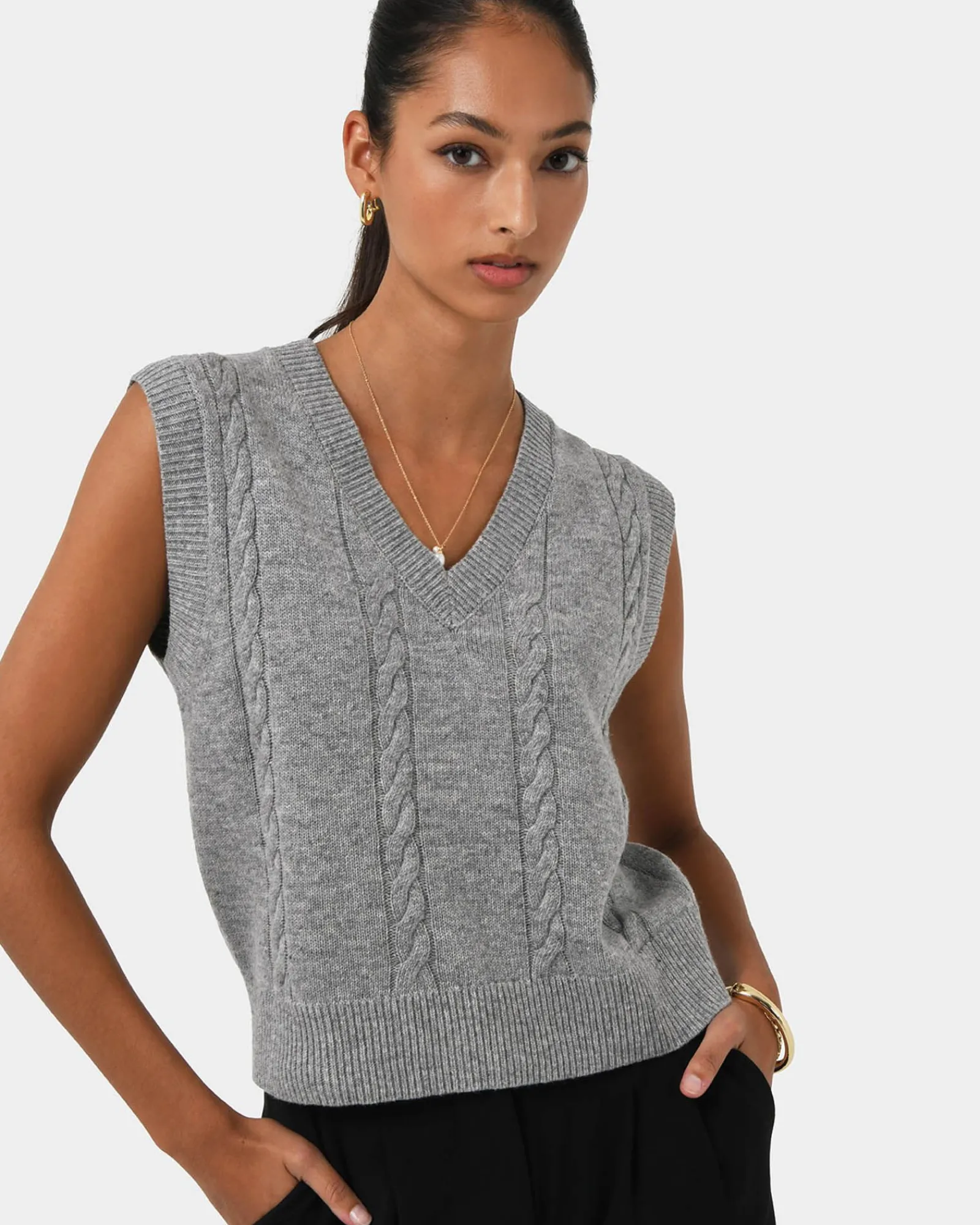 Perfect for effortless layering, the Rulia V-Neck Vest features a classic cable knit design with ribbed edges for a refined touch. Made from a lightweight, stretch fabrication, it offers a relaxed fit and a flattering V-neckline for a statement look.