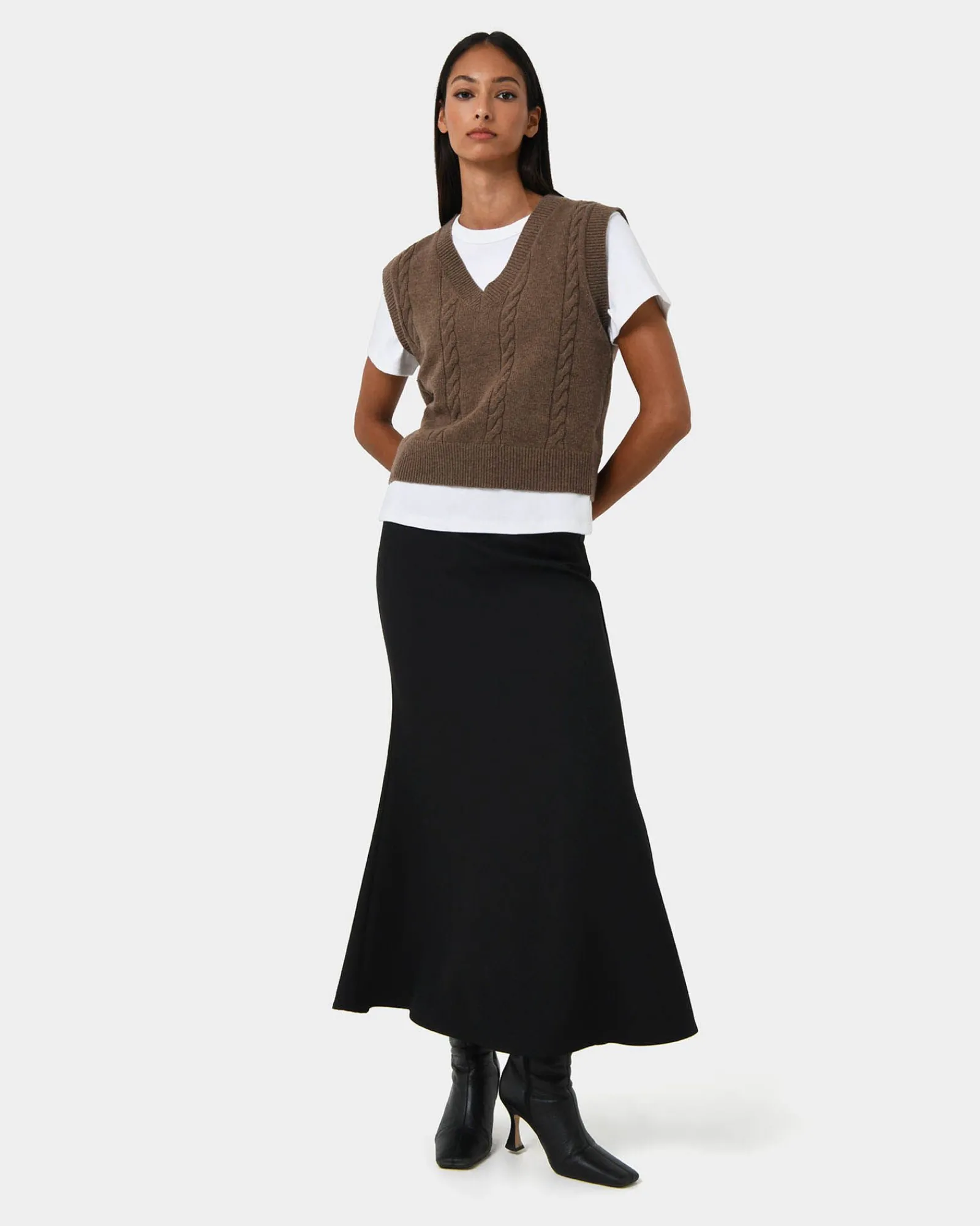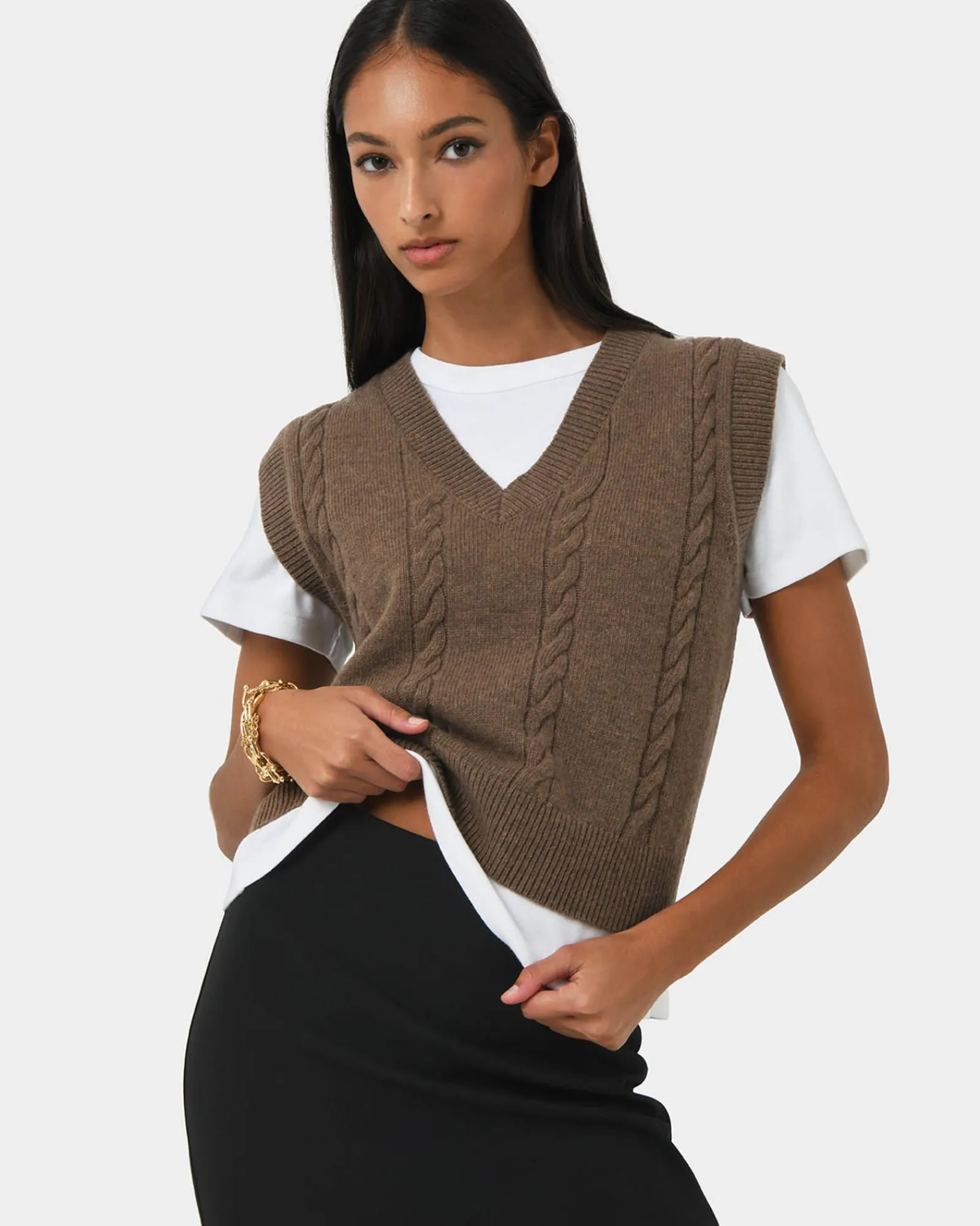 Perfect for effortless layering, the Rulia V-Neck Vest features a classic cable knit design with ribbed edges for a refined touch. Made from a lightweight, stretch fabrication, it offers a relaxed fit and a flattering V-neckline for a statement look.