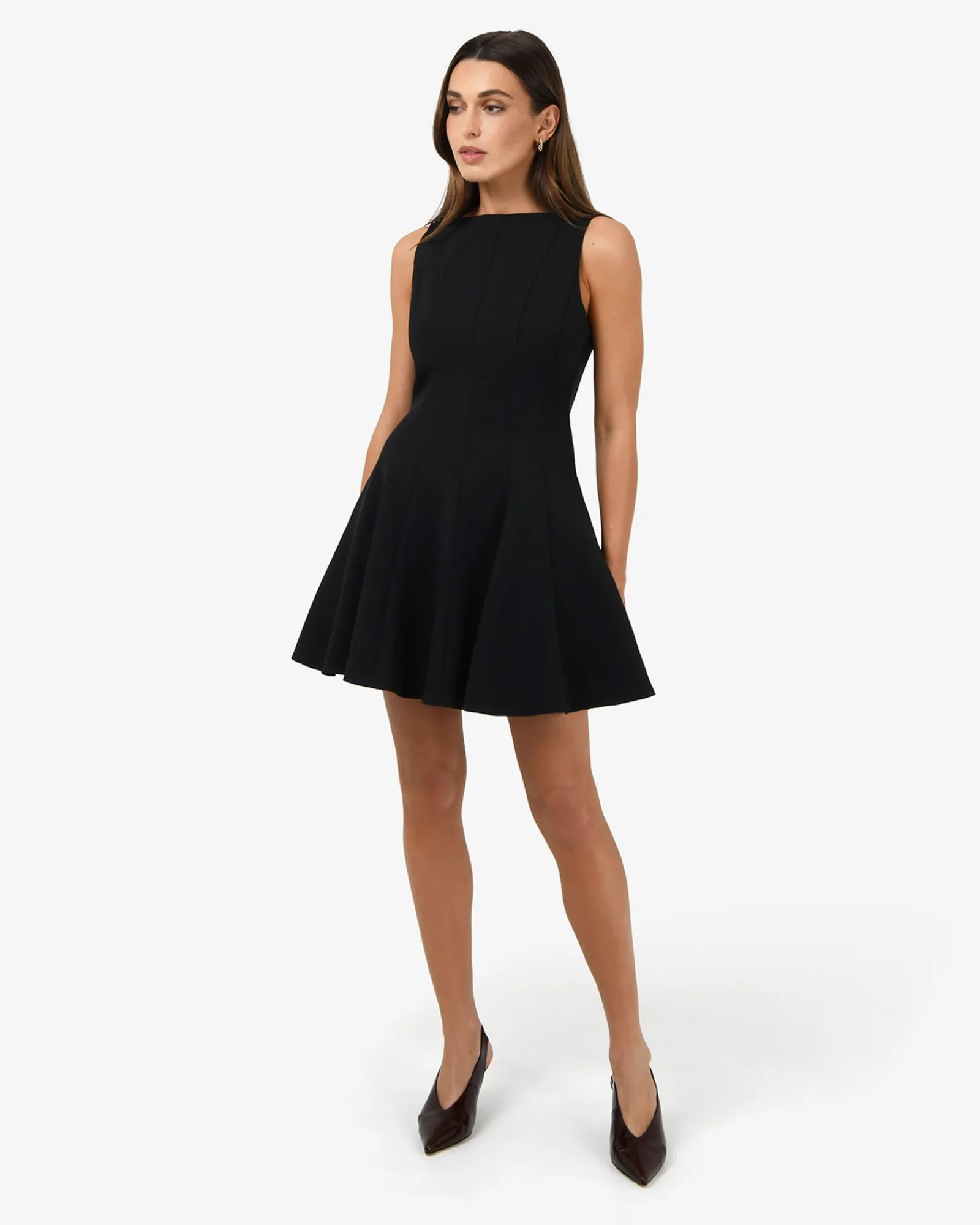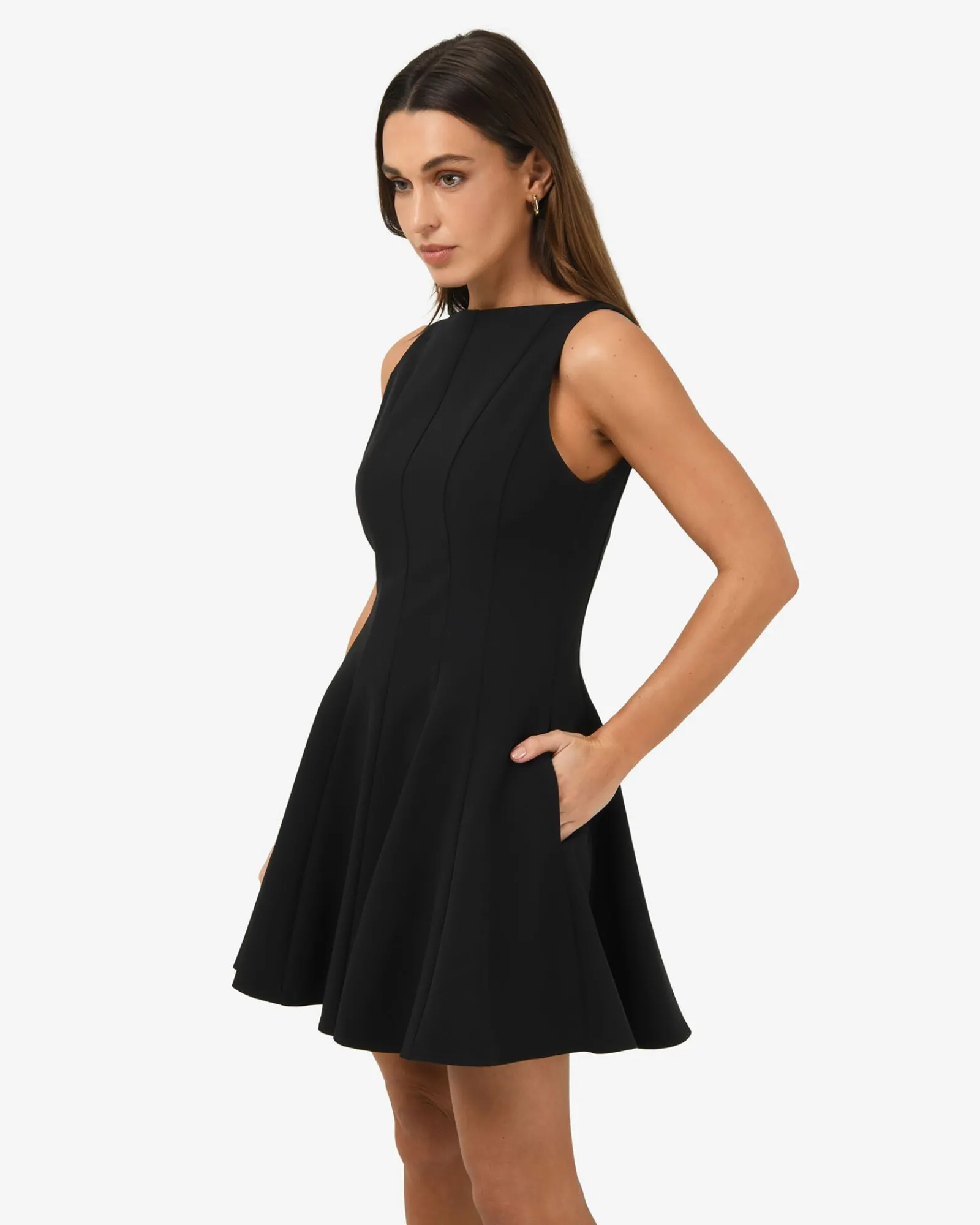 The Sandy Panel Mini Dress is sleek, structured, and effortlessly flattering. Fitted at the bodice and waist with a skater-style skirt, it shapes your silhouette beautifully. Panel details add subtle elegance, while the boat neckline and sleeveless design keep the look contemporary. Perfect for cocktail events, special occasions, or a chic night out.