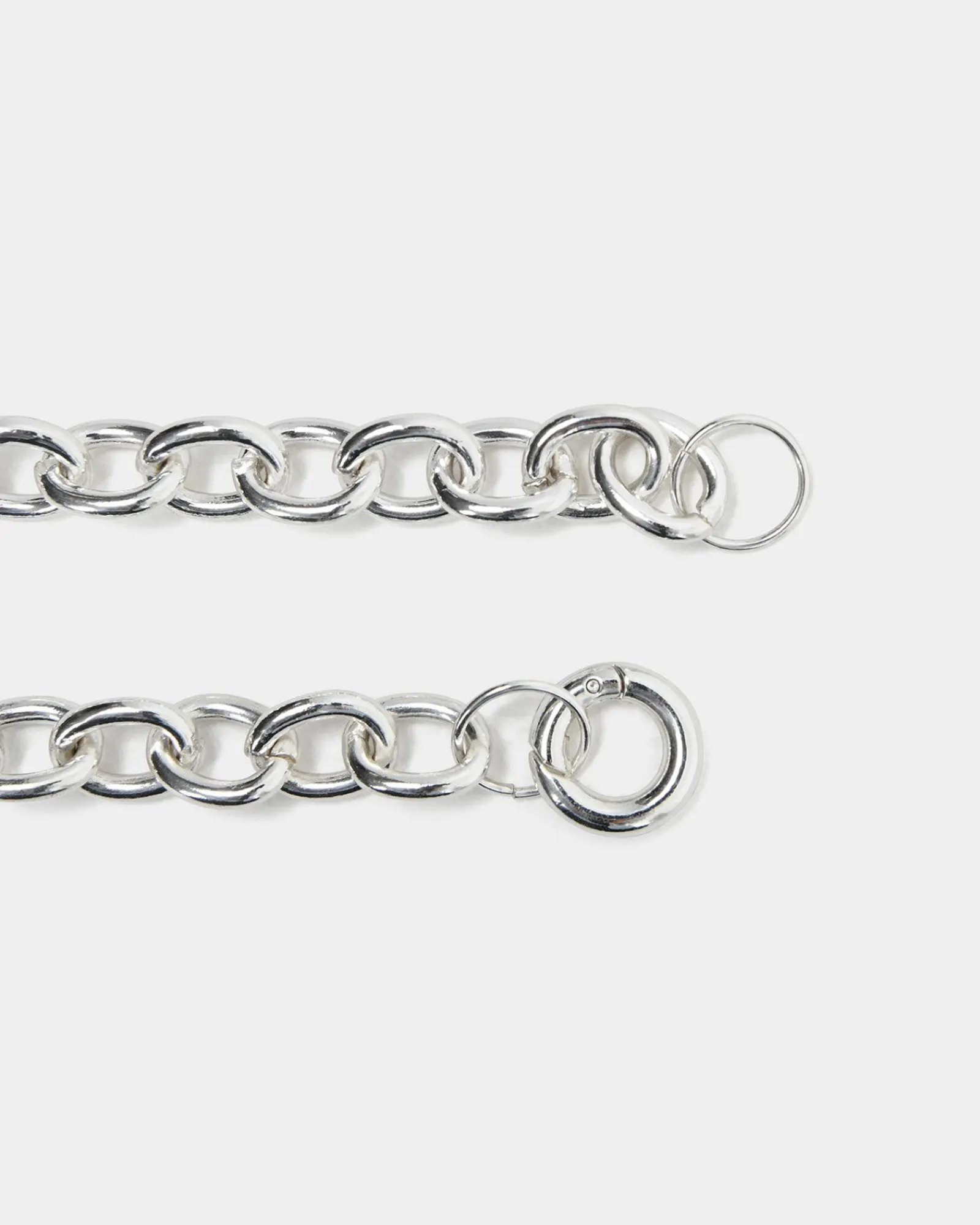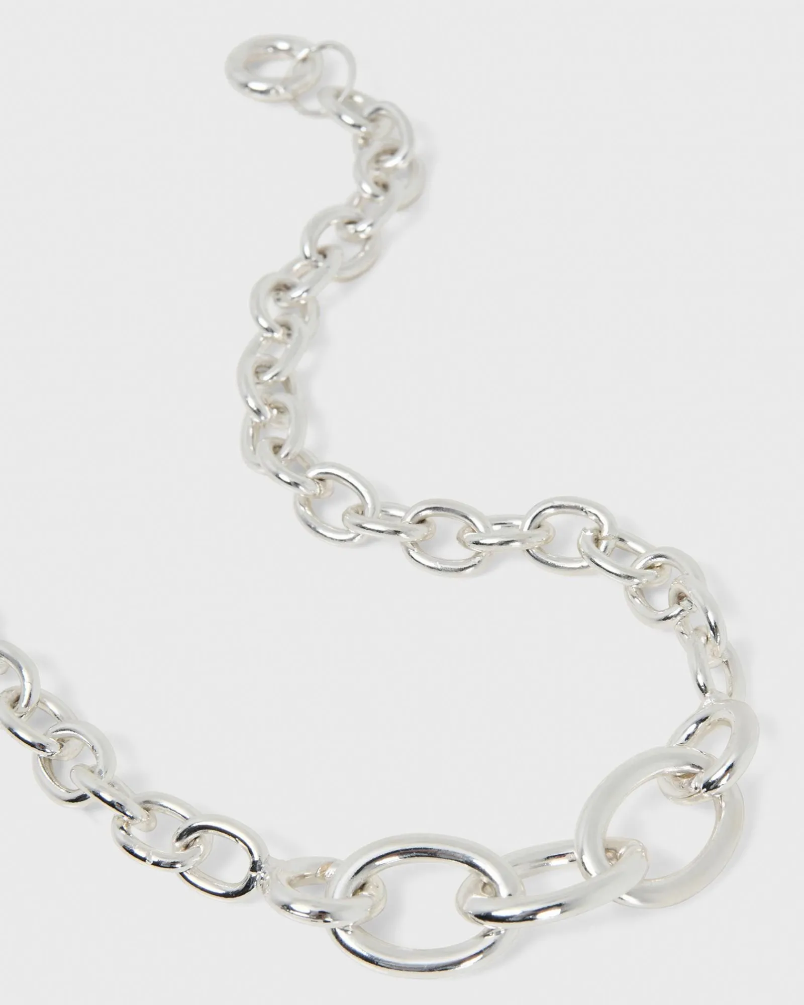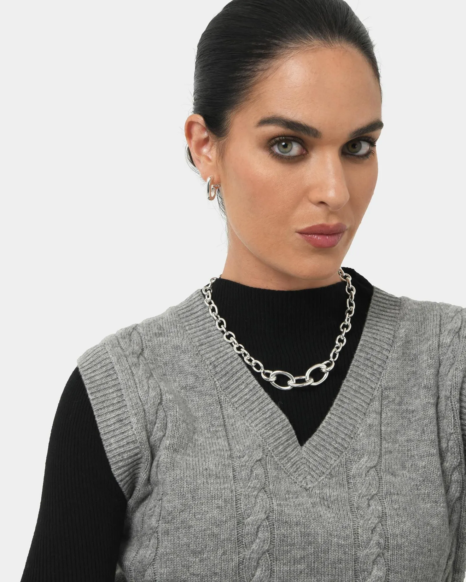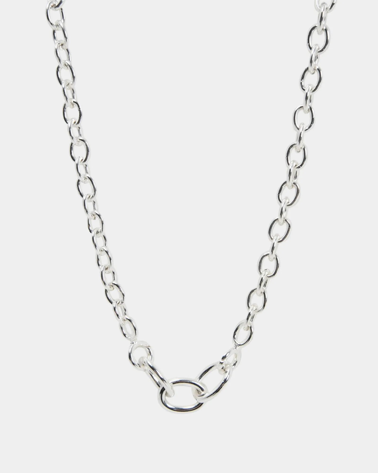 Elevate your jewelry collection with the Witney Chain Necklace, a timeless silver-toned piece featuring a chunky chain link design and a three-interlocked centerpiece for a touch of elegance.