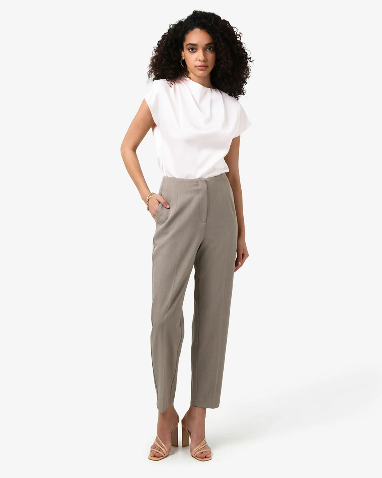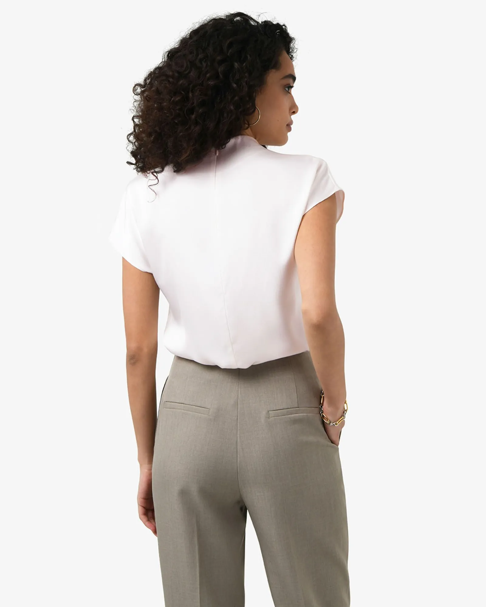 The Zafina Pleated Draped Top features an asymmetric pleated draped neckline, short cap sleeves and an invisible back zipper closure. Designed from lightweight fabric with a subtle sheen, the top can be styled with tailored pants for work or a sleek skirt for evening wear.
