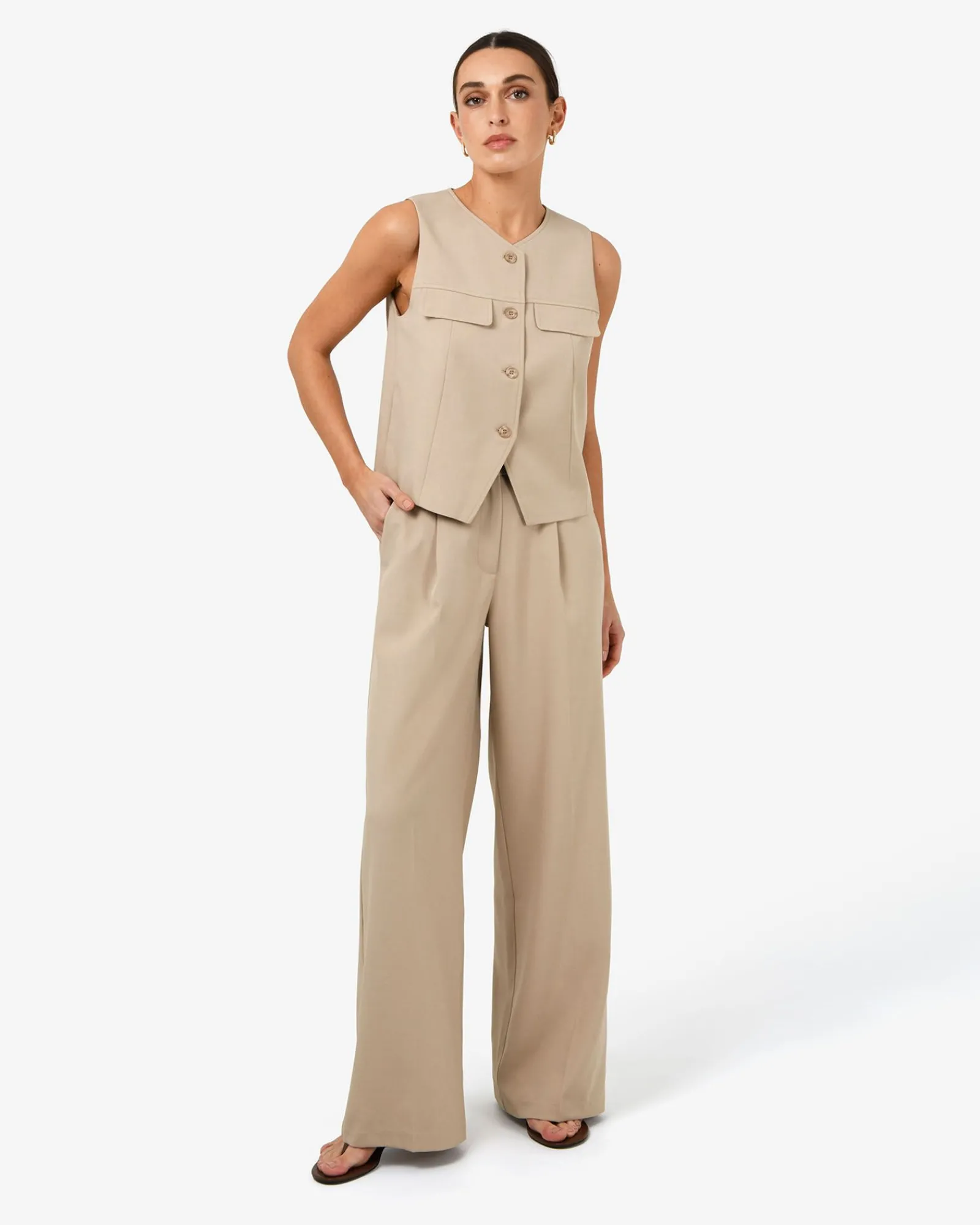 The Abel Straight Leg Pants feature front pleats, a relaxed straight leg cut, and a fixed waistband with decorative buttons for a polished finish. Lightweight with stretch and functional side pockets, they’re effortlessly versatile and can be styled with your essential tops, blouses and cardigans, or ideally paired with the matching Abel Relaxed Pocket Vest.