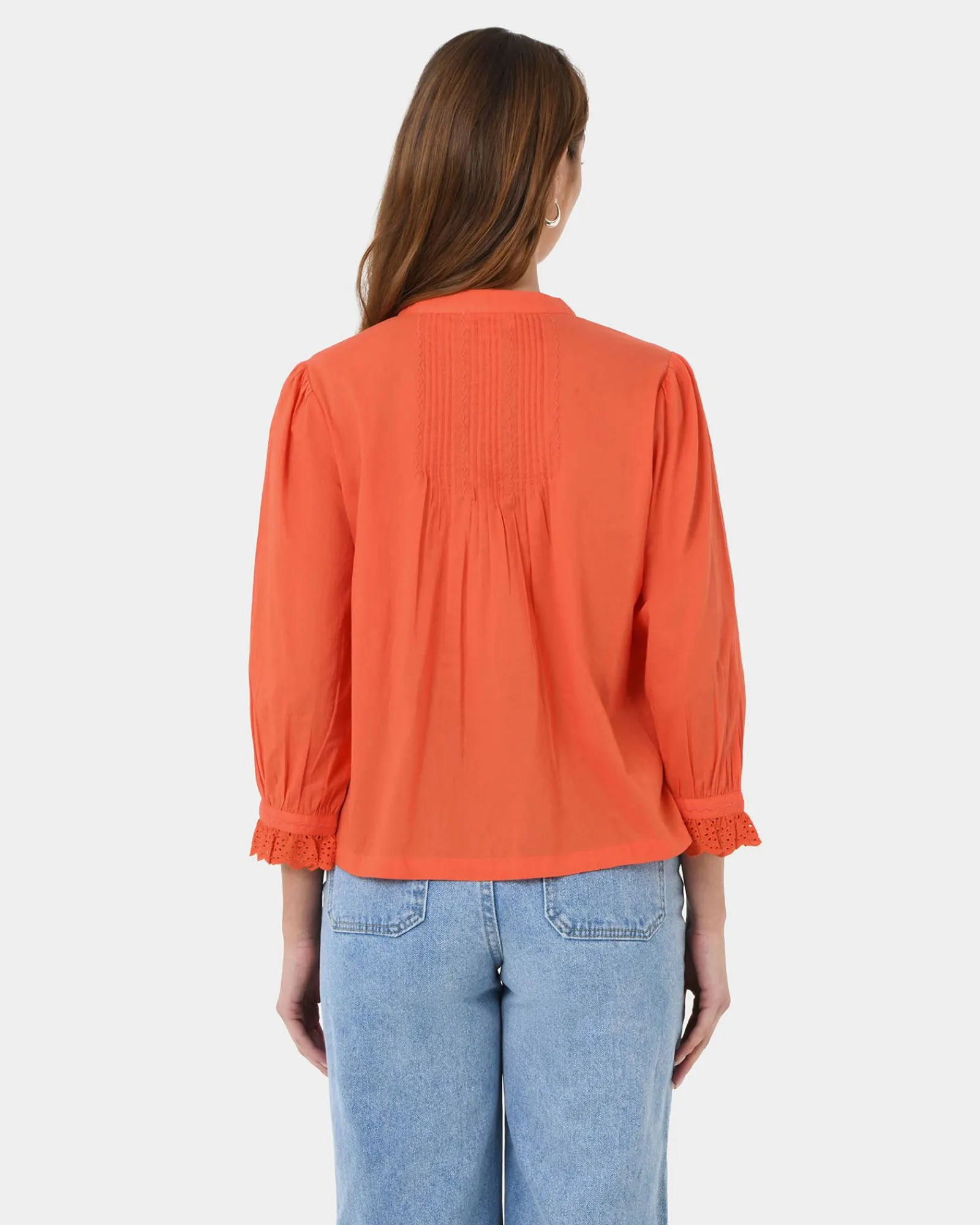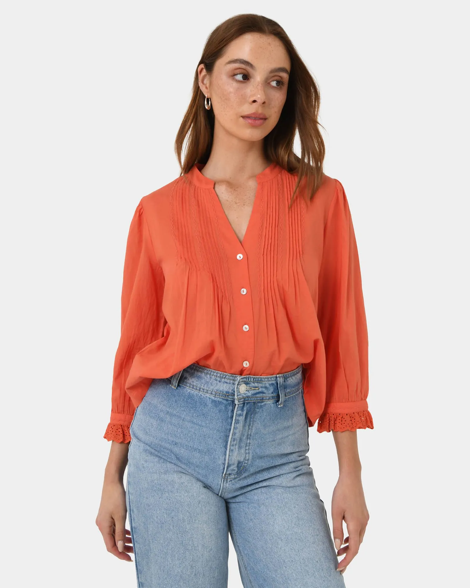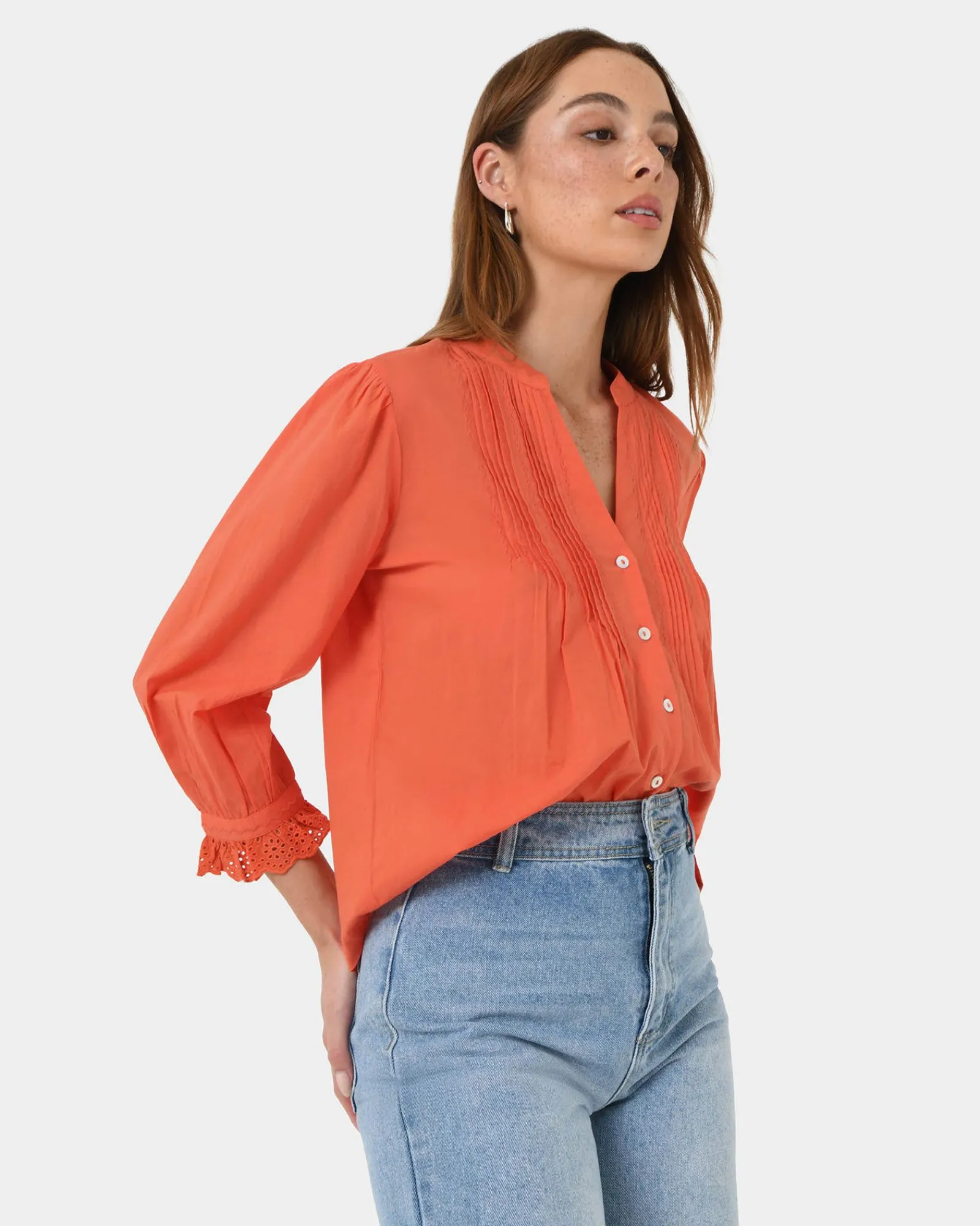 Delicate embroidery meets timeless design in the Akira V-Neck Embroidery Blouse. Crafted in breathable 100% cotton, this blouse brings a touch of elegance to your everyday wardrobe. Perfect for pairing with anything from denim to tailored trousers.