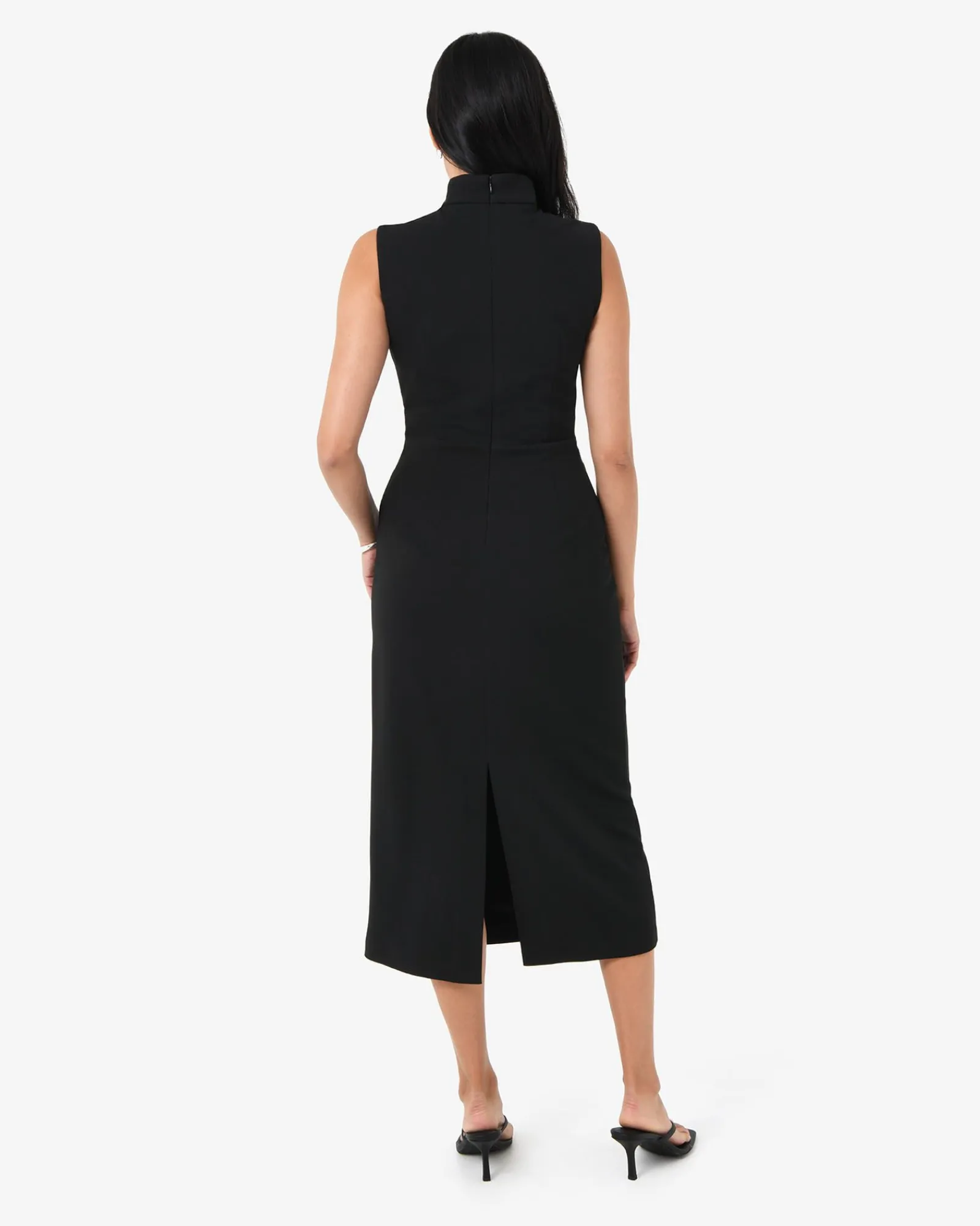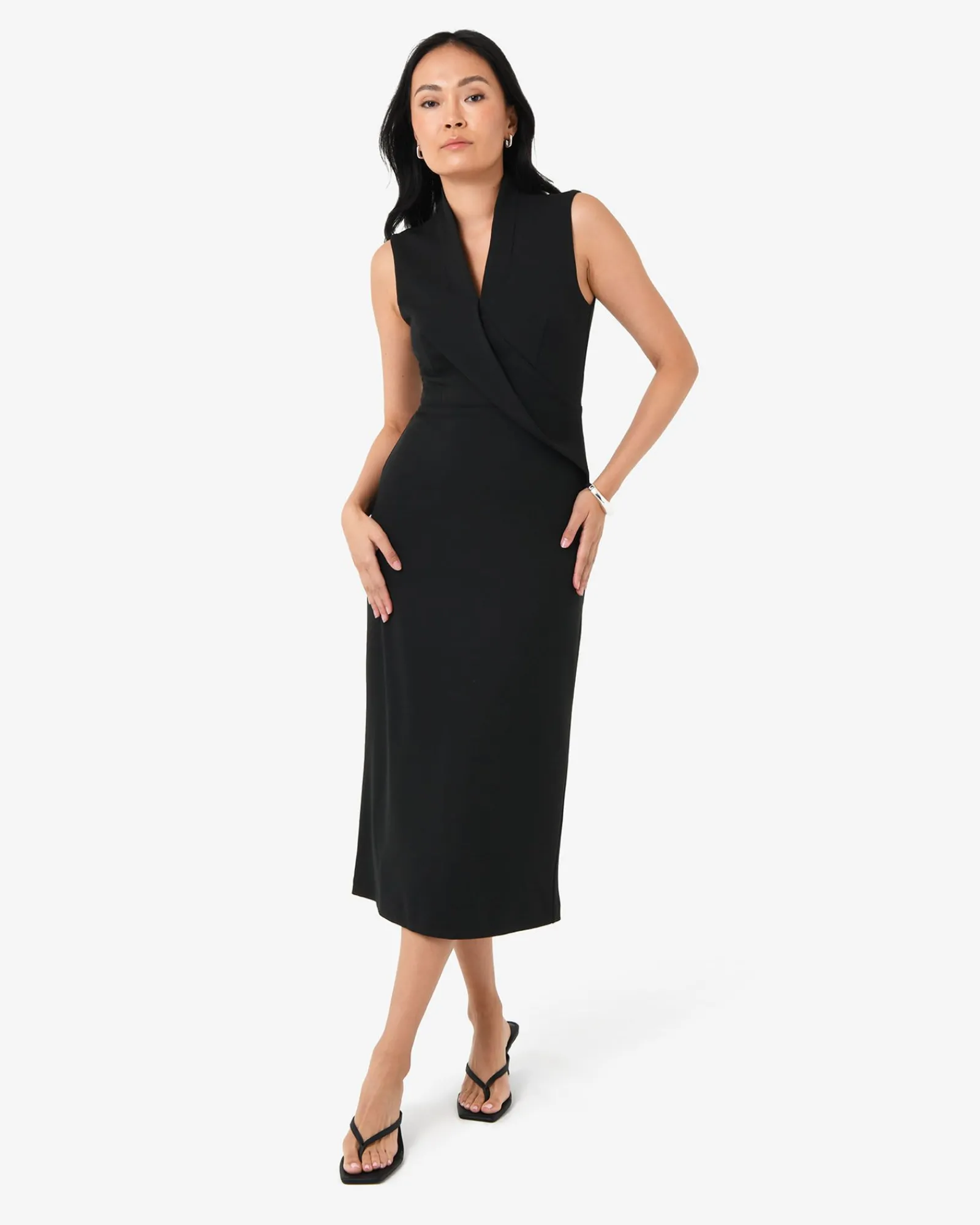 Modern and thoughtfully designed, the Alaia Twist Lapel Midi Dress features a v-neckline with twisted lapel and a clean, sleeveless cut. Perfect for weddings, work events, or anytime you want to feel unstoppable.