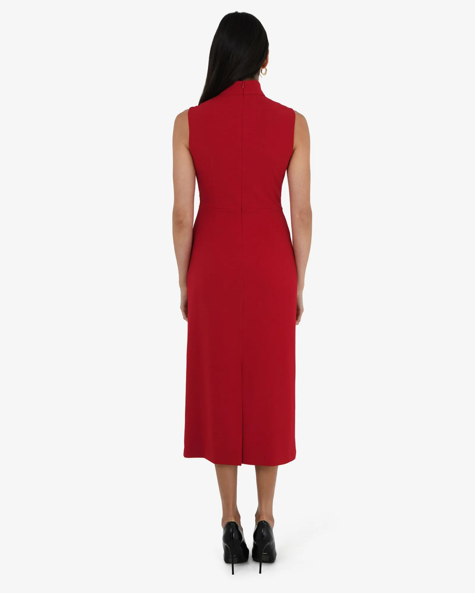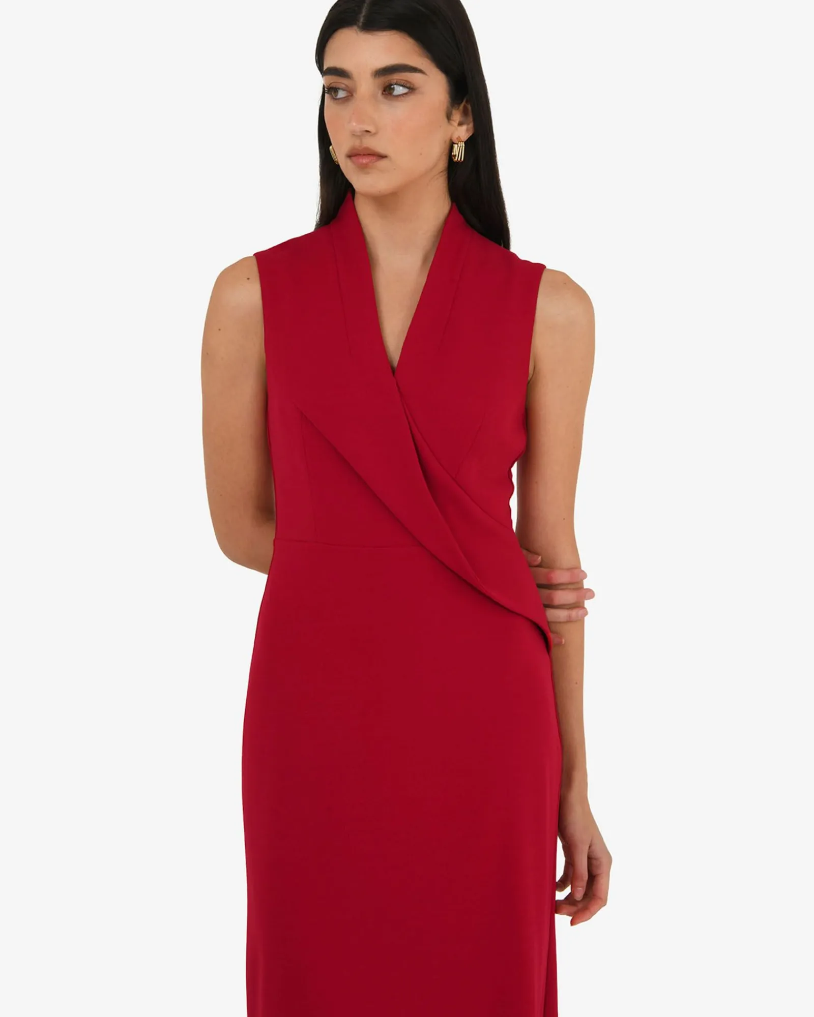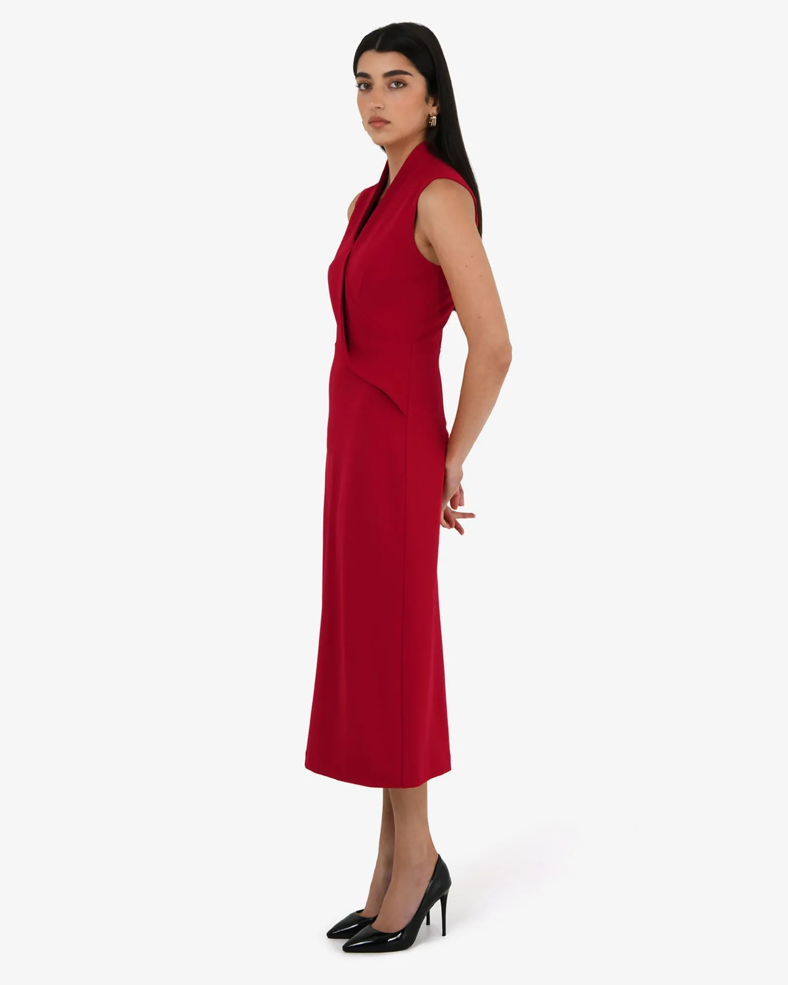 Modern and thoughtfully designed, the Alaia Twist Lapel Midi Dress features a v-neckline with twisted lapel and a clean, sleeveless cut. Perfect for weddings, work events, or anytime you want to feel unstoppable.