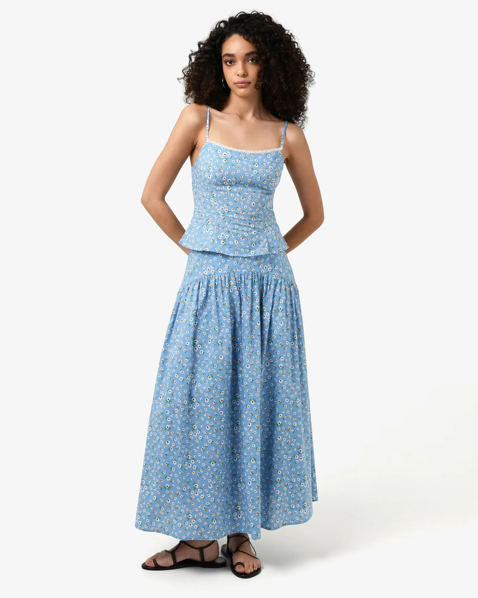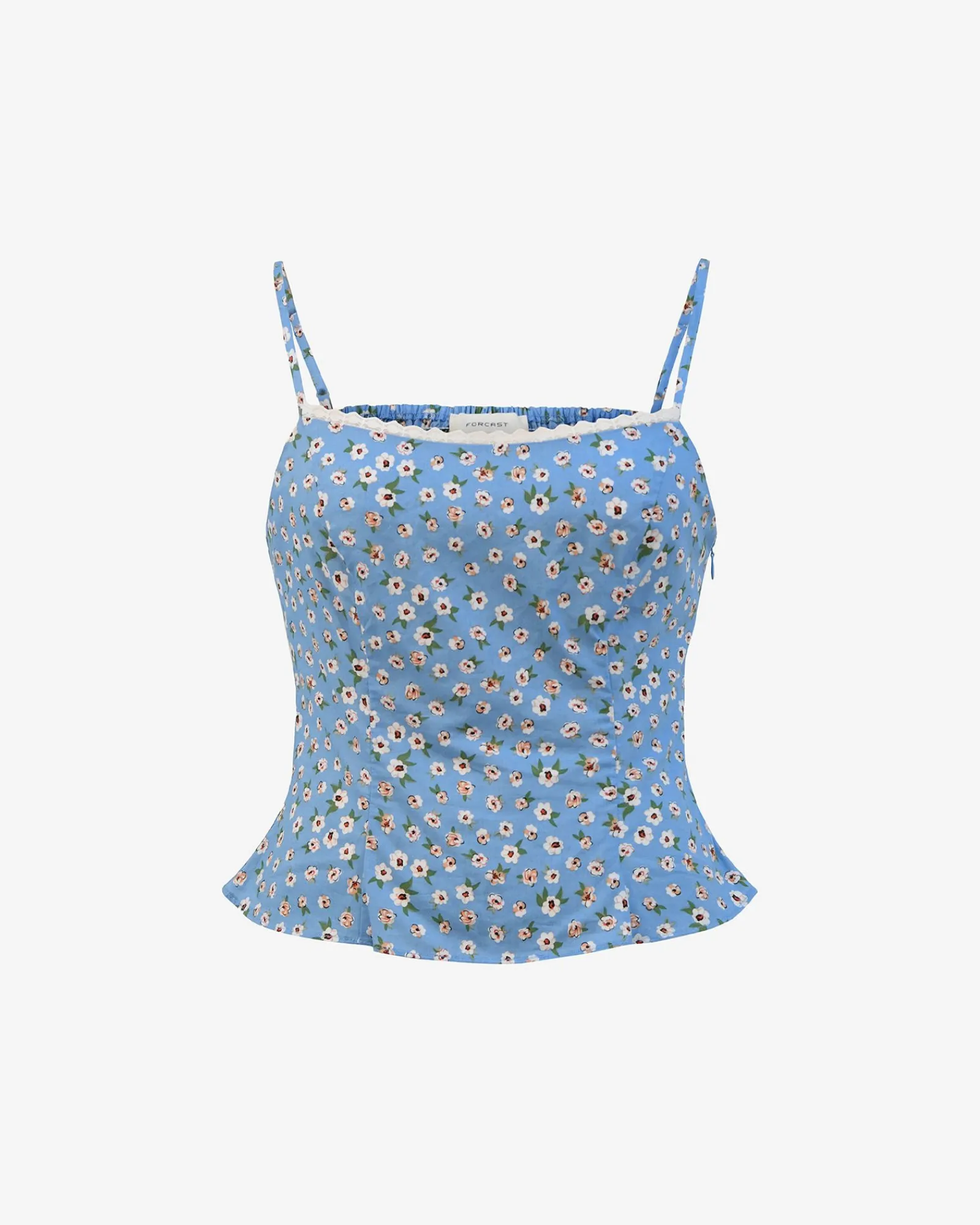 The Alisa Cami Floral Top features a fitted bodice with adjustable spaghetti straps. Made from 100% cotton, this top is designed with a flute hem, delicate lace trim and a ditzy floral print. Pairs it with the matching Alisa Gathered Skirt or style it with denim and mini skirts.