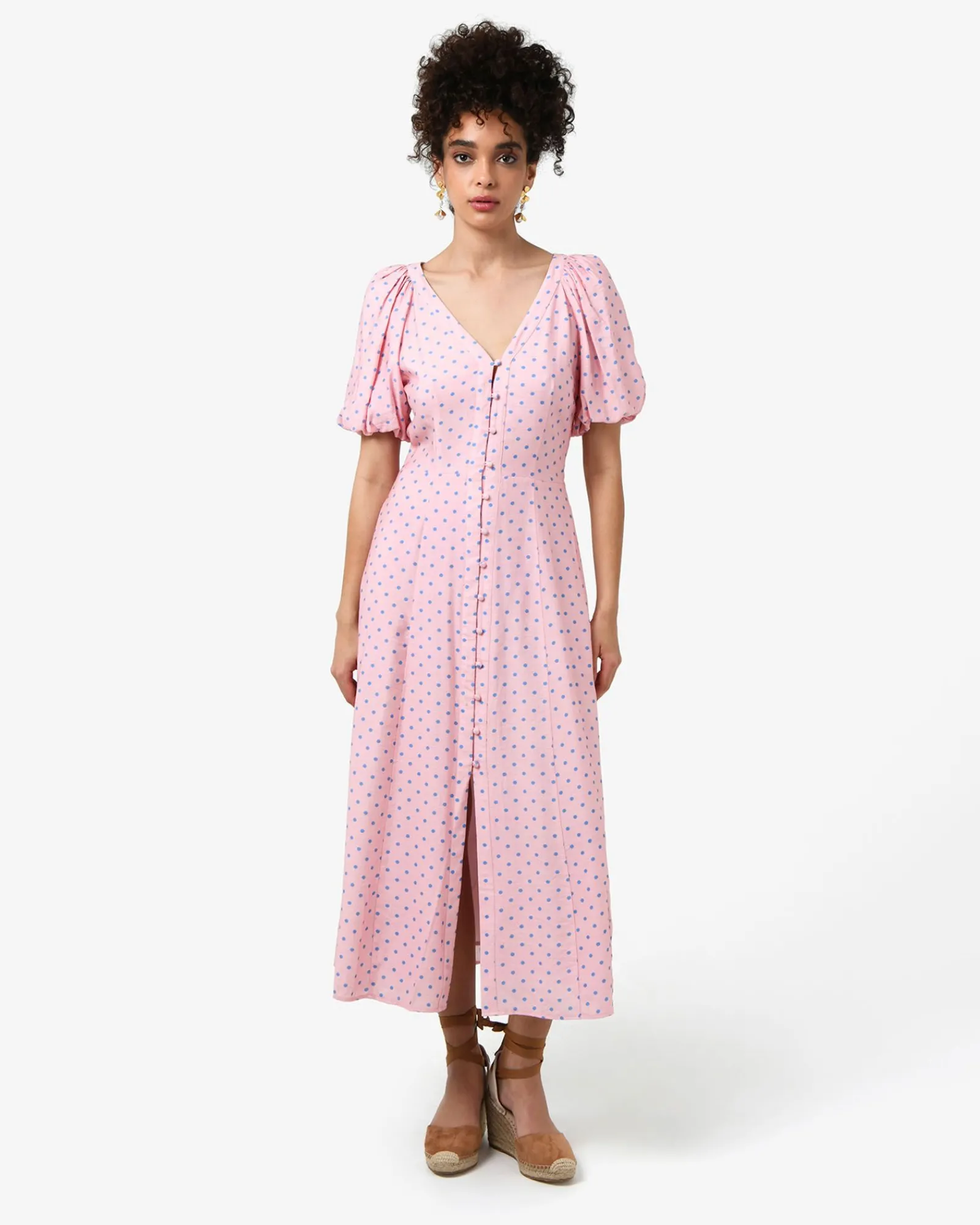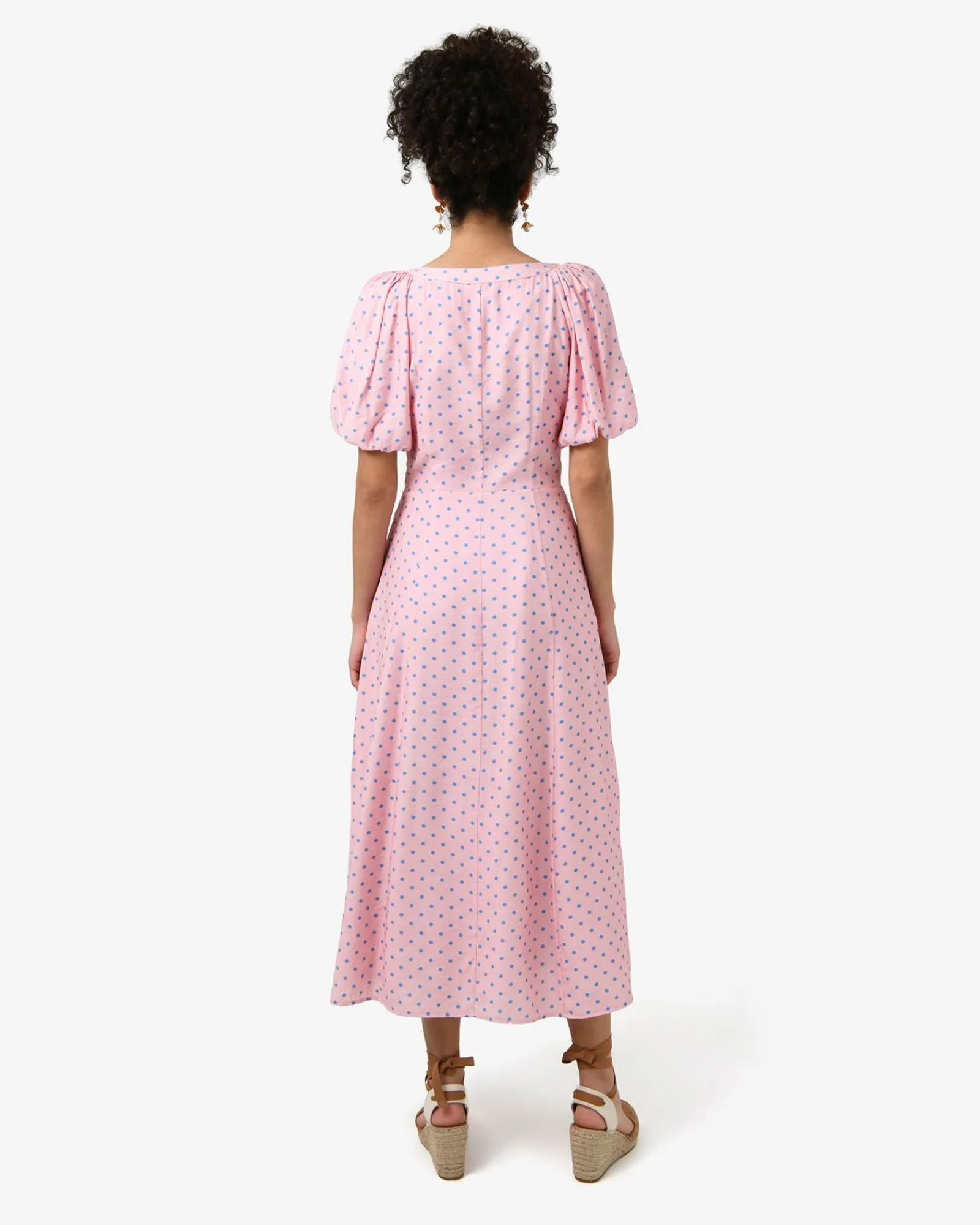 The Almeria Polka Dot Dress is a Spring piece that features a playful polka dot pattern, a V-neckline, puff short sleeves and functional side pockets. Fully lined and cut to a midi length, it can be accessorised with statement accessories to complete the look.